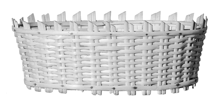 KORG (blomster-) Av vide, ofärgat. Oval, något avsmalnande nedåt. Stommen med dubbla kluvna stakar, med övre ändarna snett avskurna och uppskjutande över övre kanten; inslag av skenor, flätade i sicksack mellan stakparen, upptill och nedtill en utanpå stakarna liggande fastspikad list, den övre vid en på insidan liggande rundstavig bygel, den nedre vid botten, som består av en hel furuskiva. Höjd: 11 cm.; längd: 30,5 cm.; bredd: 18,8 cm.