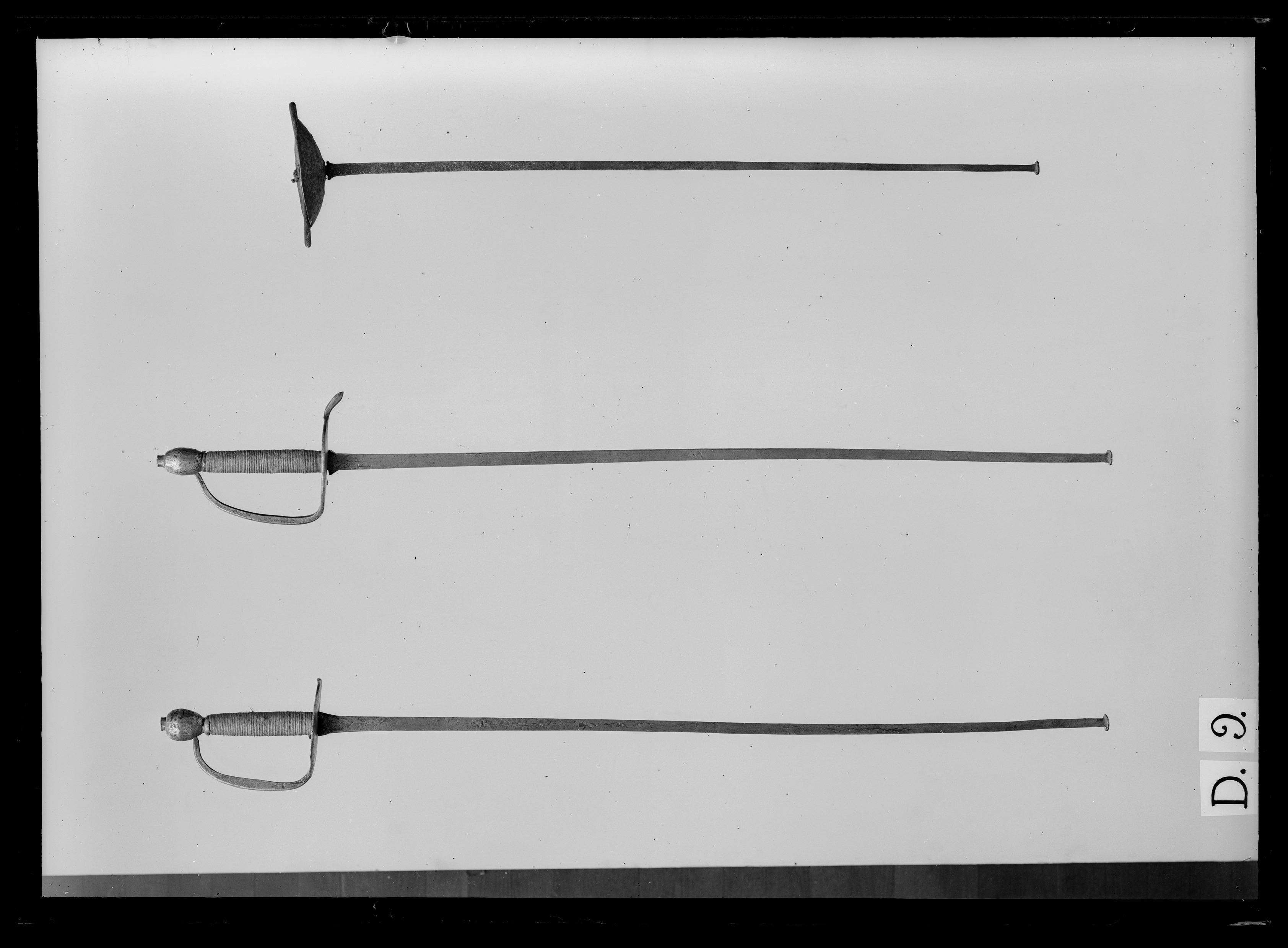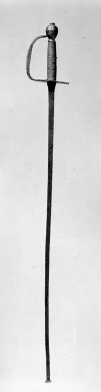 Fäste av stål, ytan obearbetad. Knapp avlångt päronformig, nitknapp plan. Parerplåt plan, rund, kanten ojämn. Handbygel med rektangulärt tvärsnitt, intappad i knappen. Kavel med rundovalt tvärsnitt av trä med lindning av ofärgat segelgarn. Klinga grovt utsmidd utan eggslipning. Tvärsnittet rektangulärt, baspartiet något vidgat. Klingans ytterände utsmidd till en tvärställd, plan knapp. Fästet återgående på kommissvärja m: 1685. Enligt ej dokumenterad uppgift har värjan tillhört Karl XII som ung.