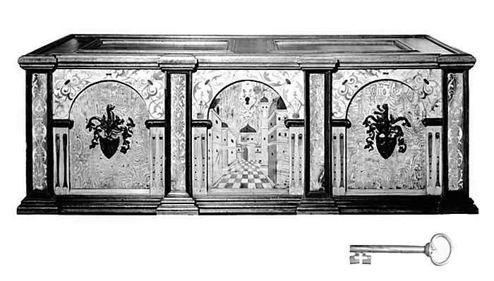 - I ek och ask med flere träslag samt med beslag af järn. Aflång, med raka former samt plant fallock. Fanerad, delvis med inläggningar samt dels polerad, dels bonad. Lock med smalt utsprång, ram och två fyllningar, hvardera fyllningen omgifven af en något utstående profilerad list. Kring ytterkanten en pålagd bred platt list med yttre kanten stafformig, den inre profilerad, därunder en utstående list med nedåt inåtfallande profiler, nedre kanten gående utanpå kistan, båda listerna å framsidan med fyra förkroppningar. Kistan å framsidan indelad i tre blindarkader, hvarje med hvalfvet uppburet af två pelare med joniska kapitäl. I mellersta arkaden synlig en del af en byggnadskomplex i ljust med mörka tak och små mörka fönster, listverk och gördelgesimser i ljust med ljusare kanter; i midten en plan, rutad i mörkt och ljust, i fonden en portbyggnad med kupoltak samt mörk port. I hvardera sidoarkaden i pålagd relief af mörkt trä mot botten i askrot ett vapen i hjärtformig sköld under hjälm med hjälmprydnad (orig.8/i): Pelarna i ljust, å hvarje i något mörkare trä två uppåtvända låtpipor (spelapipor), kapitälet i mörkt; ofvanför å hvalfven i hvartdera hörnet i mörkt mot ljus botten ett diagonalt ställdt, symmetriskt, X-liknande bladornament med groft midtband, ornamenten i midtfaltet uppväxande från en mörk bukig kruka, stående på kapitälen. Mellan fälten samt vid hvardera yttersidan en pilaster, hvarå i ljust mot mörk botten uppåtriktade symmetriska bladornament, de å de båda mellersta pilastrarna utgående från en smal stam, kring kanterna å alla pilastrarna en starkt utstående profilerad list i mörkt med inåtfallande profiler. Kortsidor hvardera med ramar och fem fyllningar, i midten en liten, liggande rektangulär, omgifven af fyra dylika större, hvarje af de senare med inre hörnet intaget för den förstnämnda; kring ramarnas inkanter en något utstående profilerad list. Nedtill kring kistan å såväl fram- som kortsidorna ett utstående listverk med för-kroppningar vid pilastrarna. Baksida af furu, ofanerad. Beslag: Å framsidan i mellersta fältet en förtent nyckelskylt, stående aflång, genombruten, med pressad ornering och konturerad kant; å kortsidorna ett förtent bågformigt handtag, i hvars midt en något utsvälld profilering, handtaget rörligt i två öglor, hvardera gående genom en rosettformig bricka samt på insidan försedd med en fyr-uddig mutter med rund bricka. Locket med bladgångjärn, liggande på lockets insida och utanpå kistan, de förra jämnbreda, med snedt utåtfallande kanter samt aftunnade utåt, hvarderas ytterända afslutad i en konturerad utvidgning; bladen blåanlöpta och fästa med skrufvar med kullriga hufvuden; de å kistan liggande bladen afsmalnande utåt från kanterna samt fasta med spikar. Mellan gångjärnsbladen å locket ett kors-formigt beslag med den bakåtriktade armens ytterända afslutad som gångjärnsbladen, å den tvärgående armens vänstra del en rektangulär låsögla. Inuti kistan å framsidan ett utanpåliggande bruneradt lås med snedkolf. Vid vänstra kortsidan en tvärgående låda (lädika) af furu, med fallock af ek, rörligt på två tappar samt med profilerad framkant. Å de å locket liggande gångjärnsbladen och å beslaget mellan dessa stämpel: Höjd: 0.68 m.; längd: 1.85 m.; bredd: 0.81 m. Nyckel (original): Af järn, med oval ögla, hvari en inskjutande spetsig flik; upptill å pipan en grof fiäns. Längd: 14 cm.; bredd: 4.5 cm. Tyskt arbete från 1600-talets förra hälft. Inköpt af Wilhelmina von Hallwyl, f. Kempe, 26 April 1888 hos antikvitetshandlaren Ed. Kahlert, n. d. kaiserl. Post, Eisenach, Tyskland, vid hennes vistelse i nämnda stad tillsammans med fröken Ida Uhse 26—28 April 1888 under deras resa till Rom och Neapel, genom södra Italien och Sicilien samt åter öfver Schweiz tillsammans med Wilhelmina von Hallwyls make, Walther von Hallwyl, hennes mor, Johanna Kempe, f. Wallis, och dottern Irma samt fröken Caroline Pflaum 28 Januari—11 Maj 1888. Förestående uppgifter lämnade med ledning af fröken Ida Uhses Reseanteckningar. Pris: Mk 90. Reparerad hos snickaren C. H. Benckert J:r, Regeringsgatan 63, Stockholm, se räkning 30 Oktober 1888. Betaldt 21 November 1888, se Rescontra (Walther von Hallwyl). Pris: Kr. 280, se räkning.