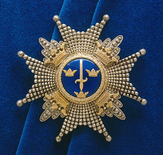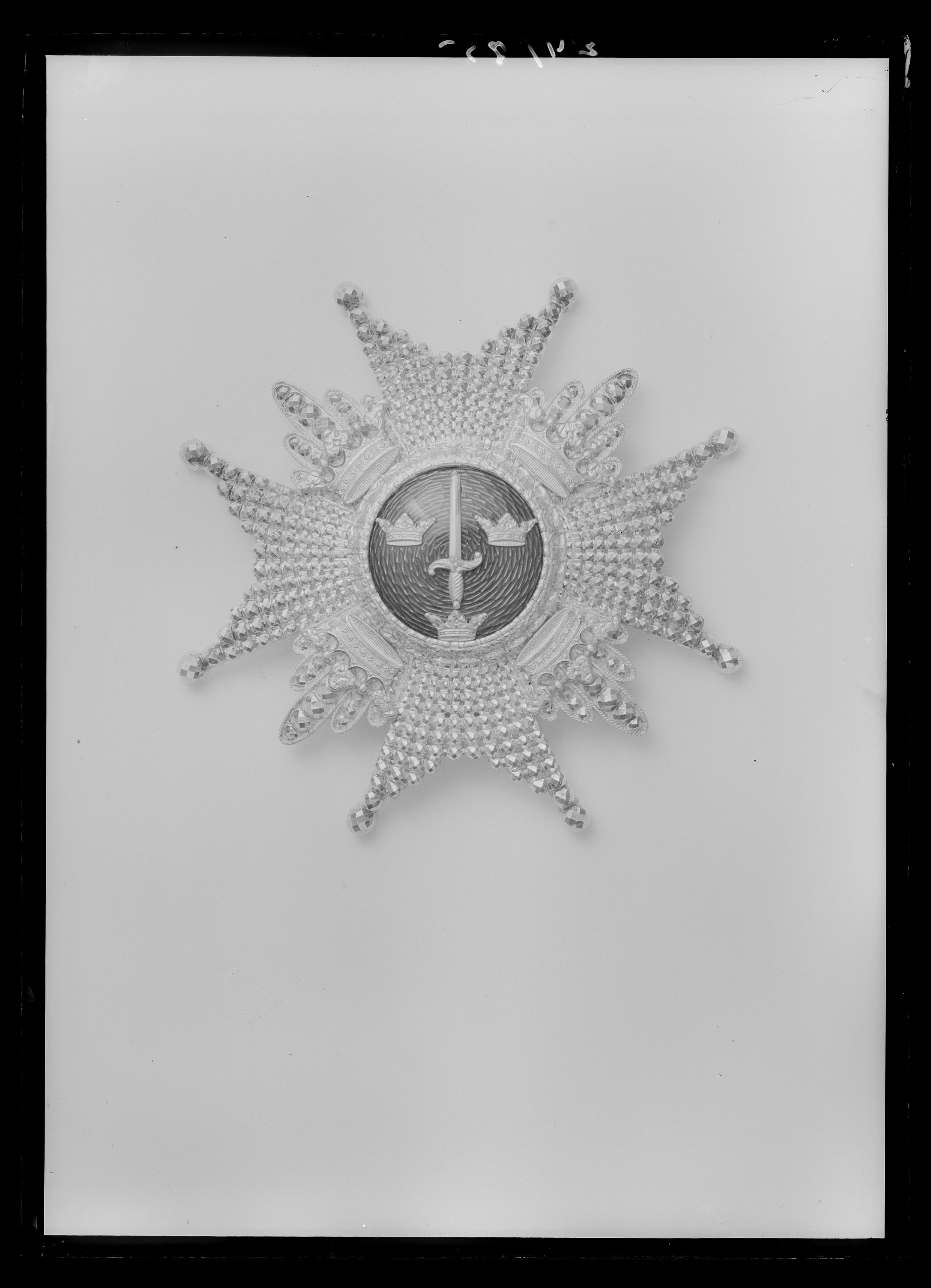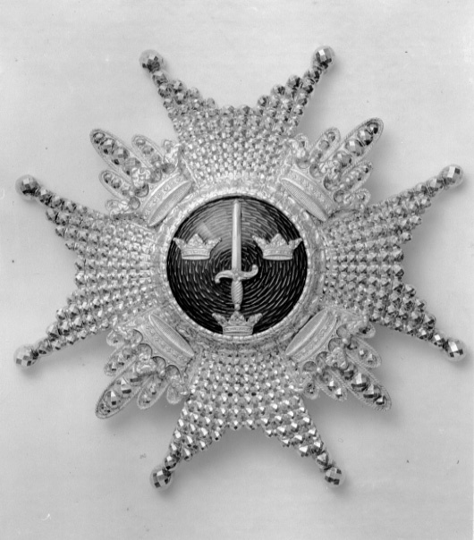 Svärdsordens storkorskraschan. Flinkerat malteserkors av silver, mellan korsarmarna fem flinkerade strålar av olika längd, därpå öppna kronor av guld, fastskruvade med runda muttrar på baksidan. Blåemaljerad, välvd medaljong, därpå av guld svärd och tre kronor, kantring i form av bladkrans av guld. Baksidan slät, vertikalt placerad säkerhetsnål.