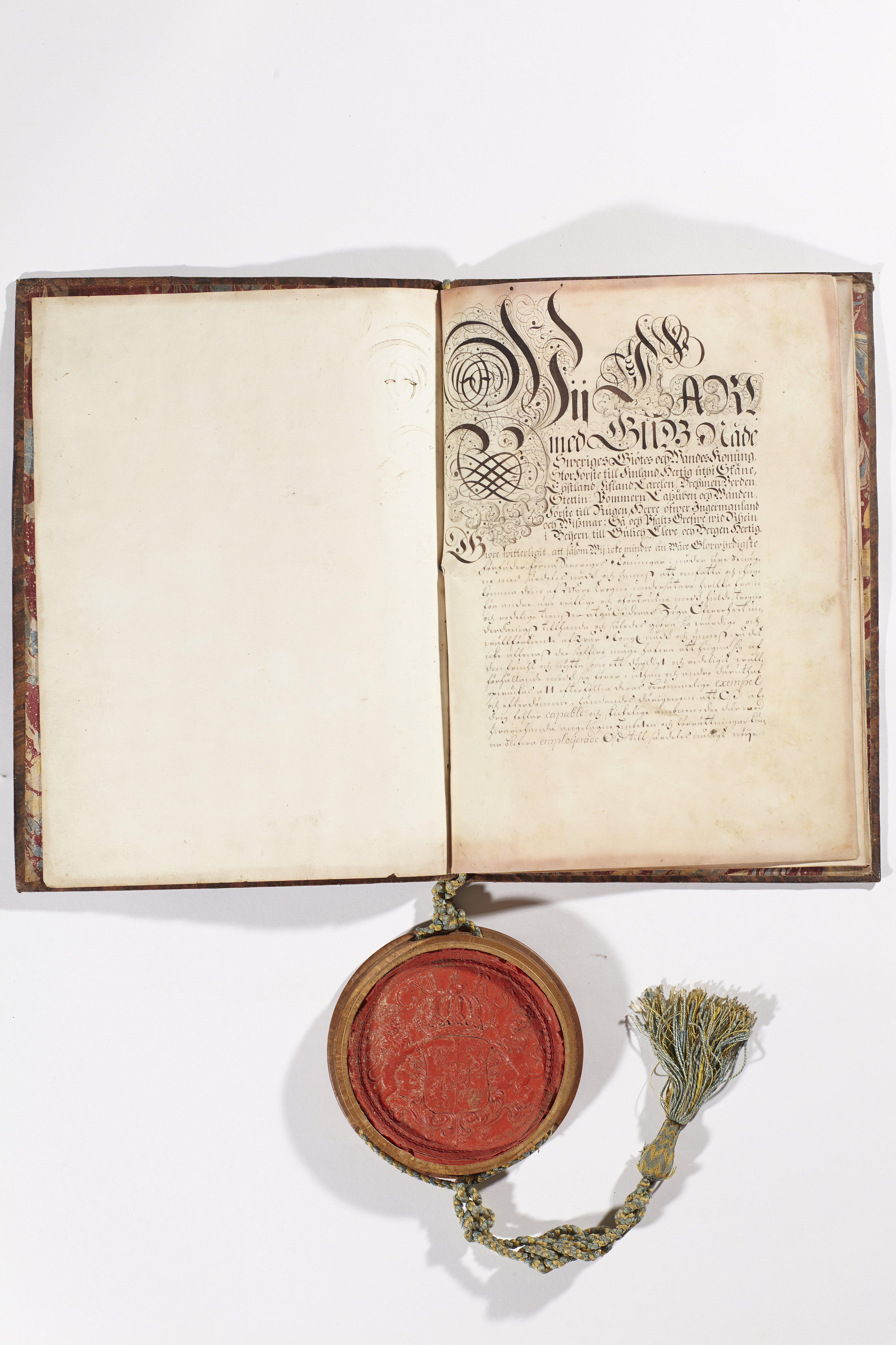 Signerat "3 december 1697 Carolus". 7 sidor manuskript på pergament. På sida 5 kolorerad bild av adelsvapnet. Kalvskinnsband med guldtryckt dekor. På fram- och bakpärmen Karl XII:s monogram. Marmorerat papper på fram- och bakpärmens insida. Vid brevet fäst rött lacksigill med svenska riksvapnet. Sigillet i svarvad dosa av masurbjörk. Vid dosan fäst blå och gul snodd av lintråd. Snodden håller samman sigillet med pärmens rygg och avslutas med dekor av snörmakeri samt tofs.