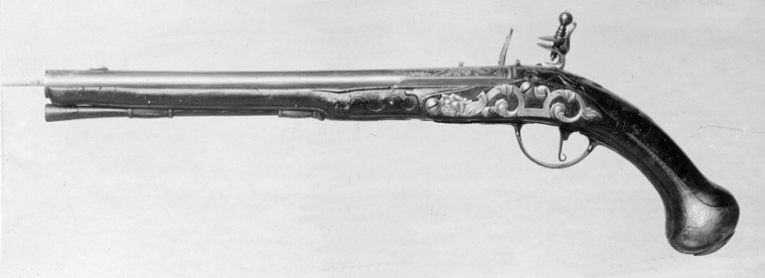 Rund, slätborrad, blånerad pipa av stål med påslagen gulddekor. På kammarens ovansida dekor i form av trofégrupp och rankor. Profilerad, kantig pipbas, rektangulärt, bakåt något breddat svansskruvblad med bladranka. På pipans ovansida en plan spång med blom- och bladranka, spången spetsig i båda ändar. Vid mynningen en större blomranka. Runt mynningen en krans av femton blommor av påslaget guld. Mässingsfodrat fänghål. Riktmedel: Vid pipbasen ståndsikte med förgylld ovansida. I spången framtill inlaxat ett spolformigt korn av förgyllt silver (?). Fästning: Två häften. Pipan fäst med krysskruv med välvt, förgyllt huvud, bakre låsskruven genom svansskruvplattan samt ett pipstift av stål. Flintlås av stål med plant låsbleck, fasade kanter och profilerad, något försänkt bakspets, tvärgående, profilerat band. Graverad dekor, trofégrupp med sittande fånge mot försänkt, mörkpunsad bakgrund. Mellan batterifjäderns armar graverad signatur: "Jo: Ad: MercKle: a CarlsBadt". S-formig, platt hane dekorerad som låsblecket, hjärtformiga käkar, överkäken lös och blånerad, käkskruv med stort, kulformigt huvud. Fasetterad fängpanna med bred, rundad fals. Batteri med fasetterat lock och eldstål med rundad överände, på ryggen ett försänkt fält med en droppformig figur, graverade dubbla linjer, sicksackbårder, fot med fasade kanter, c-formig häl. Batterifjäder med långt, flikigt fjäderlöv. Fästning: Två låsskruvar. Avtryckare med upprullad ände, förgylld framsida. Konturerat avtryckarbleck. Helstock av brunflammig rot (valnöt?), snidad dekor runt svansskruvbladet samt på framstockens sidor mellan lås och spetsrörka. Beslag av blånerat stål med påslagen gulddekor. Kolvkappa med långa flikar och oval centrumplatta, dekor i form av trofégrupp och kvinnofigur med fladdrande banér. På kolvkappans sidor trofégrupper, på låssidan en sittande kvinnofigur med palmkvist och lur, på motsatt sida krigare med sabel. Längs kanten och på flikarna bladrankor. Konturerad tumplåt med dekor i form av en öppen krona, örn med spira i strid med tupp, två bardisaner och två pukor. Oblånerat sidbleck i form av ett band med blad i stålsnitt, vid främre låsskruvhålet ett drakhuvud i stålsnitt. En + en kantig rörka, slät spets, blom- och bladrankor. Varbygel med svagt rombiskbygel, välvd främre arm med på mitten insvängda sidor, avslutning i form av ett treflikigt blad. På avtryckarbleck, bygel och främre arm blom-och bladrankor. På bygeln dessutom en putto med ymnighetshorn. På bakre armen en hillebard omgiven av två fanor, vid bakstolpen graverat: "No 4".