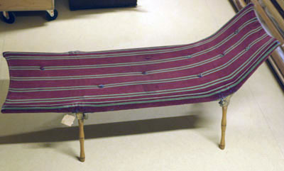 Hopfällbar tältsäng med översida av rött ylletyg med gröna ränder och nio påsydda knoppar. Blått tyg som foder och grön-svart grovt linne på sängens undersida. Själva dynan fastnitad i en ram av trä, målad gul, med fyra svarvade ben ca 365mm höga. I båda ändar en böjd gulbemålad tvärslå av järn för att låsa sängen i rätt läge. Ställning av stål målad gul. På metallställningen en brännstämpel av Karl CV:s monogram.
