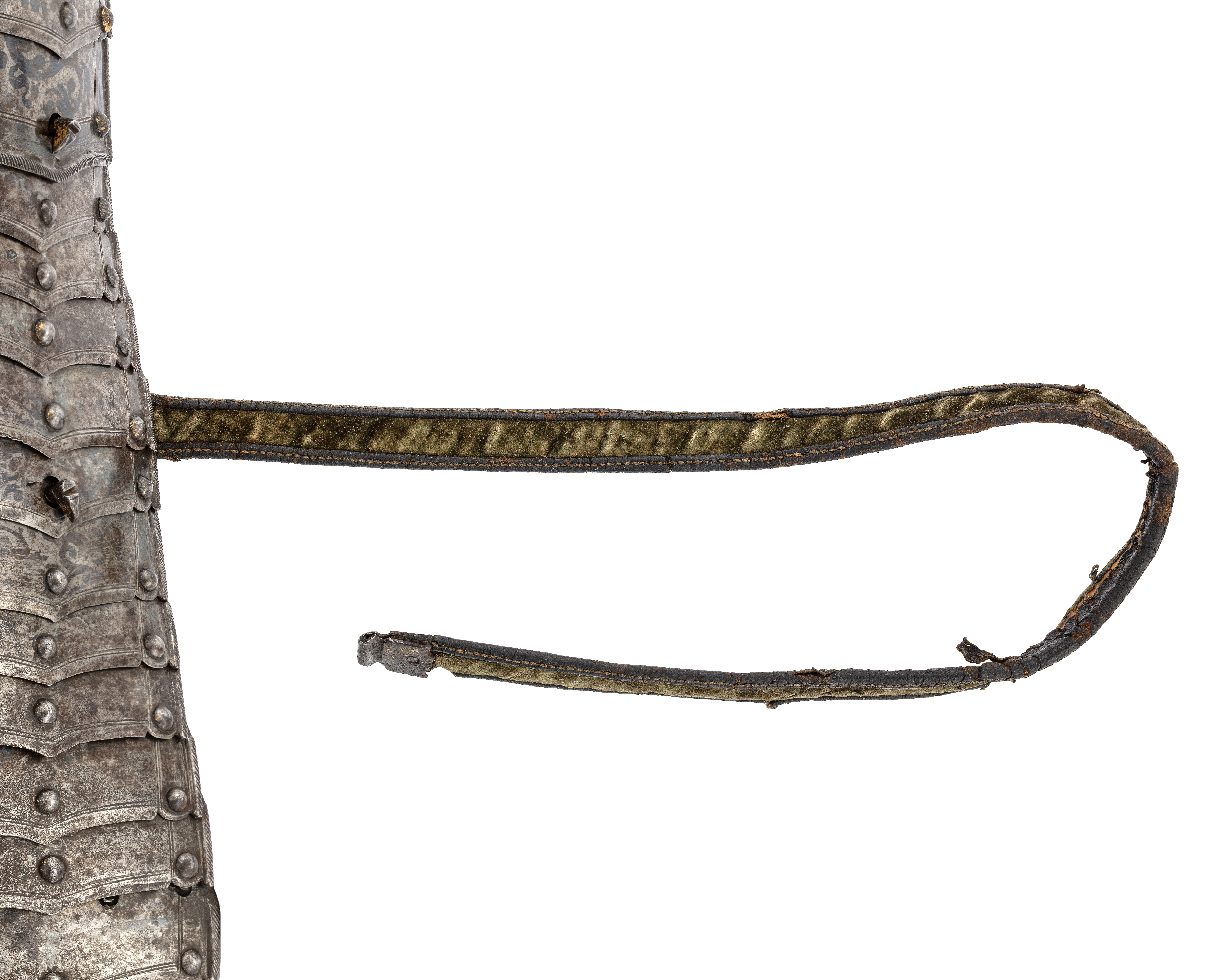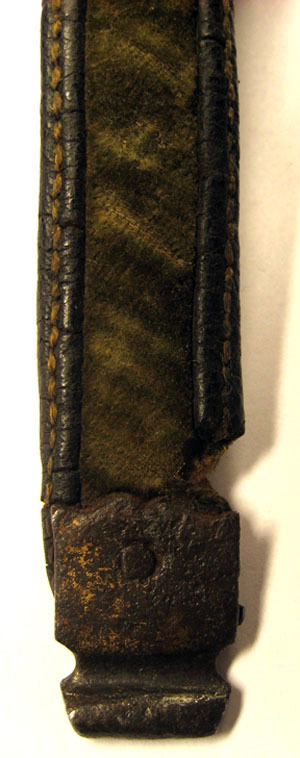 Rem av mörkbrunt läder, på ovan- och undersida klädd med ljusgrön sammet. Kanterna uppvikta och ej klädda vilket bildar mörka bårder. I kanterna tydlig söm av gul tråd. Remmen fäster i sölja på motstående sida. Söljorna av stål med rester av förgyllning. Rektangulär ram med fasade kanter och skurna linjer, fästplattan rundad med upptill två små spetsar och fäst med med prickpunsad nit.