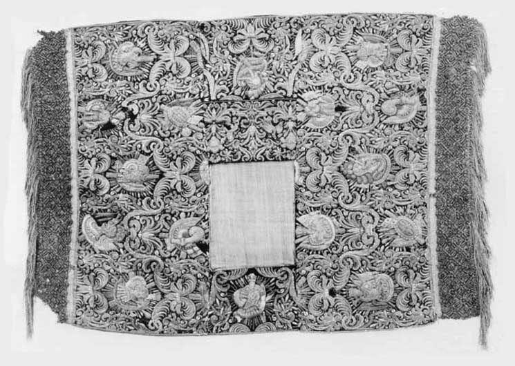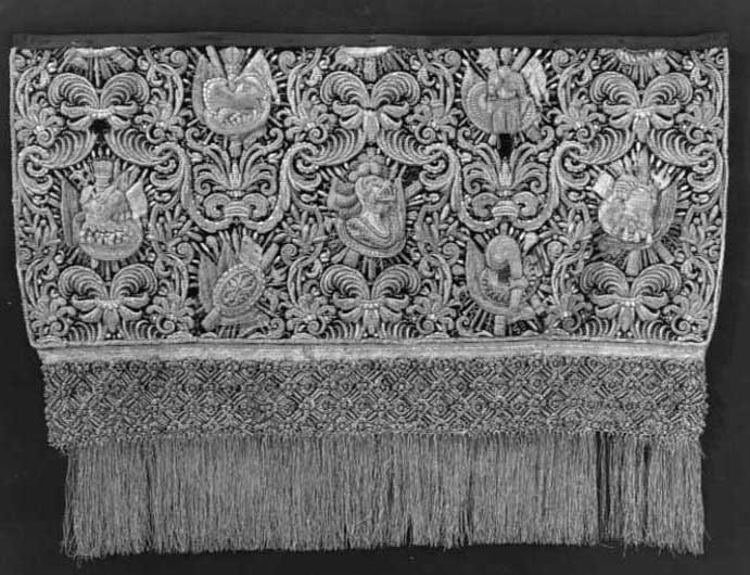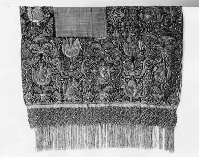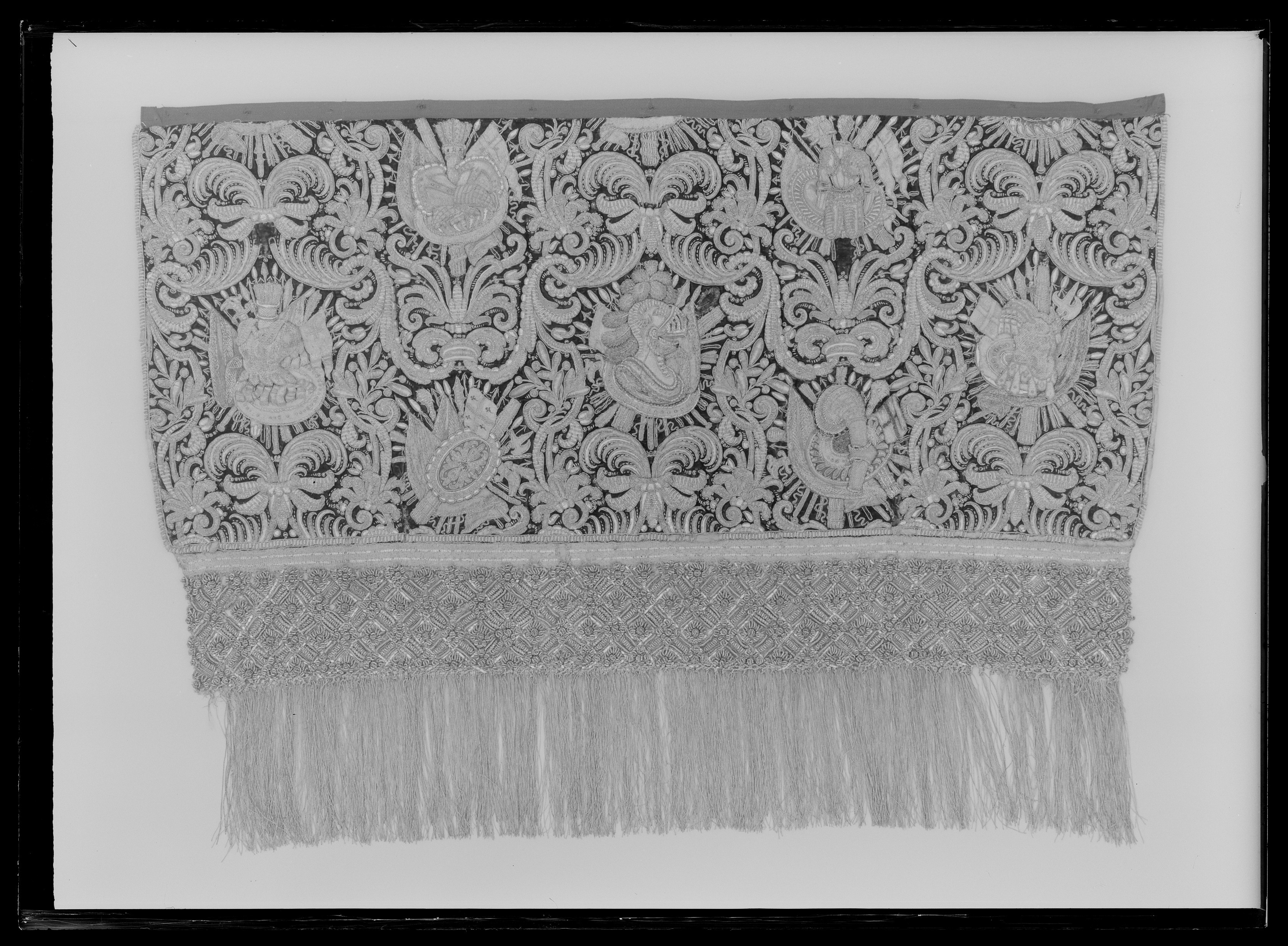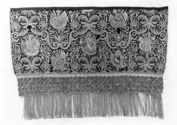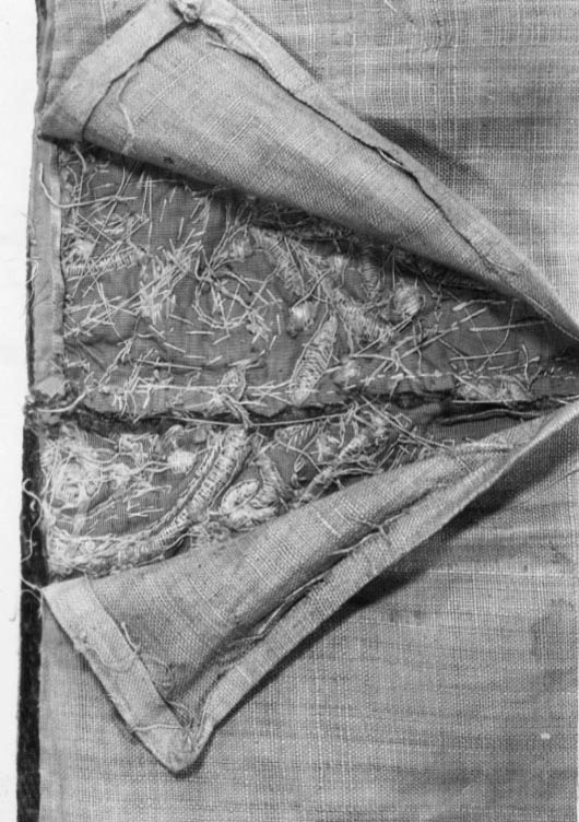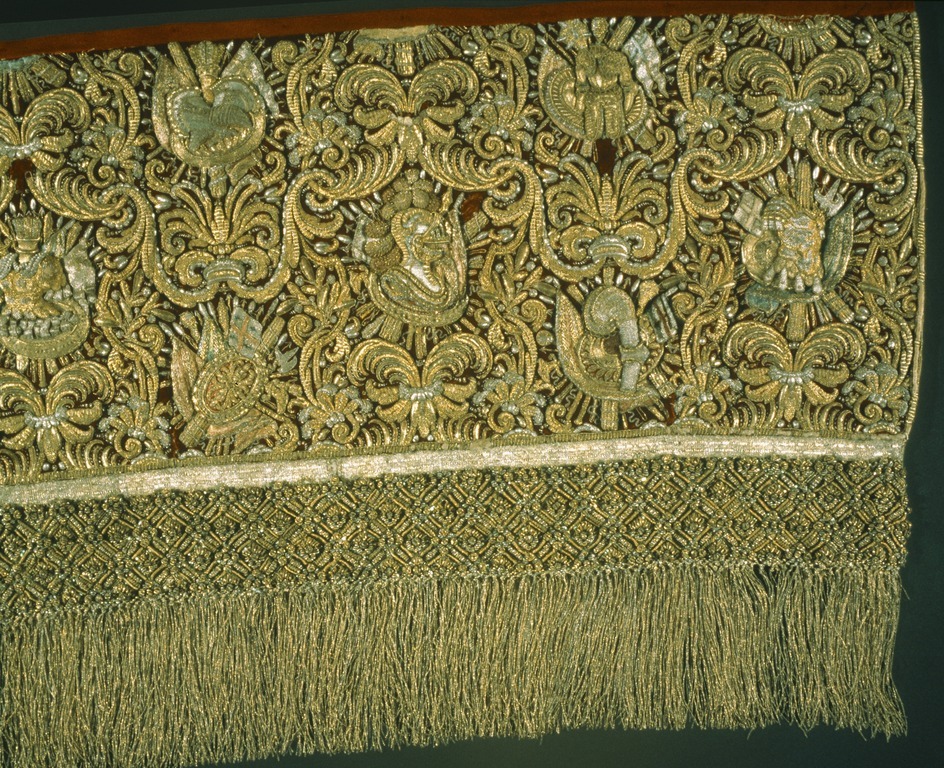 Bottentyg av röd sammet i kypert. Yttäckande applikationsbroderi i relief. Mönster av trofégrupper omramade av palmetter och olivkvistar. Längs kanterna en broderad snodd av plattare och rundare guldkantiljer. Broderi med tråd, lan, och kantiljer av guld och silver. I trofémotiven även silke i gult, grönt, blått, rött, rosa, vitt, beige och svart, några av trofémotiven på sidenbotten. Läggsöm och plattsöm. Lagerkvistar ej i applikation. Nedanför broderiet ett knutet snörmakeriarbete, makramé av guld och silver, 160 mm brett varav 25 mm stad med två stycken 2 mm breda silverlan. Rombiskt mönster där silverlan bildar rutorna. Nedanför snörmakeriarbetet en 180 mm bred frans av guld och silver. Foder av blekt, ursprungligen rött linne i tuskaft, som fortsätter 320 mm över överkanten. Vid broderiets överkant har sytts fast ett rött, 40 mm brett, grovt bomullsband. En hank av gråvitrandigt linneband i fodrets nedre vänstra hörn. I samband med Karl XIII:s kröning 1809 syddes de två utslagen samman till ett hästtäcke med broderade bitar gagna dels från karosstakets kappa, dels från drottning Kristinas röda kaross med motiv av lejon och örnar. I samband med Kristina-utställningen 1966 sprättades dessa bitar upp och de två utslagen återfick sin ursprungliga form.