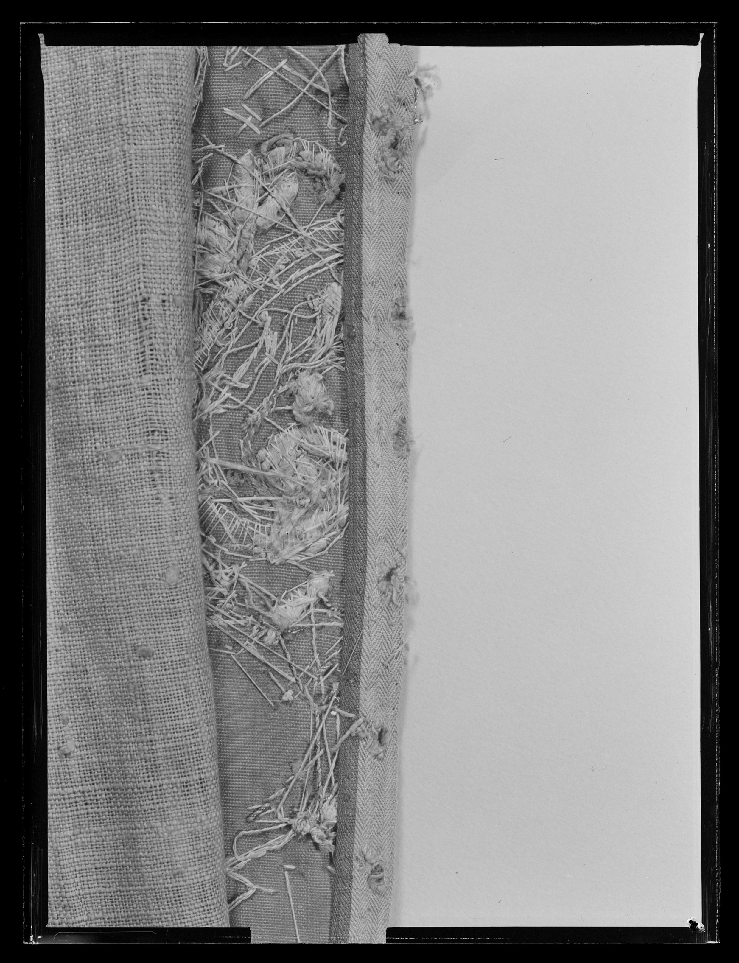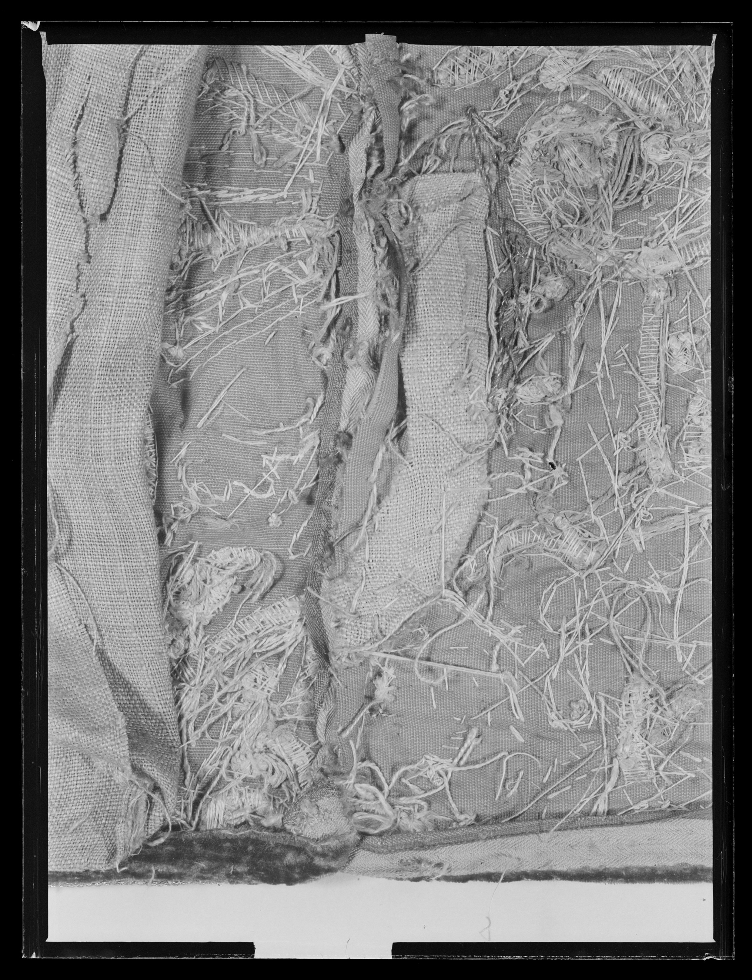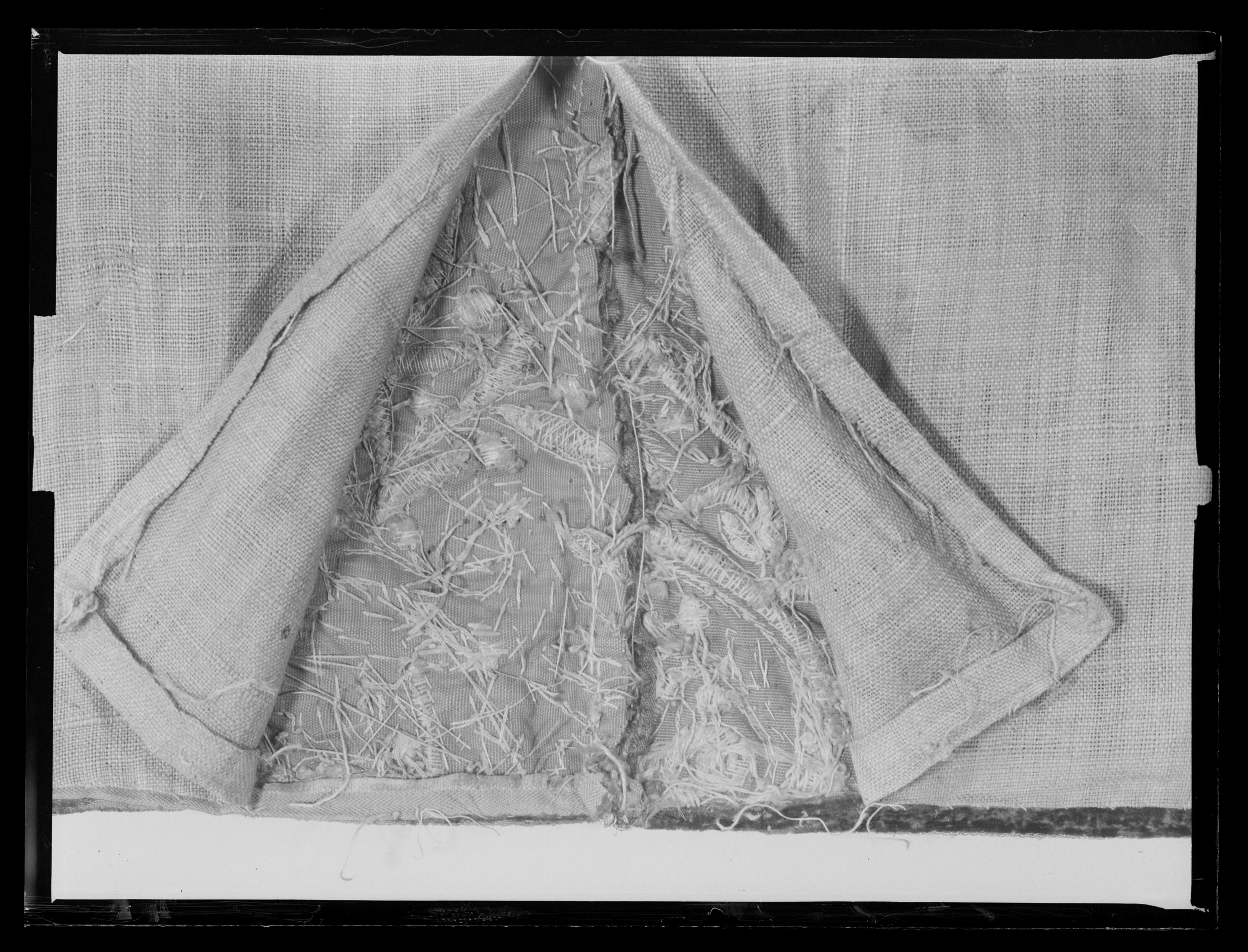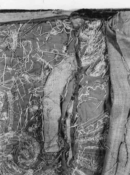 Bottentyg av röd sammet i kypert. Yttäckande applikationsbroderi i relief. Mönster av trofégrupper omramade av palmetter och olivkvistar. Längs kanterna en broderad snodd av plattare och rundare guldkantiljer. Broderi med tråd, lan, och kantiljer av guld och silver. I trofémotiven även silke i gult, grönt, blått, rött, rosa, vitt, beige och svart, några av trofémotiven på sidenbotten. Läggsöm och plattsöm. Lagerkvistar ej i applikation. Nedanför broderiet ett knutet snörmakeriarbete, makramé av guld och silver, 160 mm brett varav 25 mm stad med två stycken 2 mm breda silverlan. Rombiskt mönster där silverlan bildar rutorna. Nedanför snörmakeriarbetet en 180 mm bred frans av guld och silver. Foder av blekt, ursprungligen rött linne i tuskaft, som fortsätter 320 mm över överkanten. Vid broderiets överkant har sytts fast ett rött, 40 mm brett, grovt bomullsband. En hank av gråvitrandigt linneband i fodrets nedre vänstra hörn. I samband med Karl XIII:s kröning 1809 syddes de två utslagen samman till ett hästtäcke med broderade bitar gagna dels från karosstakets kappa, dels från drottning Kristinas röda kaross med motiv av lejon och örnar. I samband med Kristina-utställningen 1966 sprättades dessa bitar upp och de två utslagen återfick sin ursprungliga form.