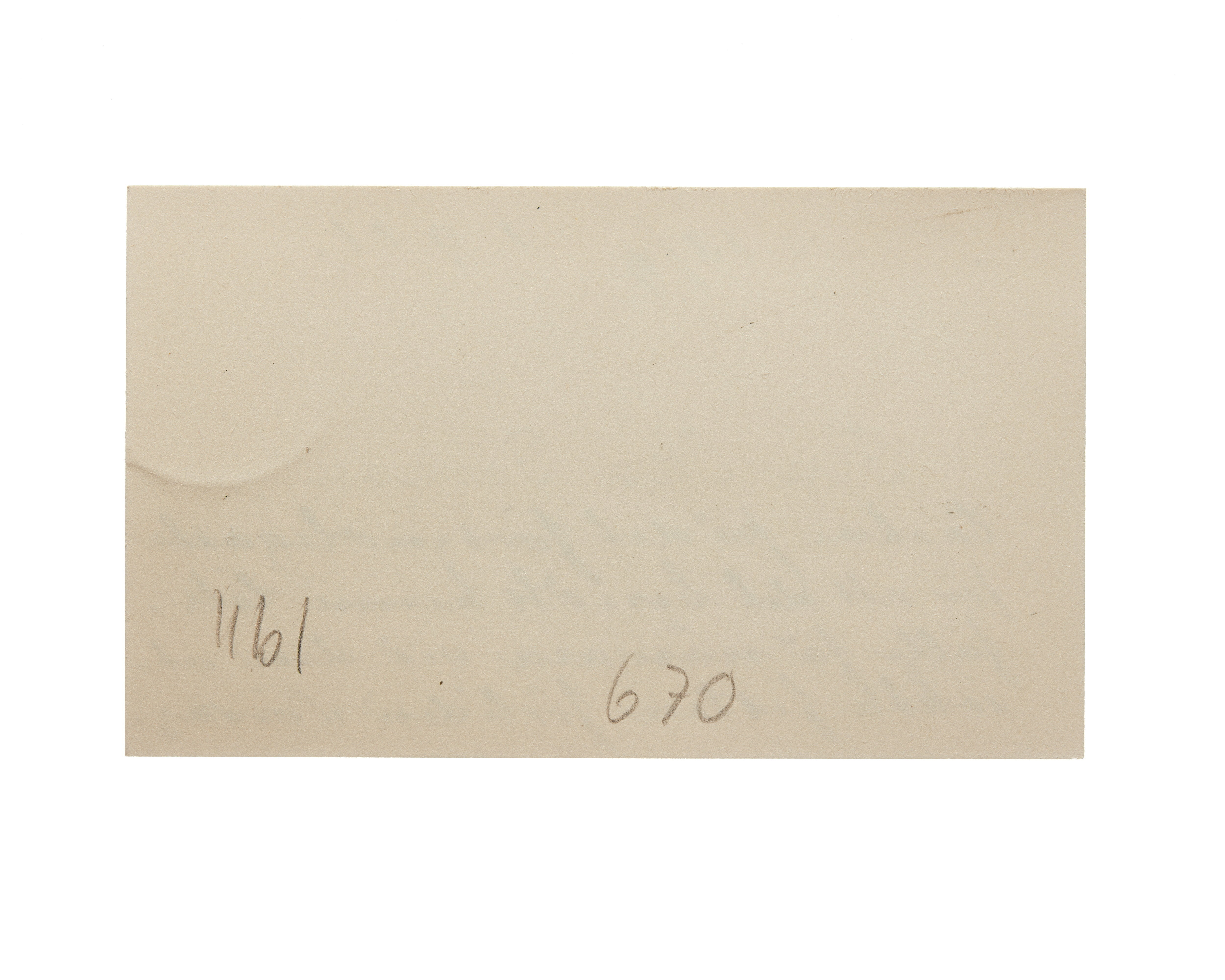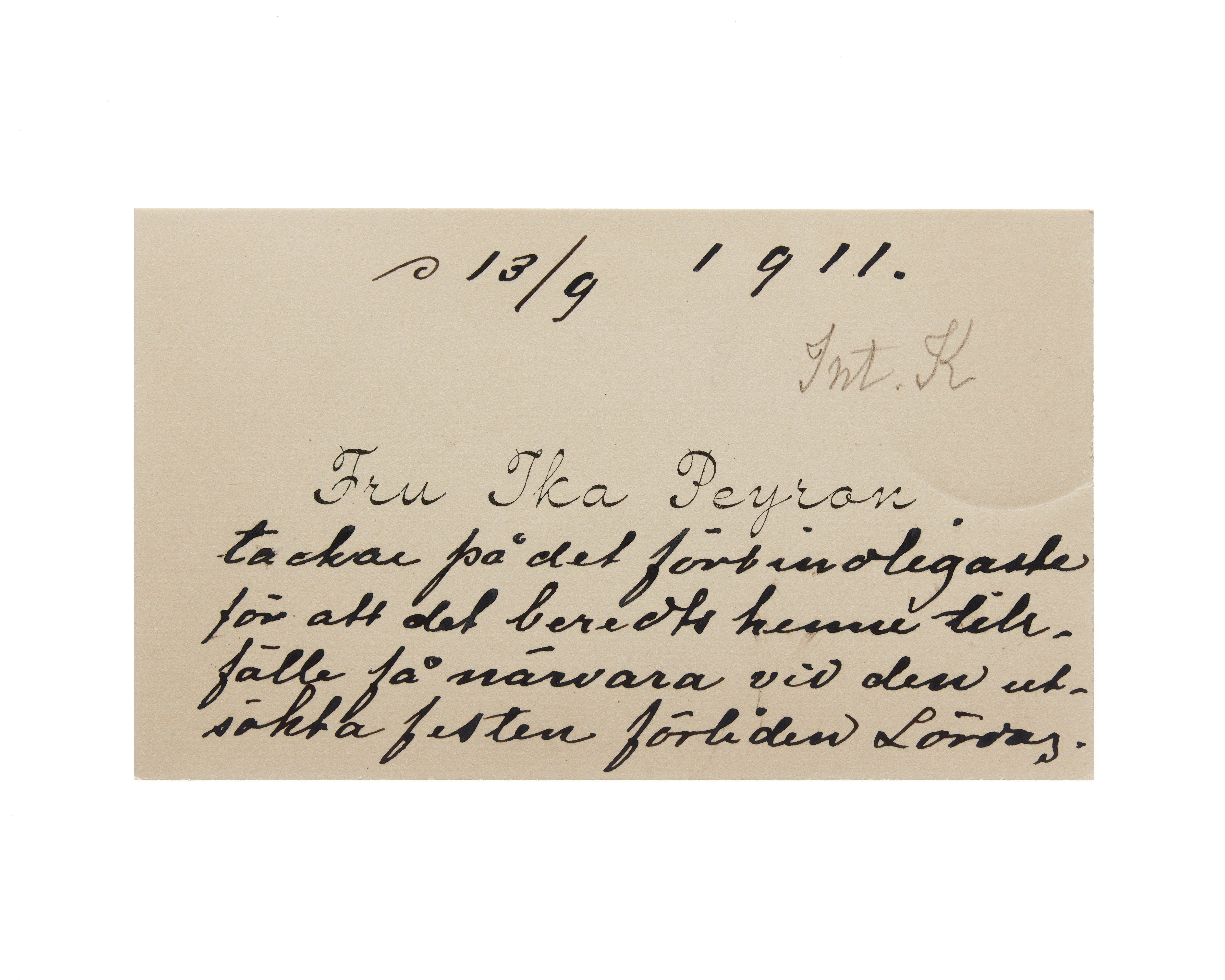 Ett visitkort från Ika Peyron, f. Asp, daterat 1911. Handskrift "...". Överlämnat i samband med Internationella kvinnoförbundets kongress i Stockholm 1911.