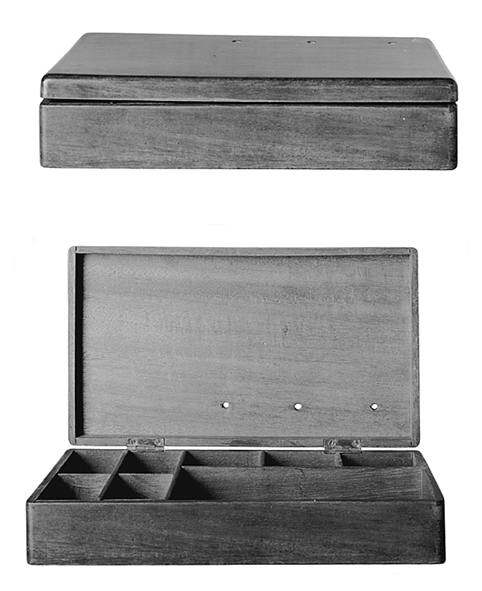 Frimärksskrin av mahogny, rektangulärt med lock och åtta fack.