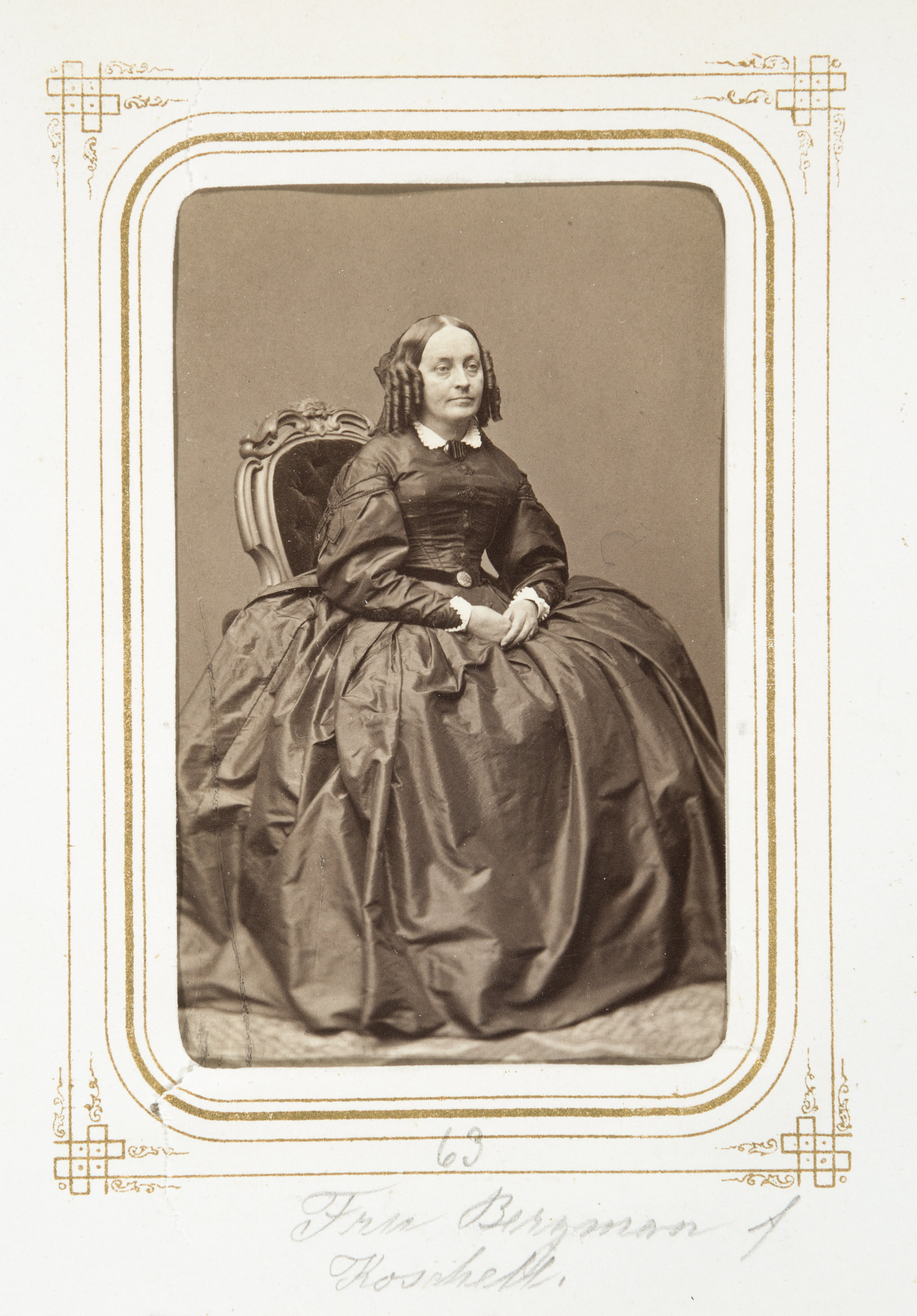 Biografi. Fotografiporträtt. 101 porträtt i album. Fru HILDA BERGMAN, f. KOSCHELL. Erhållet av Johanna Kempe, f. Wallis på 1860-talet. 26,5x20,7x4 cm.