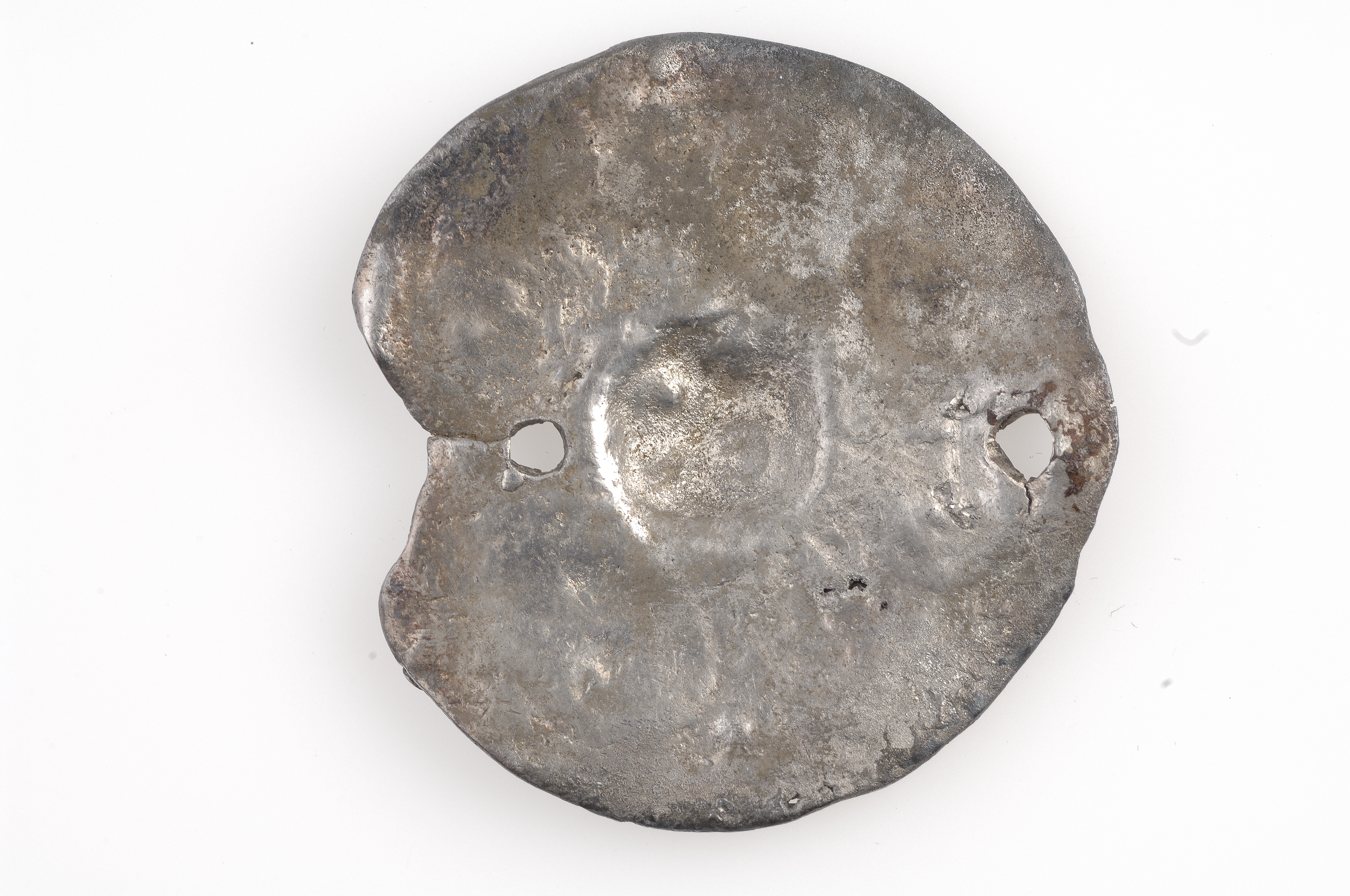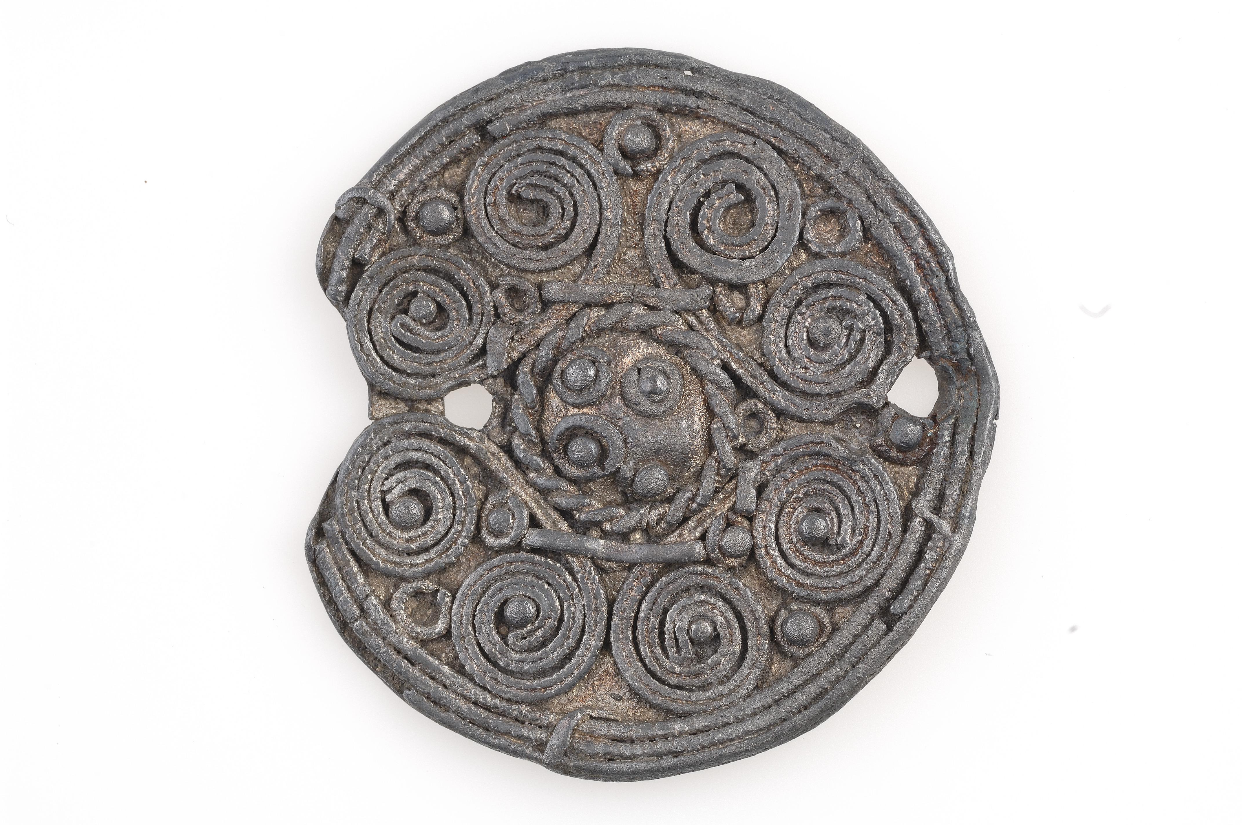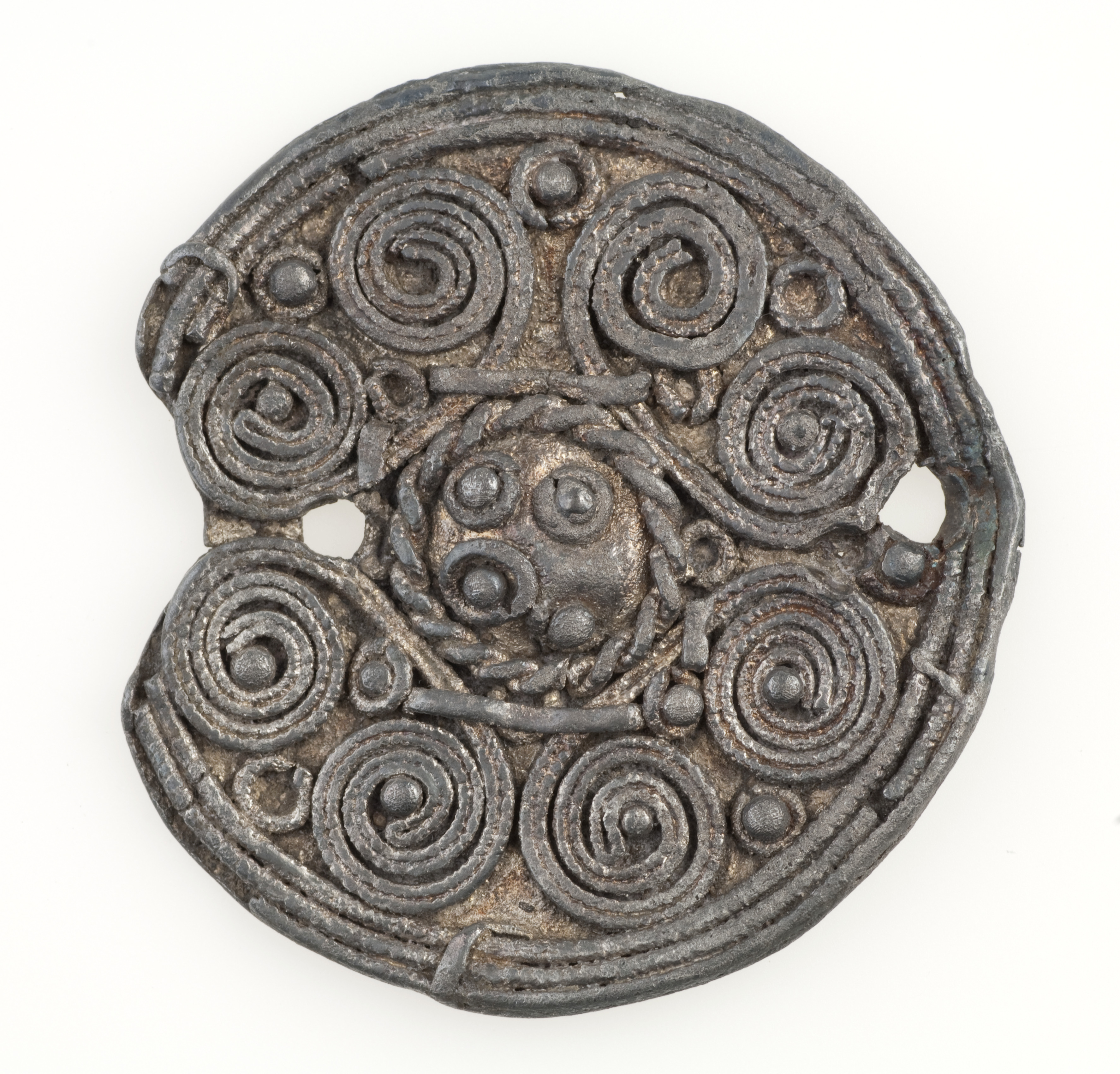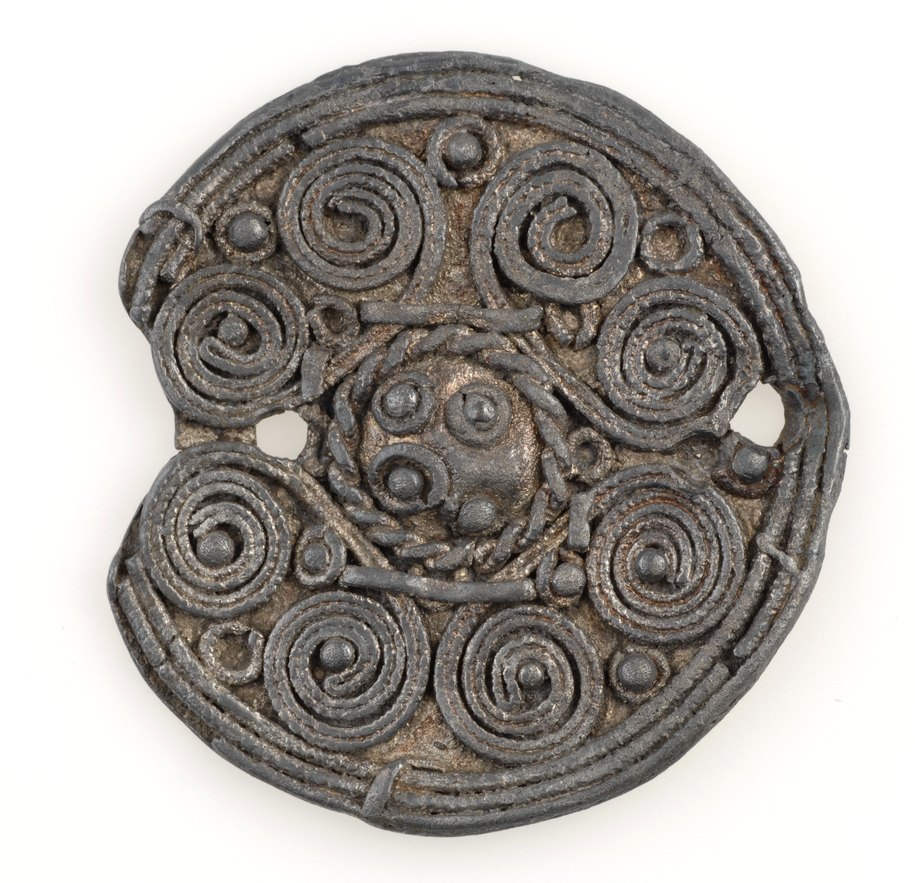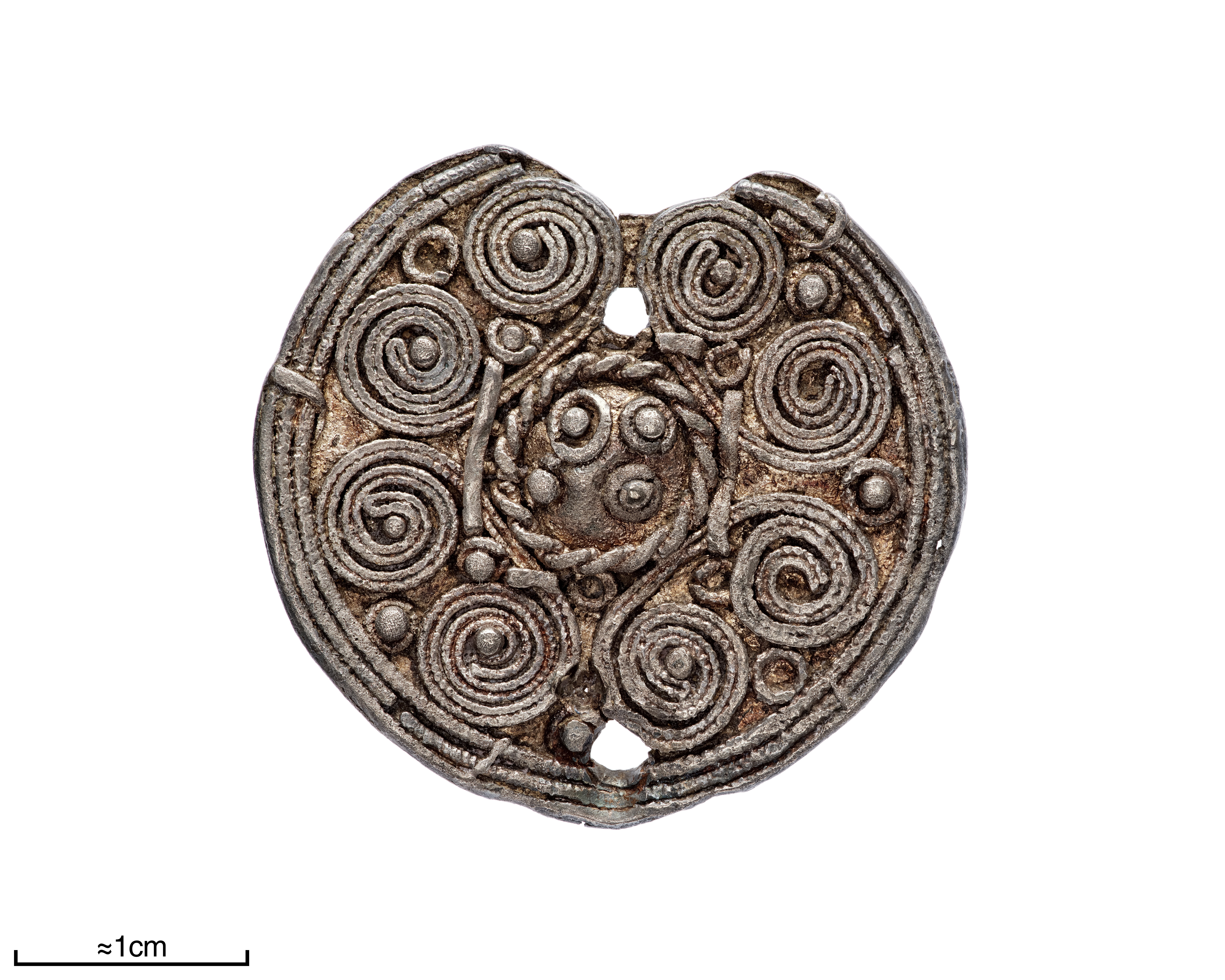 Förgyllt. Till formen runt. Ornamentik i form av spiralfligranarbete: fyra dubbelspiraler utförda av planhamrad, kantställd, dubbel tråd. Kring kanten tre vridna trådar, fasthållna med tvärgående flikar.