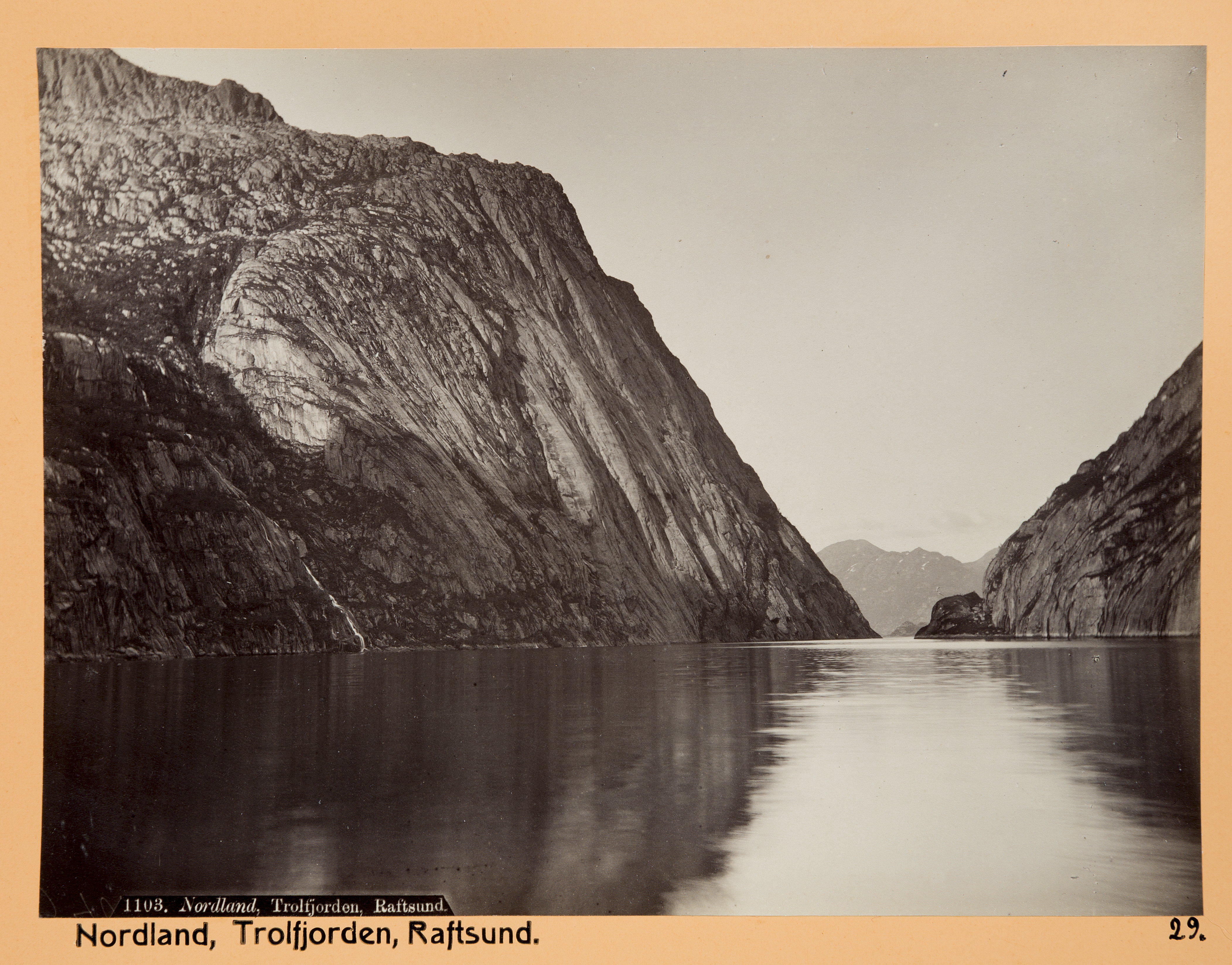 Trollfjorden i Raftsundet. Fotografierna LXVI:C.01.-33. är inköpta av Wilhelmina von Hallwyl, f. Kempe, i Trondheim, Tromsö och Hammerfest under en resa till Norge tillsammans med maken Walther von Hallwyl, modern Johanna Kempe, döttrarna Ebba, Ellen och Irma, Walthers svägerska Ester von Hallwyl, f. von May, från Schweiz, med sina döttrar Hilda och Irma samt fröknarna Caroline Pflaum och Ida Uhse. Gruppen reste med ångbåten Capella från Trondheim till Nordkap och åter till Trondheim, 1-15 juli 1886. Uppgifterna kommer från Ida Uhses reseanteckningar.