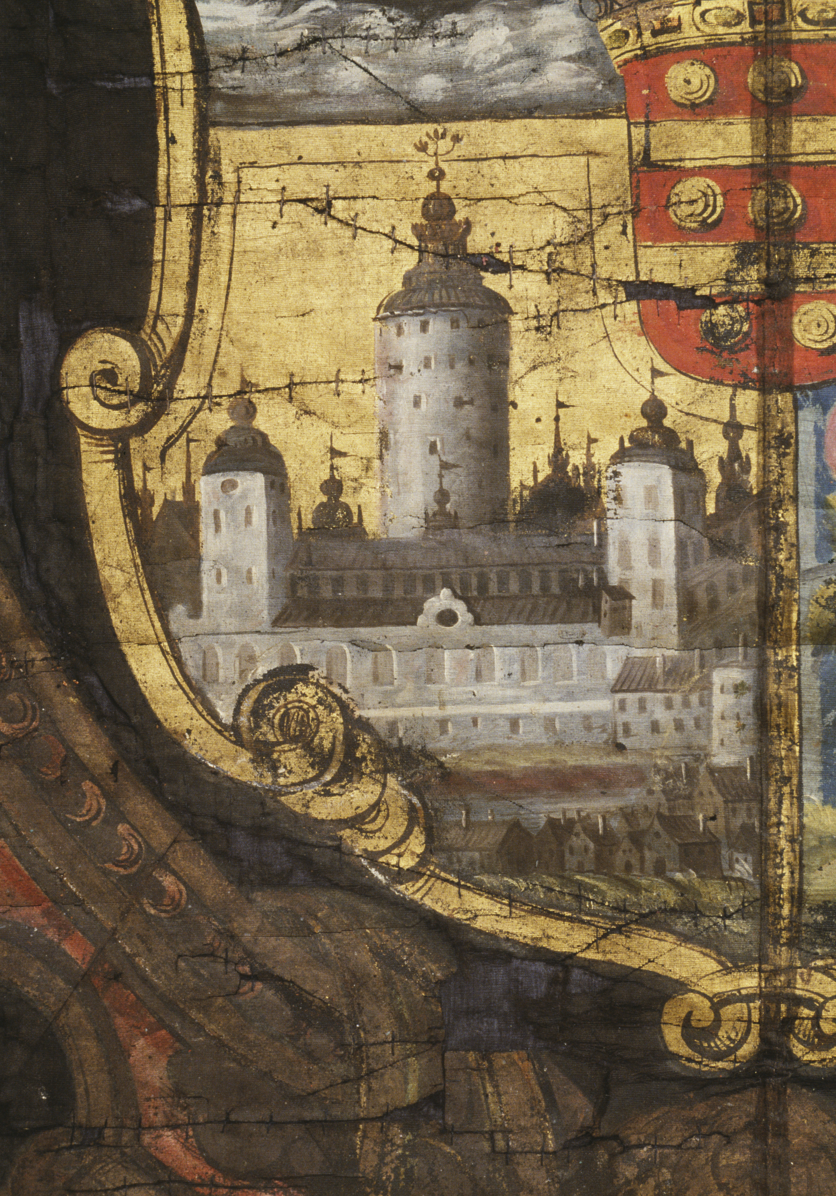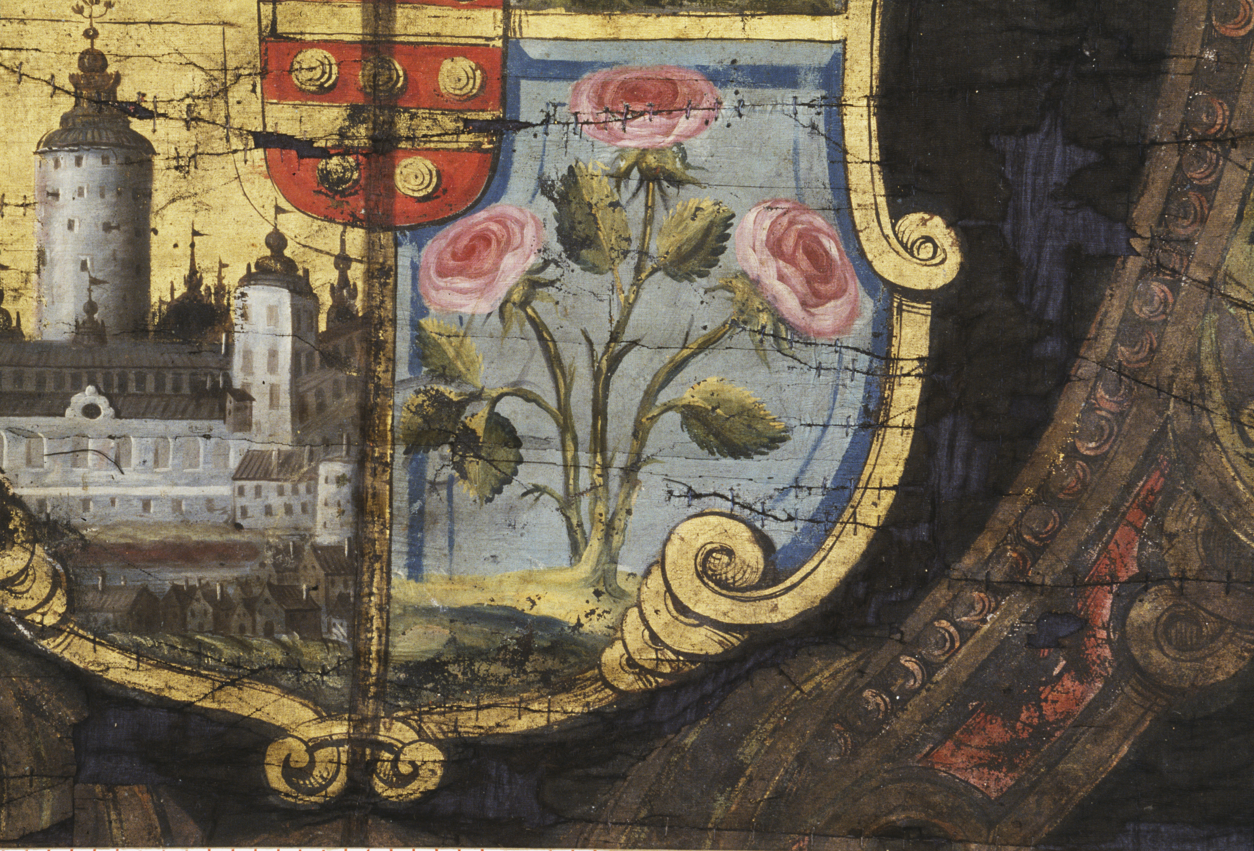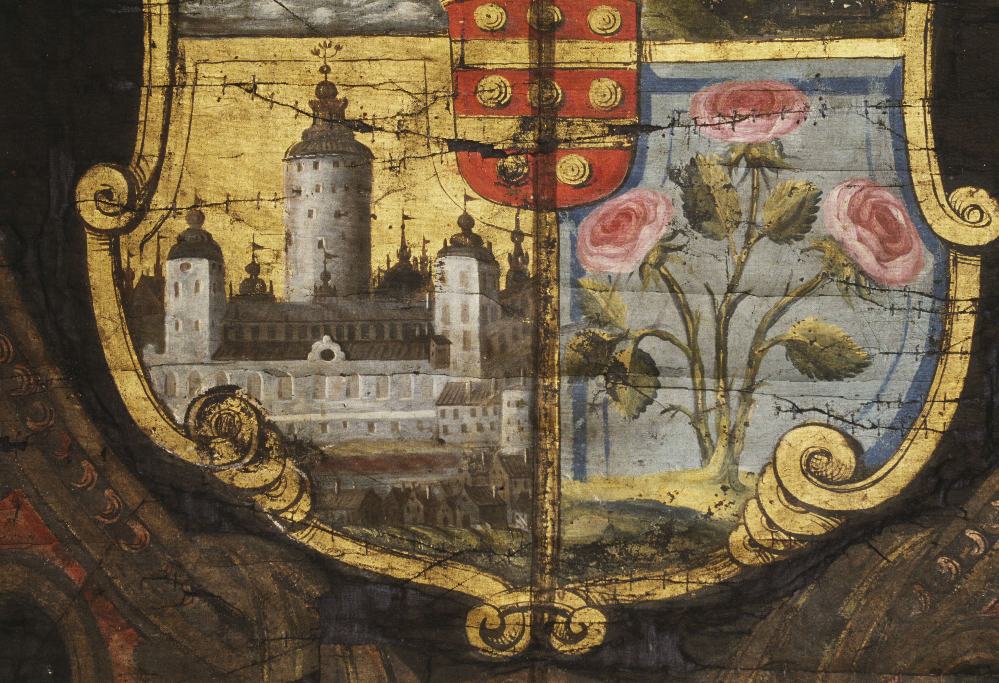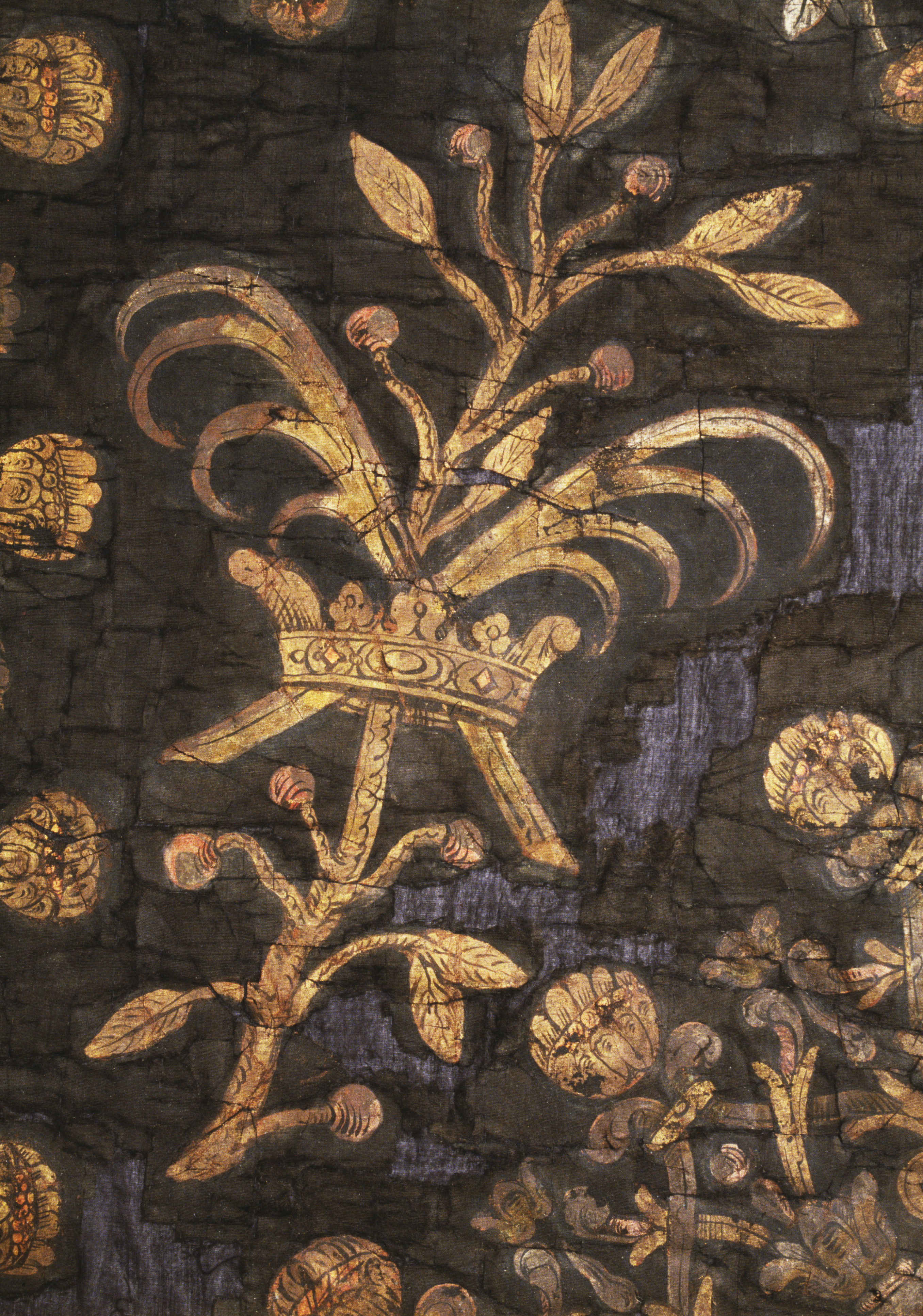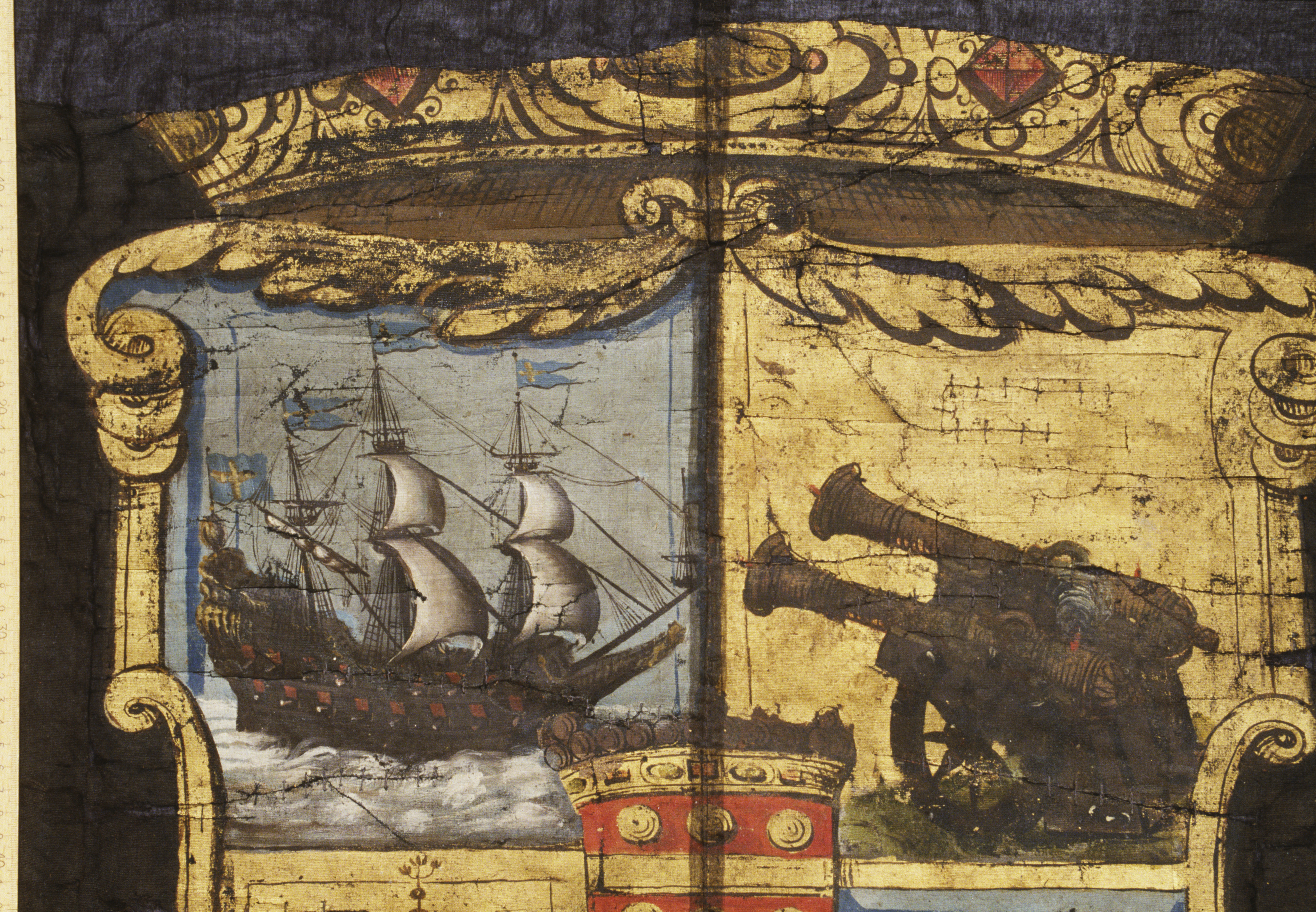 Trekluven duk av svart ripsvävnad med målad dekor. Flemings vapen inom kartuschram. Bård av vasornament. Kantad med svart silkefrans. Troligen för Herman Fleming + 1673. Deponerad 1992.