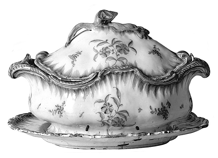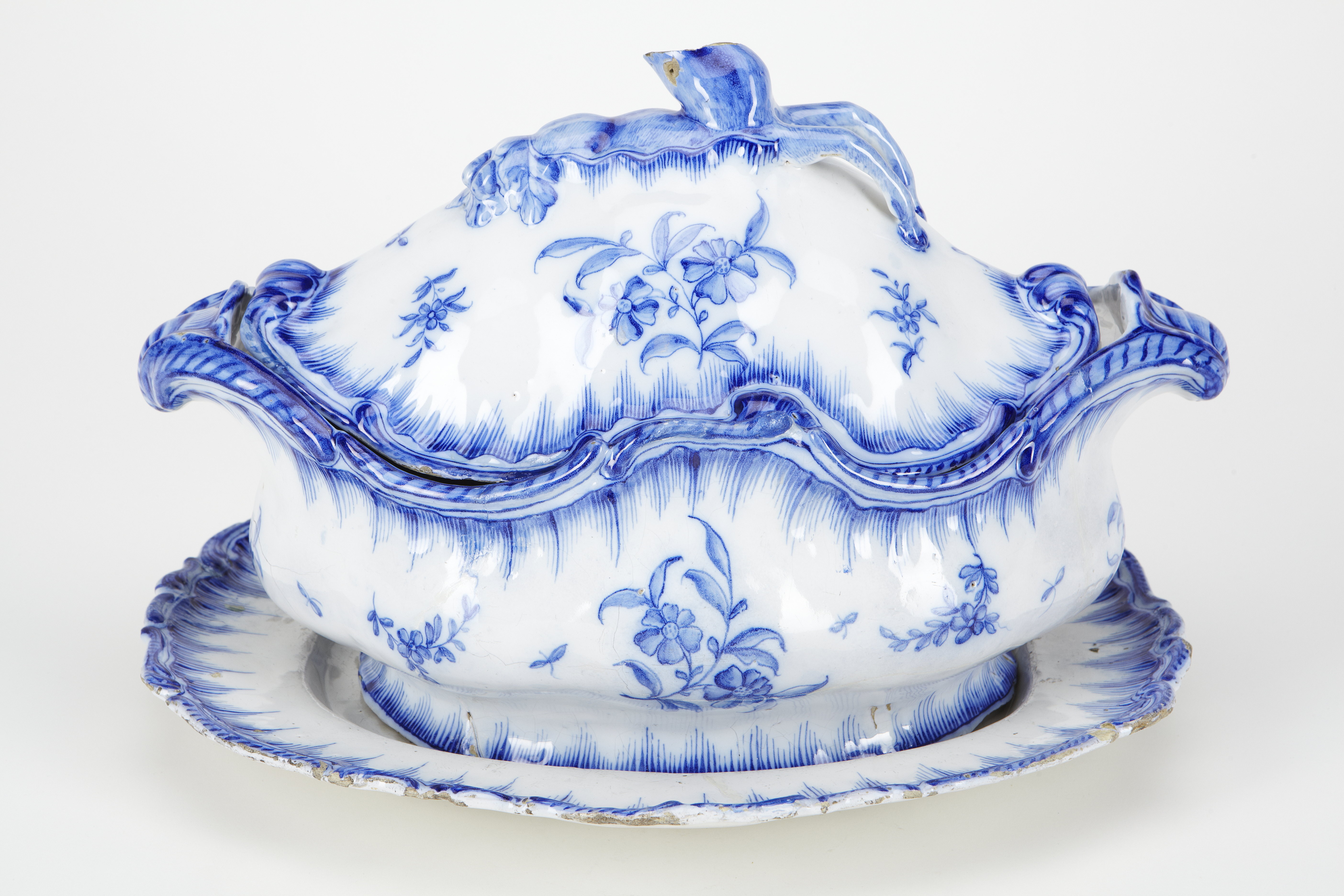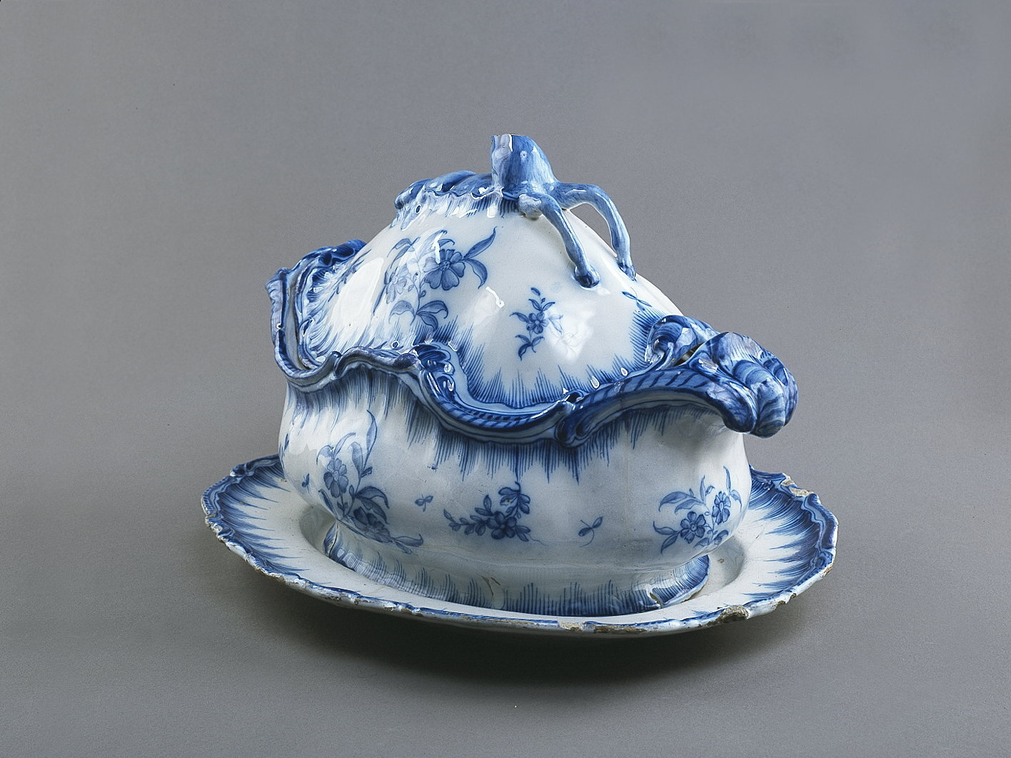 TERRIN med lock och fat. Avlång, bukig samt på något utsvängd fot: brädden starkt konturerad samt med stavformig kant. Dekor: i blått på tennglasyr, färger på fatet något mörkare. Godset gulgrått. På mitten av vardera sidan samt vid vardera ändan en stjälk med två enkla blommor samt spetsiga långsträckta blad; stjälkarna på sidornas mitt större. Mellan denna dekor blad och mindre stjälkar. Bräddkanten med snedställda ränder mot mörk botten, därnedanför s. k. kamning i nedåtvända uddar, handtagen med musselliknande dekor mot mörk botten, runt foten kamning som kring brädden, uddarna här vända uppåt. På bottnens utsida en märkning i blått; på insidan två påklistrade lappar med tryck och skrift i svart