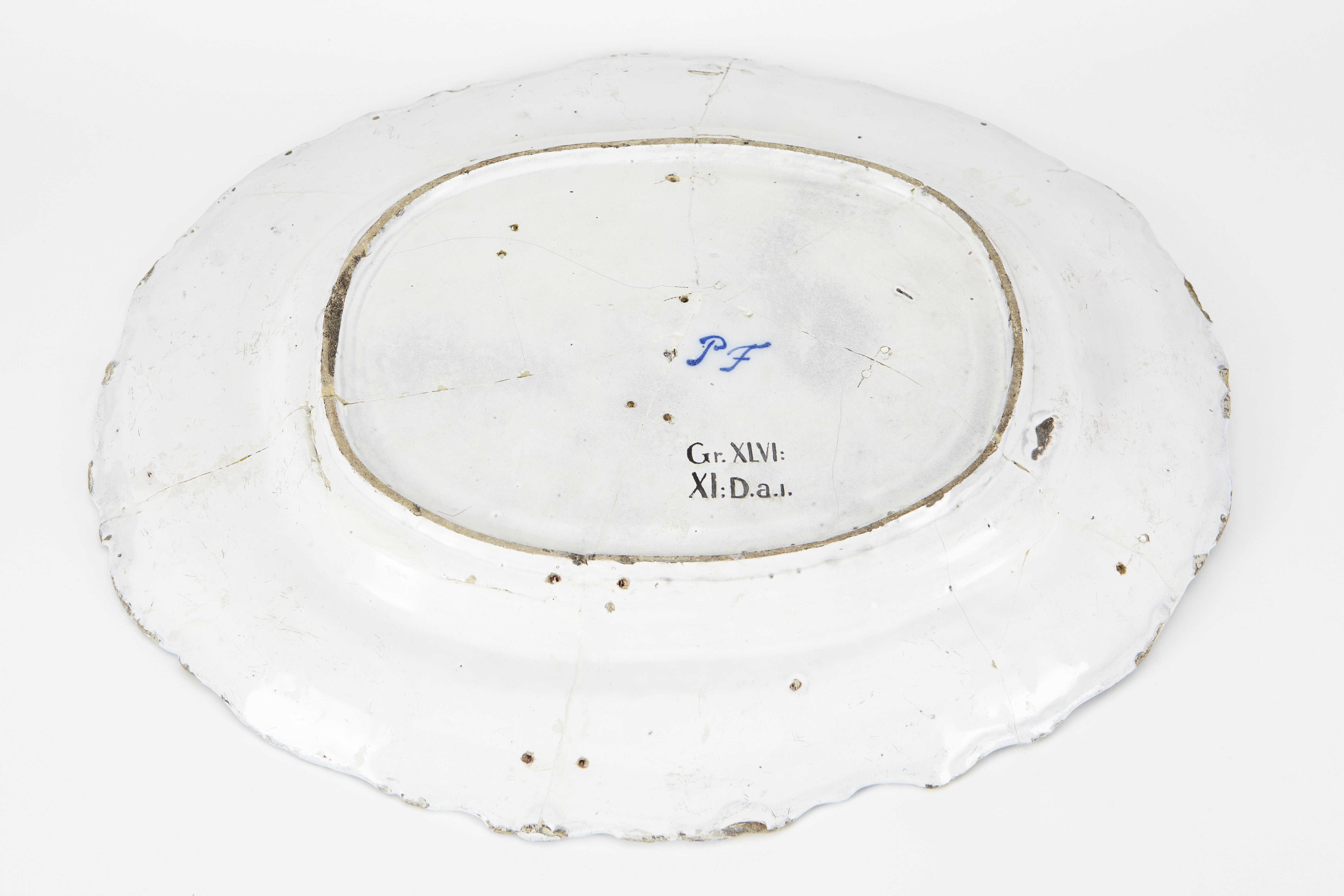 Signatur/Påskrift: På bottnens utsida i blått fabriksmärke PF och årtal (P F = Pålsjö Fabrik); på insidan två påklistrade lappar med tryck och skrift i svart: Rörstrands samling (på ena lappen: N:o 116 A).