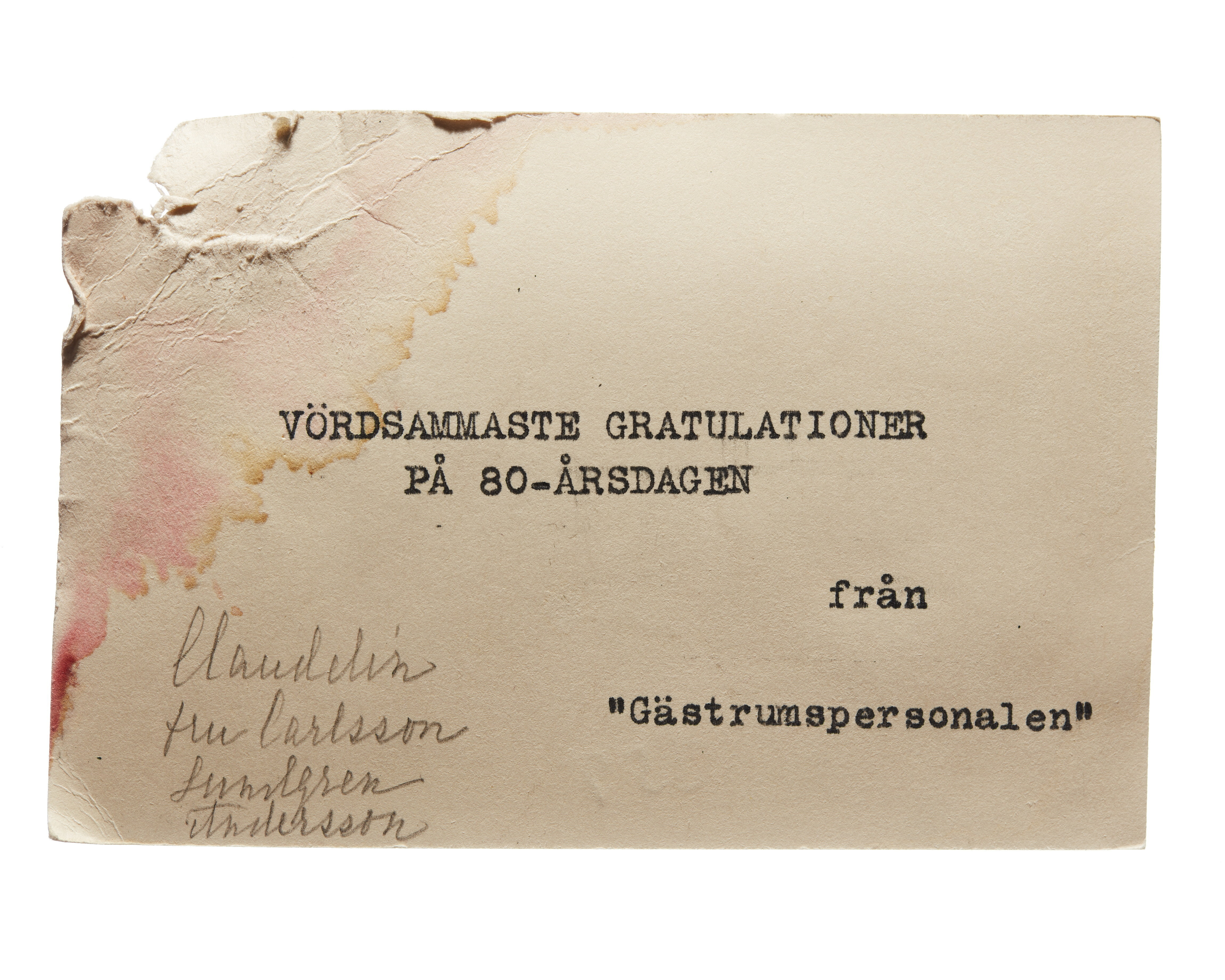 Ett visitkort från Gästrumspersonalen (......), daterat 26.01.1919. Står på kortet " Vördsammaste gratulation på 80-Årsdagen".