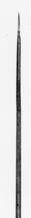 Stålspets smal med triangulärt tvärsnitt. Skivformig rund hals, L: 11 mm, holk, L: 41 mm rundsmalnande uppåt med två stålskenor, L: 268 och 272 mm. Runt brunbetsat skaft av trä, tjockare nedtill än upptill.
