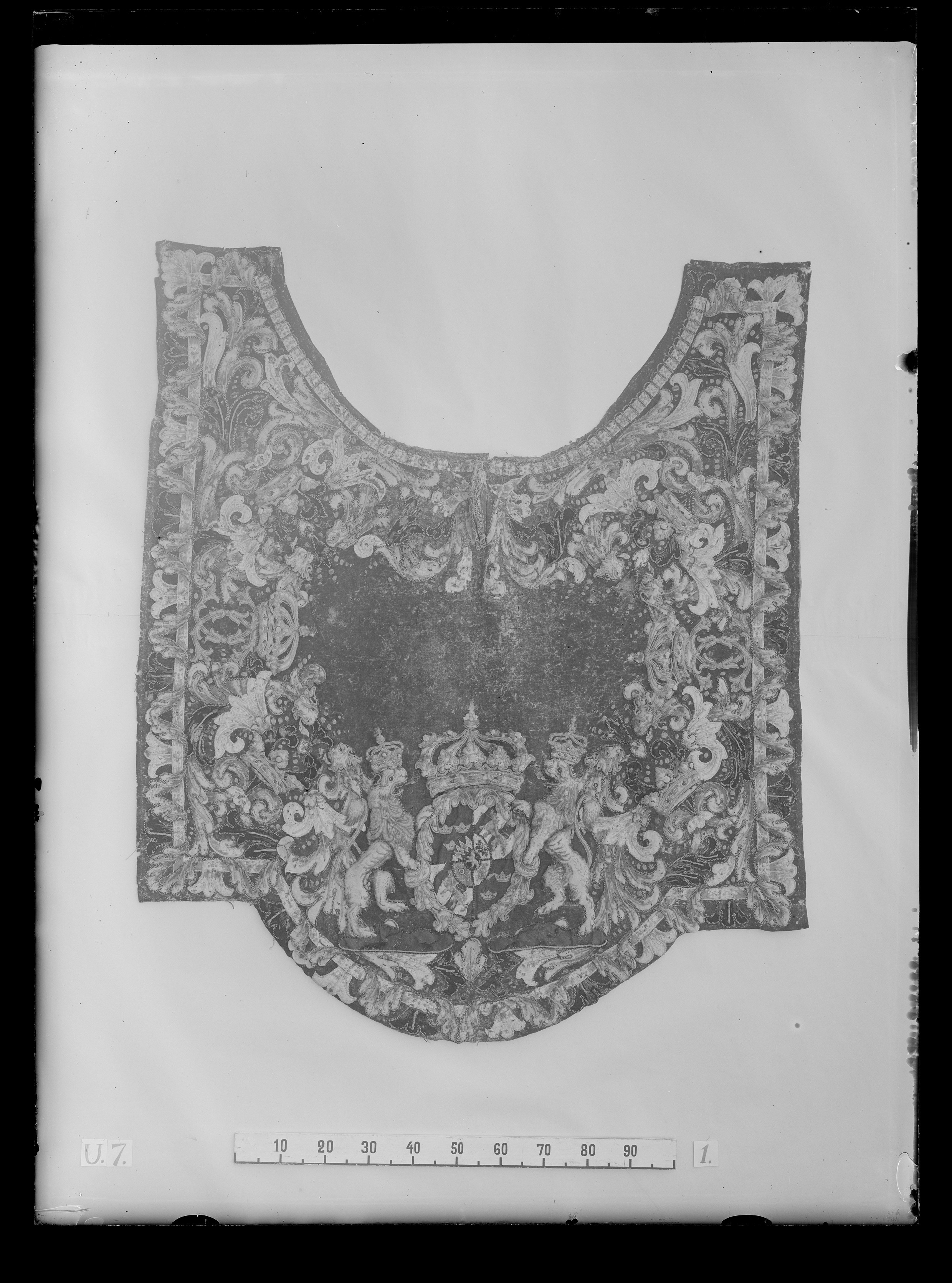 Täcke av blått kläde med applikationer av kläde i flera färger, huvudsakligen gult och vitt. Samma typ som nr 4061 men skiljer sig från detta i följande avseenden: De sköldhållande lejonen har slutna kronor och står på små grästuvor med yttäckande ullgarnsbroderier i grönt, gult, brunt och vitt. De gula lejonen i vapenskölden är sydda av ullgarn. Riksvapnets mått: 675x500 mm. Täckets bredd framtill: 1440 mm. På vänster framstycke sitter två bruna läderremmar, 230x20 mm, placerade 50 mm innanför framkanten. På baksidan sitter fem tränsar, liksom på nr 4061. Märkt "G.14." med svart tusch 85 mm nedanför inskärningen. Två hällor, 240x30 mm av brunt läder, placerade ungefär i täckets mittparti och ca 500 mm innanför respektive långsida. Svansrem av brunt läder 545x5 mm,trädd genom fodret, 230 mm ovanför bakre fliken.
