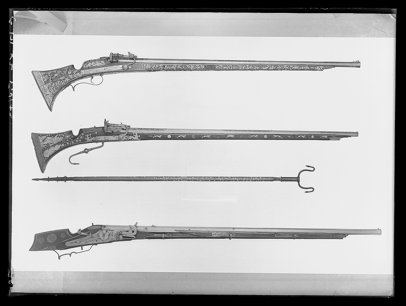 Rund pipa av stål med trumf, åttsidig kammare med profilerad vulst i båda ändar, rektangulärt, svagt böjt svansskruvblad. Vid pipbasen stämplar I T samt däremellan sköldformig stämpel med ligatur A T omgivet av A och T (Lrk vägl. 1921:334). Till h.därom en stämpel vänd åt andra hållet, djupt inslagen i form av hammare och H E E (?). Därframför på mittfasen graverat en siffra 6 (9?) samt stämplat årtalet: 1600. Riktmedel: Från sidan inlaxat ståndsikte av stål, stolpkorn av mässing. Fästning: Fyra häften. Pipan fäst med krysskruv underifrån (främre varbygelskruven) samt med tre skruvar genom stålband om framstocken. Luntlås-hjullås med plant låsbleck. Lunthane med enkel streckdekor. Hjul täckt av hus med plan platta med triangulär, sluten övre hälft mot fä8ngpannan och rundad, öppen nederhalva, skruvar kl.3 och 9. Fängpanna med liten skärm, lock med rörlig arm, tryckknapp med välvt skruvhuvud. Kraftig hane med plan, fyrsidig kropp, ringformig, plan hals och lös överkäke, streckdekor. Uppåtsvängt grepp med upprullad ände, käkskruv med fyrsidigt huvud. Hanfjäderstudel med graverad lejonmaskaron (ursprunglig?). Bakom hjulet en inkomplett virvelsäkring. Triangulära fjäderlöv på balusterformiga grenar, streckdekor. Invändiga låsdelar med streckdekor. Fästning: Två låsskruvar. Kort, droppformig avtryckare. Helstock av valnöt med muskötkolv. Kantlister och inlagda, rundade plattor av graverat ben, de flesta urfallna, på anslaget en mittplatta med ett turkhuvud, bakre låsskruvplattan med lejonmaskaron, på kolvryggen liksom på mellersta pipstiftbrickan på h. sida flätbandsdekor, i övrigt rullverksdekor. På kolvens h.sida stämplat: 174.