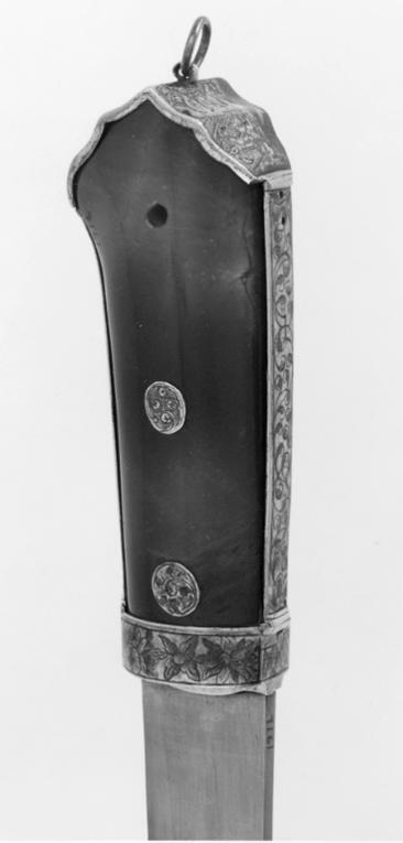Fäste av grön jaspis, något framåtböjt, upptill kantig kontur med ovalt tvärsnitt, fram-och baksidorna tillplattade, beslag av silver med spår av förgyllning. På fram- och baksidorna skenor med niellerade rankor nedtill runt beslag med samma dekor. Upptill förgyllt, graverat och niellerat beslag med reliefscen föreställande landskap med jägare till häst, hund och hjortar. Upphängningsring. Genomgående hål för fästets överdel. Två nitplattor av förgyllt och niellerat silver med bladmotiv. Rak klinga av stål, eneggat till spetspartiet, 29 mm bred vid basen.