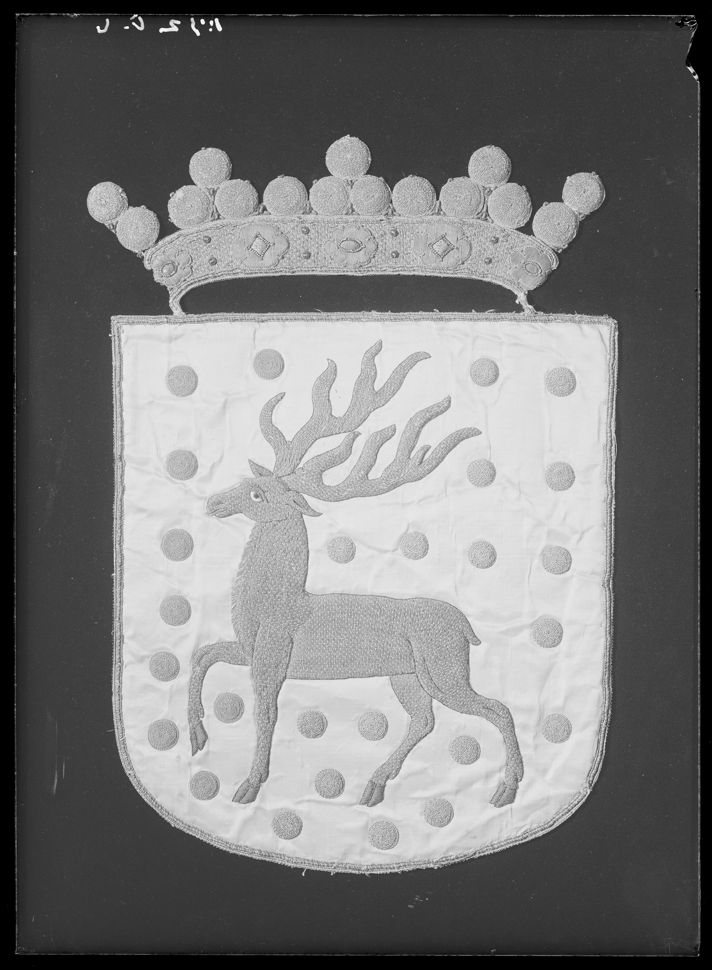 Vapensköld av vit sidenatlas på vilken är broderat en hjort av förgylld silvertråd i läggsöm. Ögat är av svart och vit silkestråd och med en liten tunga av blekt röd silkestråd. Klövarna är av brun silkestråd. Runtom hjorten är skölden beströdd med 20 broderade kulor i blått och silver. Skölden kantas av en tjock och en smal snodd av förgylld silvertråd samt av vit silkestråd omvirad av silvertråd utdragen i små öglor. Vapnet kröns av en friherrekrona med en bred kronring kantad av en tjockare och en smalare snodd liksom skölden. På kronringen är broderat fem blommor med stenimitationer av silverlan omvirade av blå- och röd silkestråd, kantat av skruvade silverlan samt av små prickar av kantilj av förgylld silvertråd. Mellan blommorna är broderat små prickar av kantilj av förgylld silvertråd. Kronspetsarna utgörs av broderade rundlar av förgylld silvertråd virad runtom vit silkestråd och utdragen i små öglor. Vapnet är på baksidan fodrat med naturfärgad linnelärft samt med ljus otryckt makulatur.