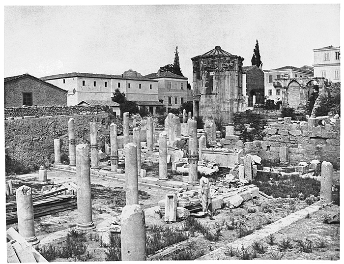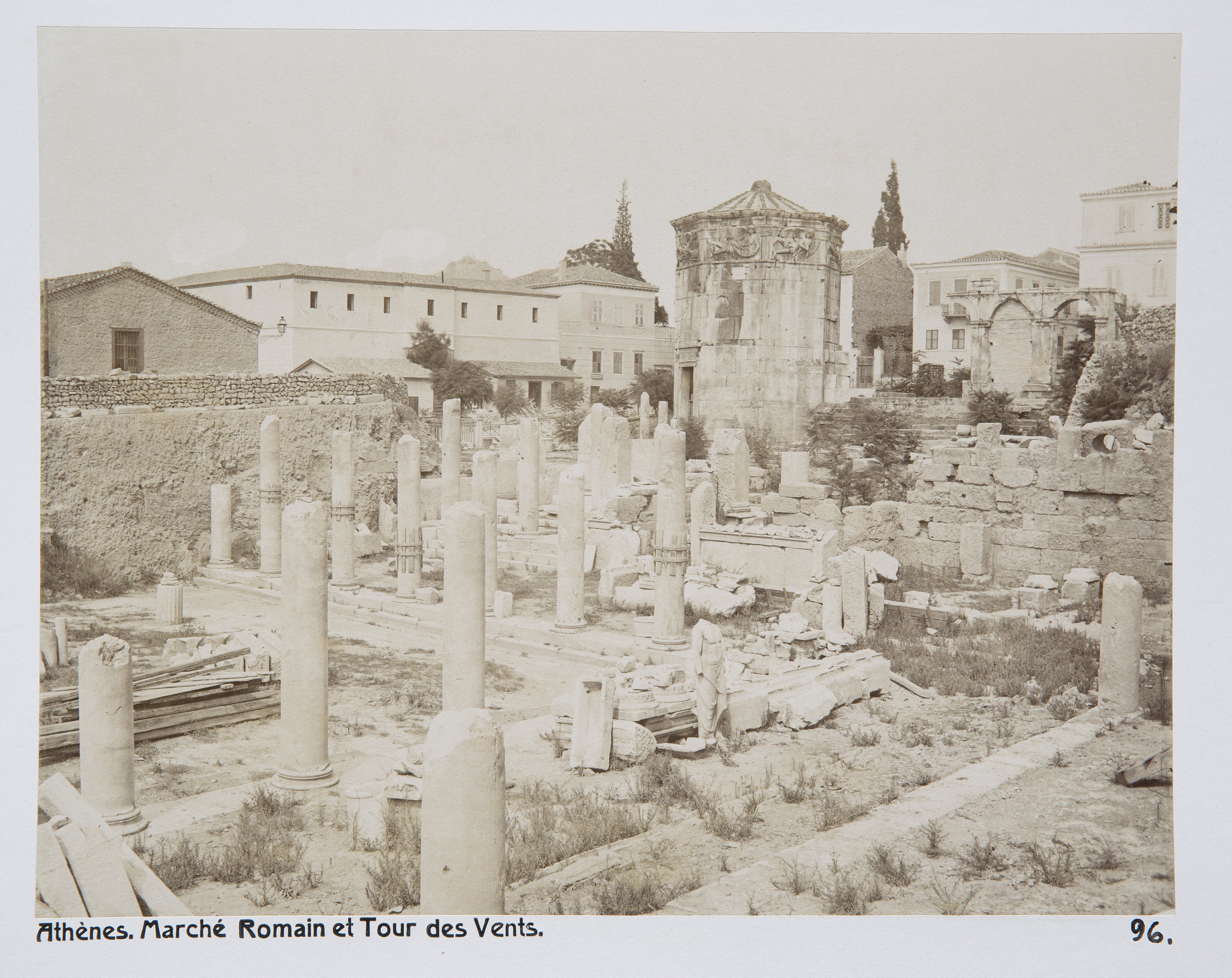 Romerska agoran och Vindarnas torn i Aten, Grekland. Text på originalet: "Athènes. Marché Romain et Tour des Vents." De små fotografierna, K. 1-17, tagna af Wilhelmina von Hallwyl, f. Kempe, under deras resa genom Grekland, Macedonien och Serbien samt åter öfver Schweiz tillsammans med sin make, Walther von Hallwyl, samt fröken Ida Uhse 15 mars - 6 juni 1896. De stora fotografierna inköpta af Wilhelmina von Hallwyl, f. Kempe, i Corfu, Patras, Nauplia, Athen, Saloniki och Belgrad vid hennes vistelse i nämnda städer tillsammans med sin make Walther von Hallwyl, samt fröken Ida Uhse under deras resa genom Grekland, Macedonien och Serbien samt åter öfver Schweiz 15 mars - 6 juni 1896. Förestående uppgifter lämnas med ledning af fröken Ida Uhses Reseanteckningar.