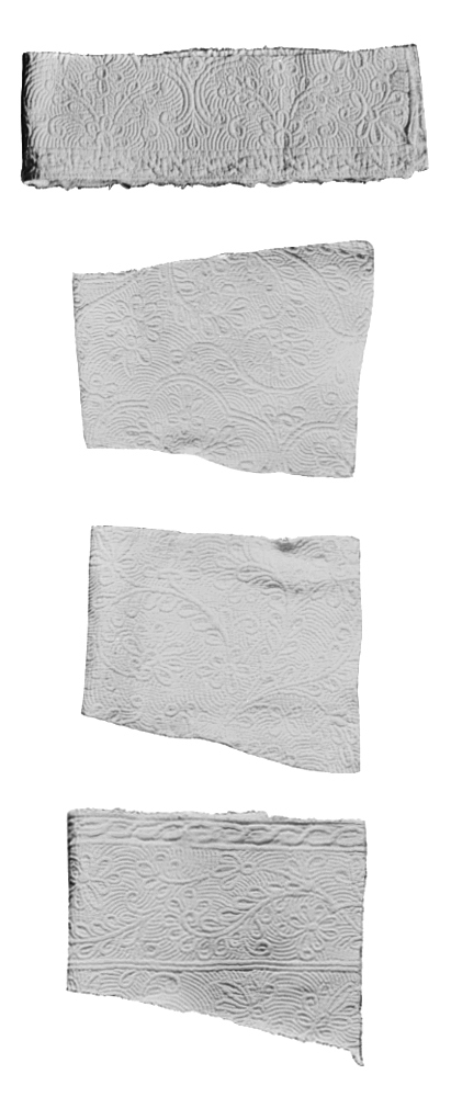 Fragment av broderi, fyra stycken. Av vitt tvåskaftat bomullstyg med reliefbroderi, s.k. matlassé. Mönster av blommor, blad och rankor. Längd mellan 36 och 52 cm, bredd mellan 8,5 och 15 cm.