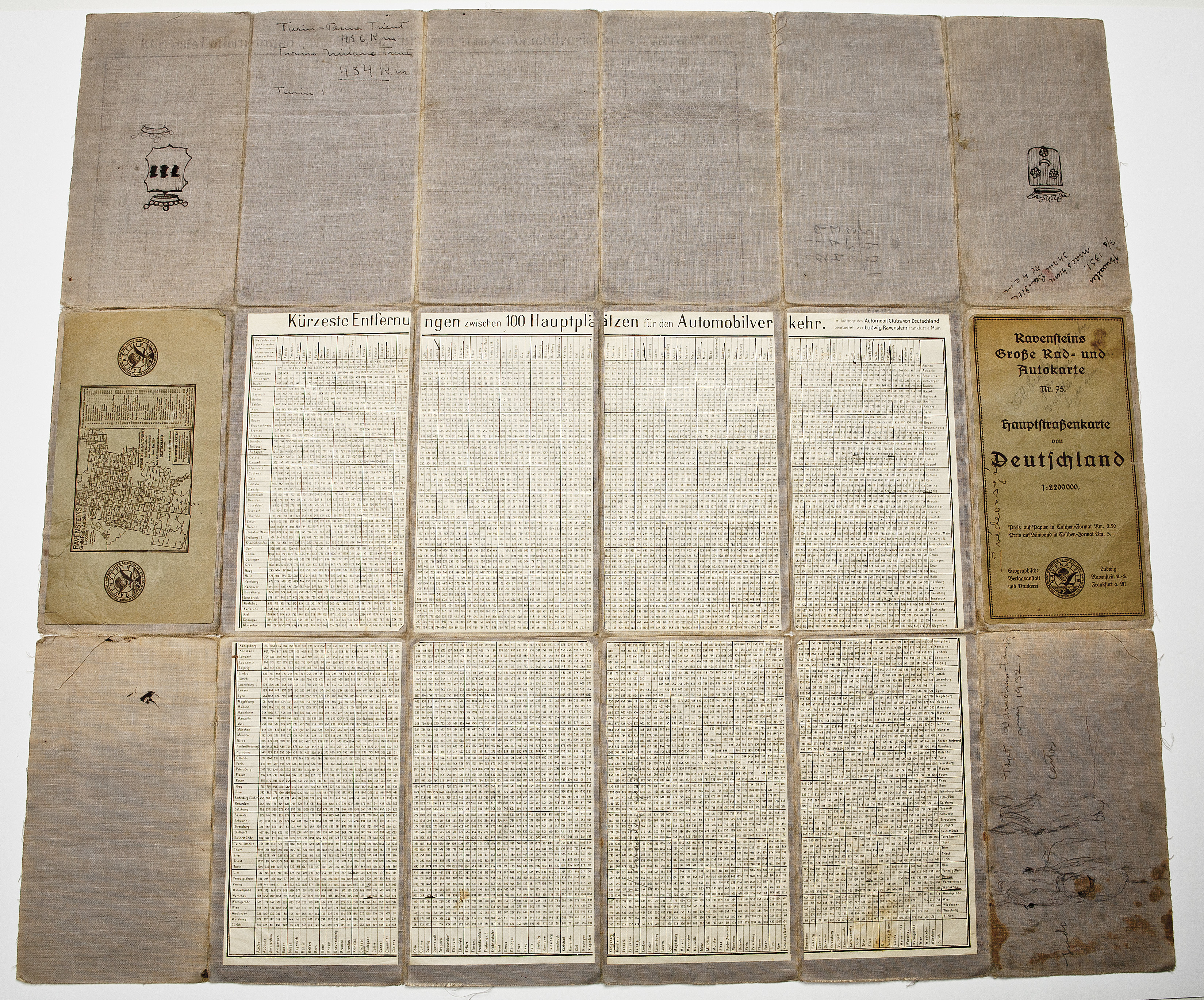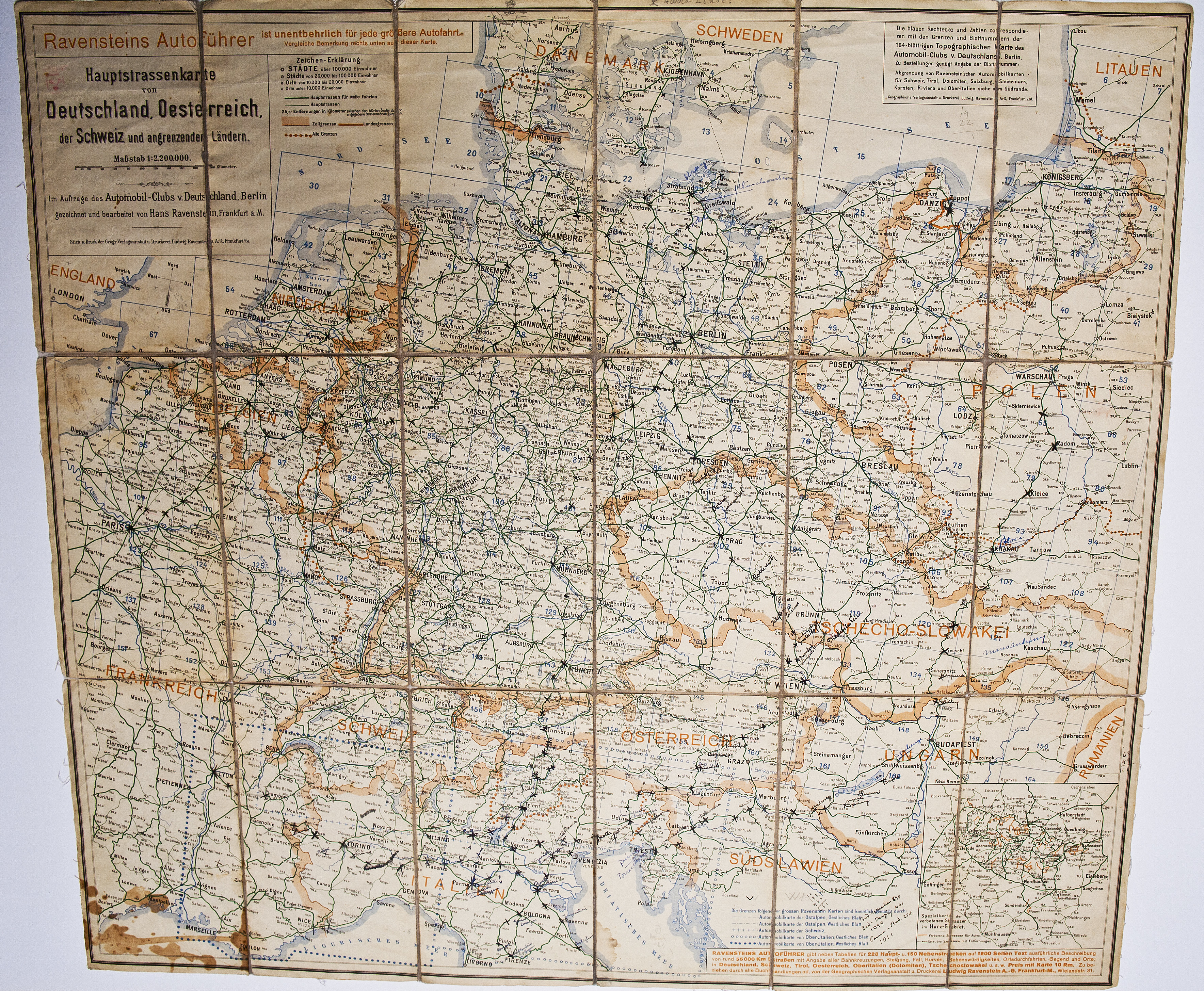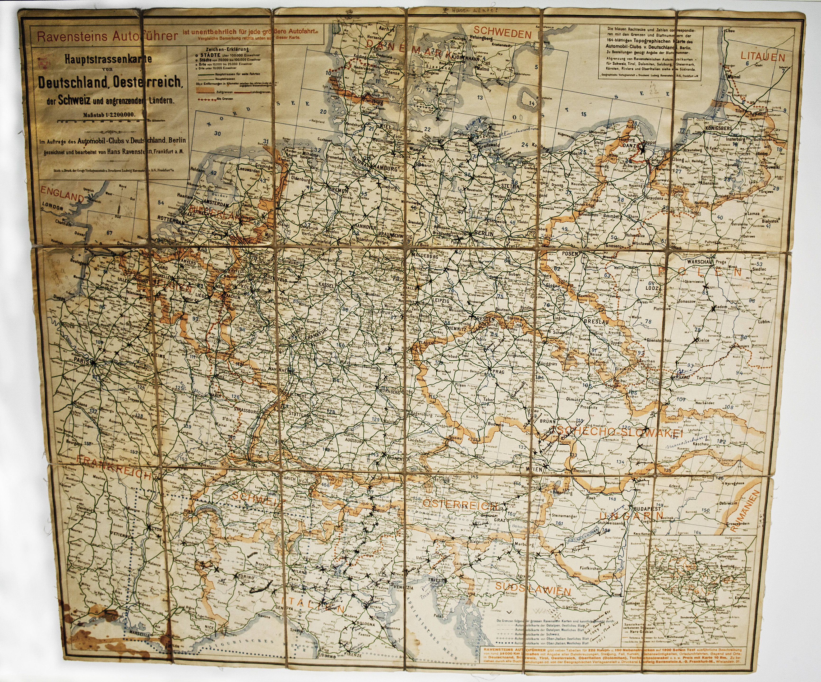 Kartan är utgiven av der Geogr Verlagsantaltung u Druckerei Ludwig Ravenstein A-G, Frankfurt a/M. Ravenstein. Ravenstein Autoführer Hauptstrassenkarte von Deutschland, Oesterreich der Schweiz und angrenzender Ländern. Kartan består av 18 delar som är monterat på en blågrå väv vilket gör att den går att vika i flera riktningar. De två omslagsflikarna är tryckta på grågrön kartong. På baksidan avståndstabeller. Skalan anges i 1:2.200.00 Med små kryss i blått bläck är Lindes färdväg utritad. Flera namn på småorter eller värdshus är skrivet längs färdvägen. På utsidan har Linde ritat av hästen Castor och Indo: en häst Linde fick i Italien och som följde med till Sverige. Denna karta förvarades i högra bakpacksfickan.