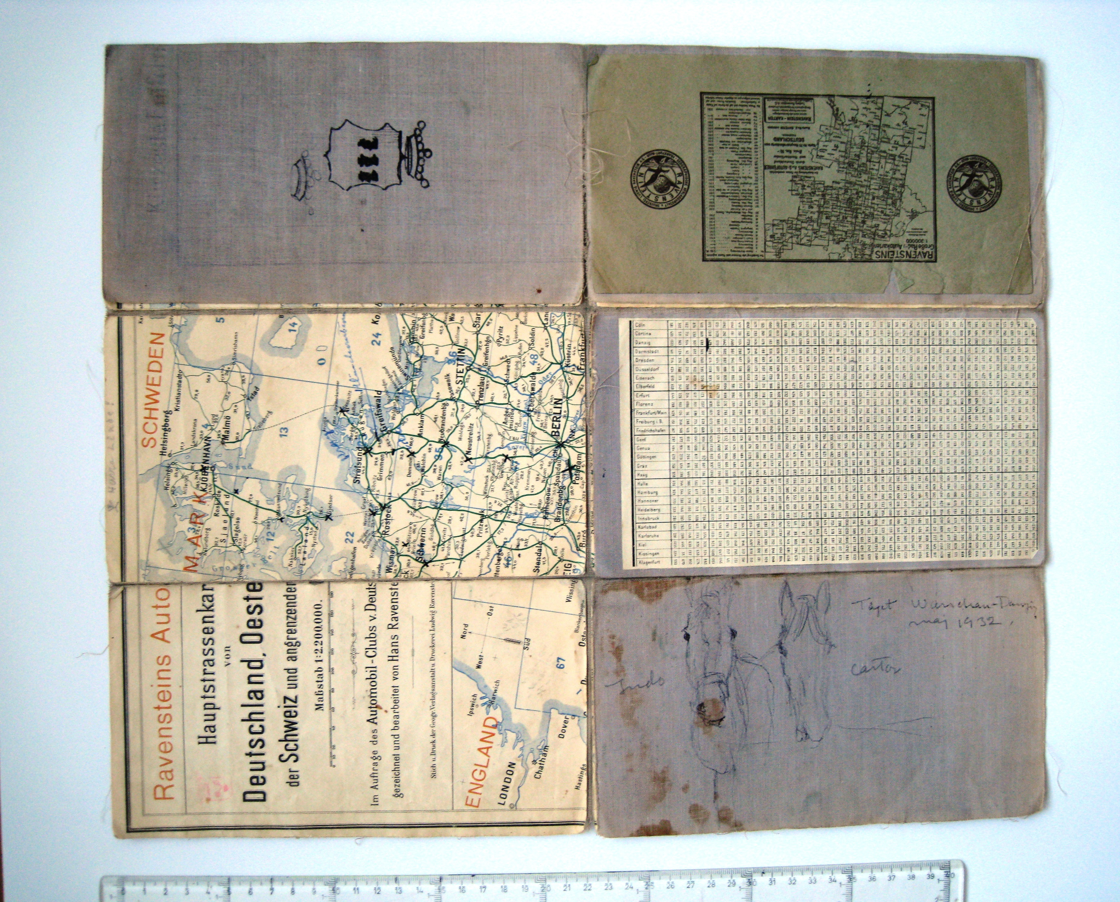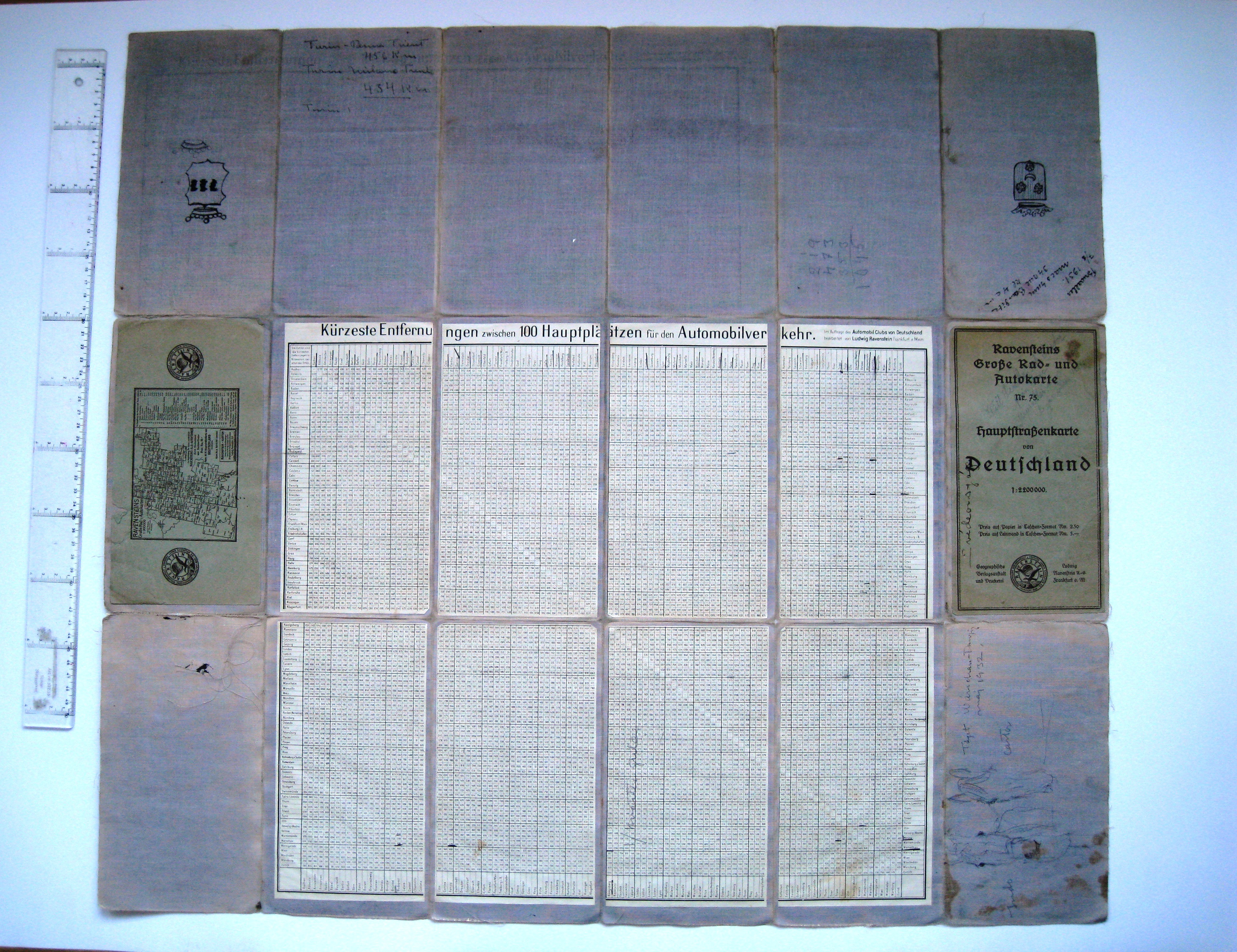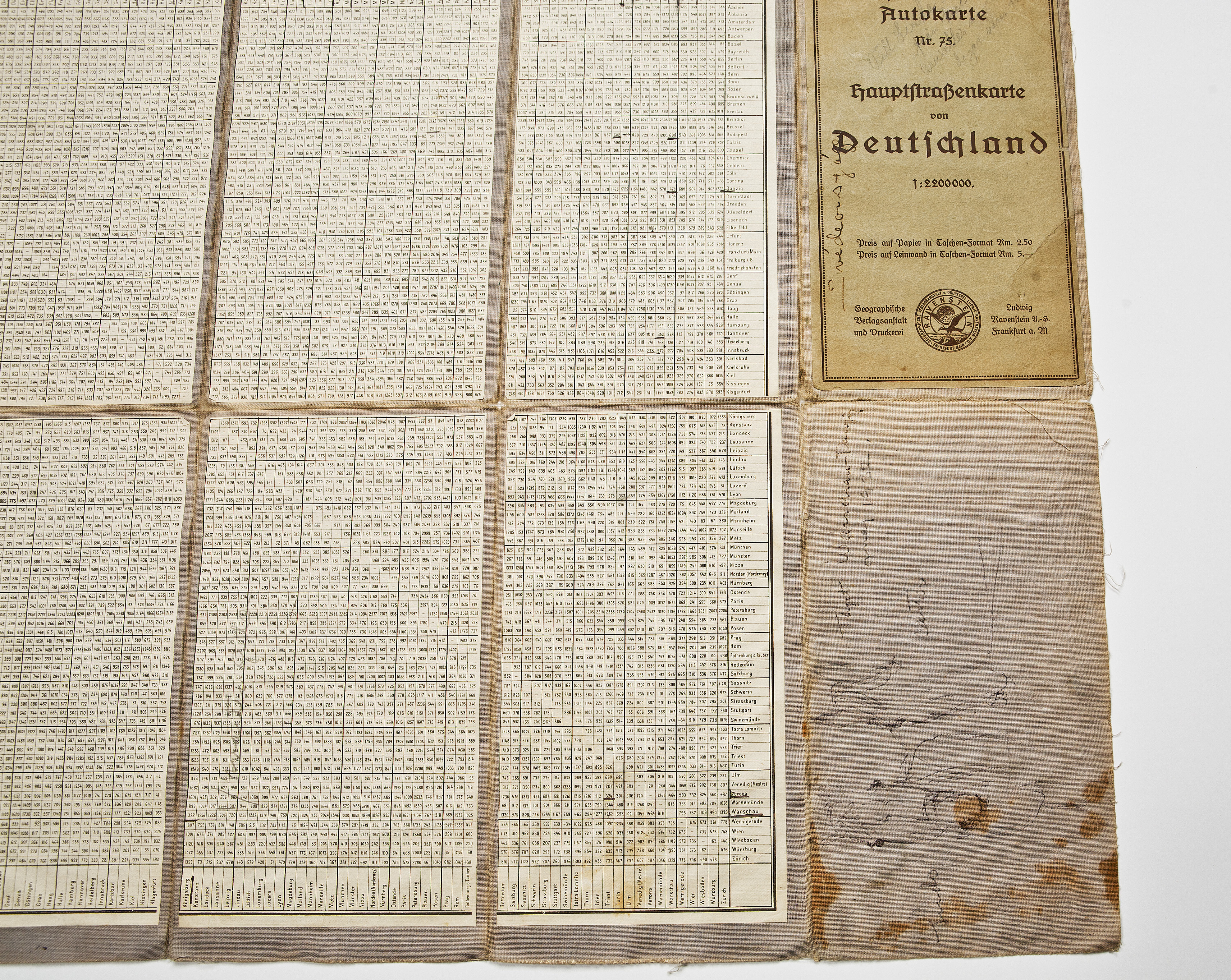Kartan är utgiven av der Geogr Verlagsantaltung u Druckerei Ludwig Ravenstein A-G, Frankfurt a/M. Ravenstein. Ravenstein Autoführer Hauptstrassenkarte von Deutschland, Oesterreich der Schweiz und angrenzender Ländern. Kartan består av 18 delar som är monterat på en blågrå väv vilket gör att den går att vika i flera riktningar. De två omslagsflikarna är tryckta på grågrön kartong. På baksidan avståndstabeller. Skalan anges i 1:2.200.00 Med små kryss i blått bläck är Lindes färdväg utritad. Flera namn på småorter eller värdshus är skrivet längs färdvägen. På utsidan har Linde ritat av hästen Castor och Indo: en häst Linde fick i Italien och som följde med till Sverige. Denna karta förvarades i högra bakpacksfickan.