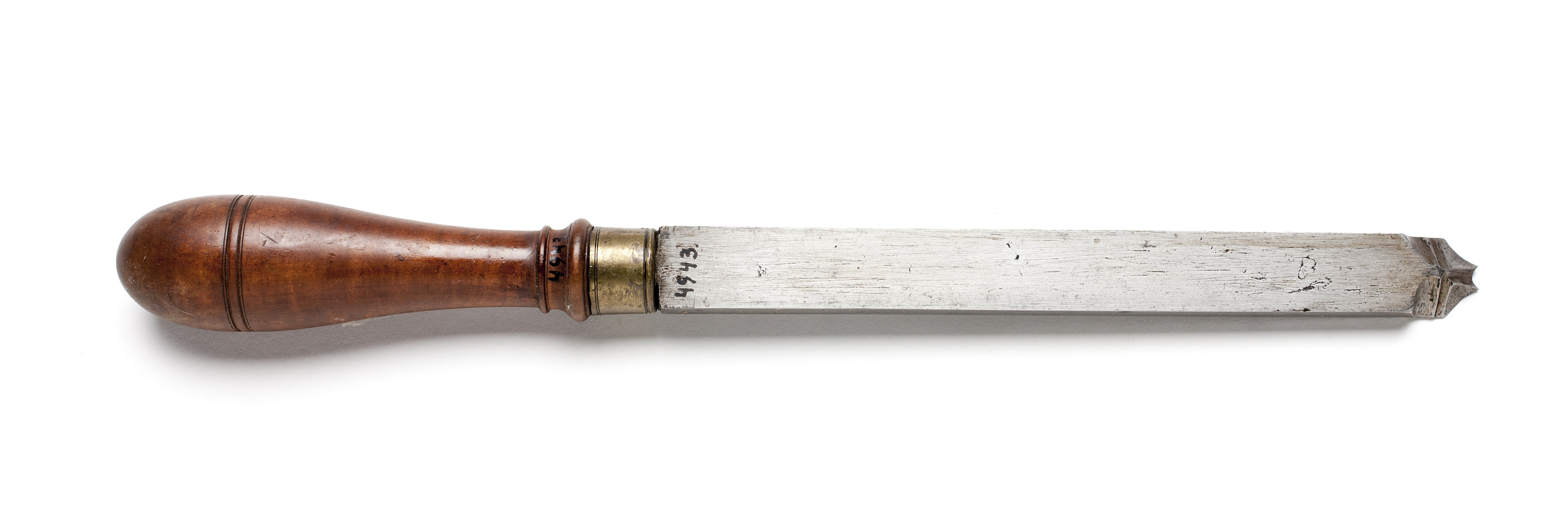 Klinga med rektangulär, i änden triangulär genomskärning. Spetsig egg med liten konkavitet i yttersta spetsen. Svarvat skaft av päronträ med två vulster nedtill ("skoklostertyp"). Mässingsring. Stämpel i skaftets ände vid fästet: "IV".