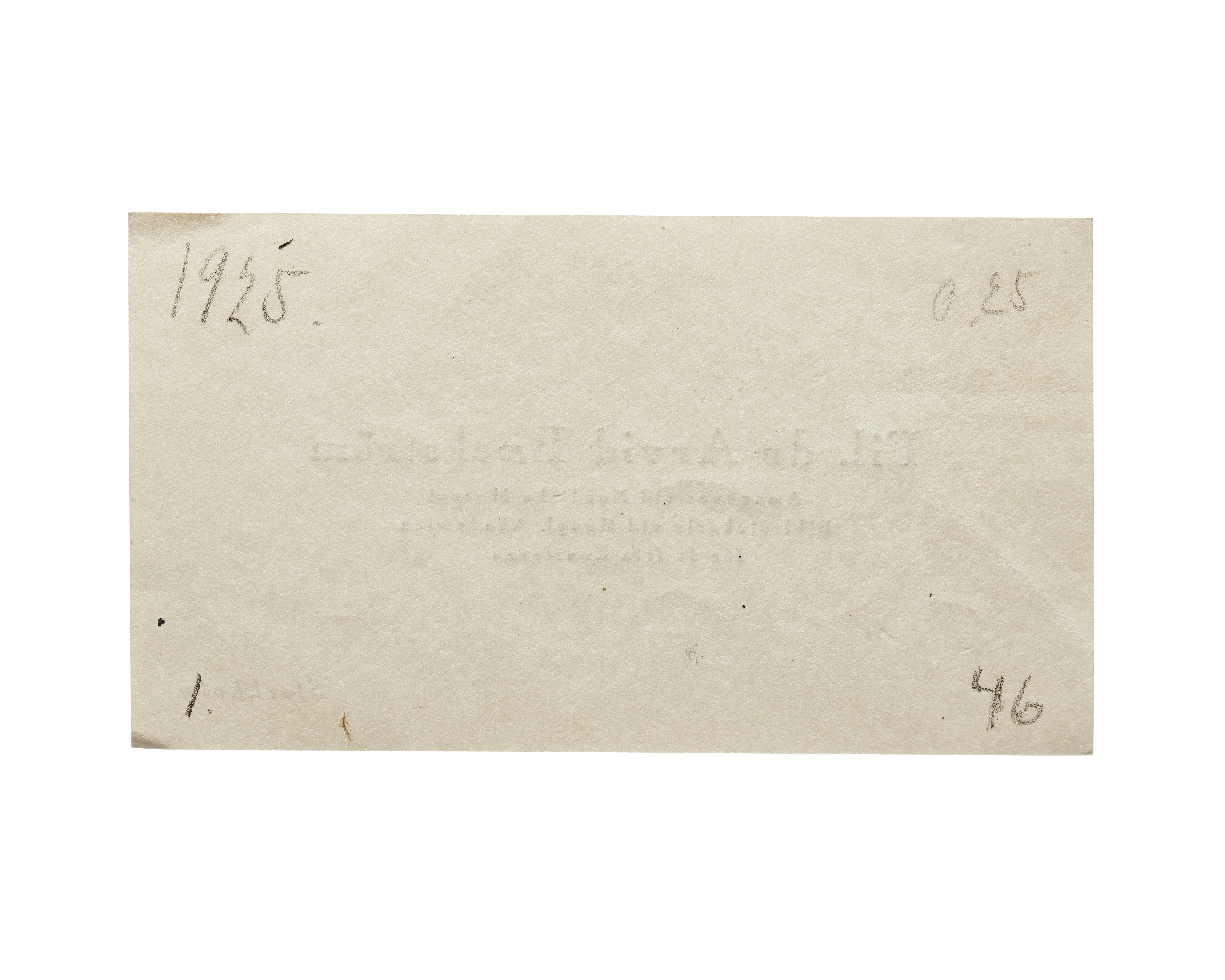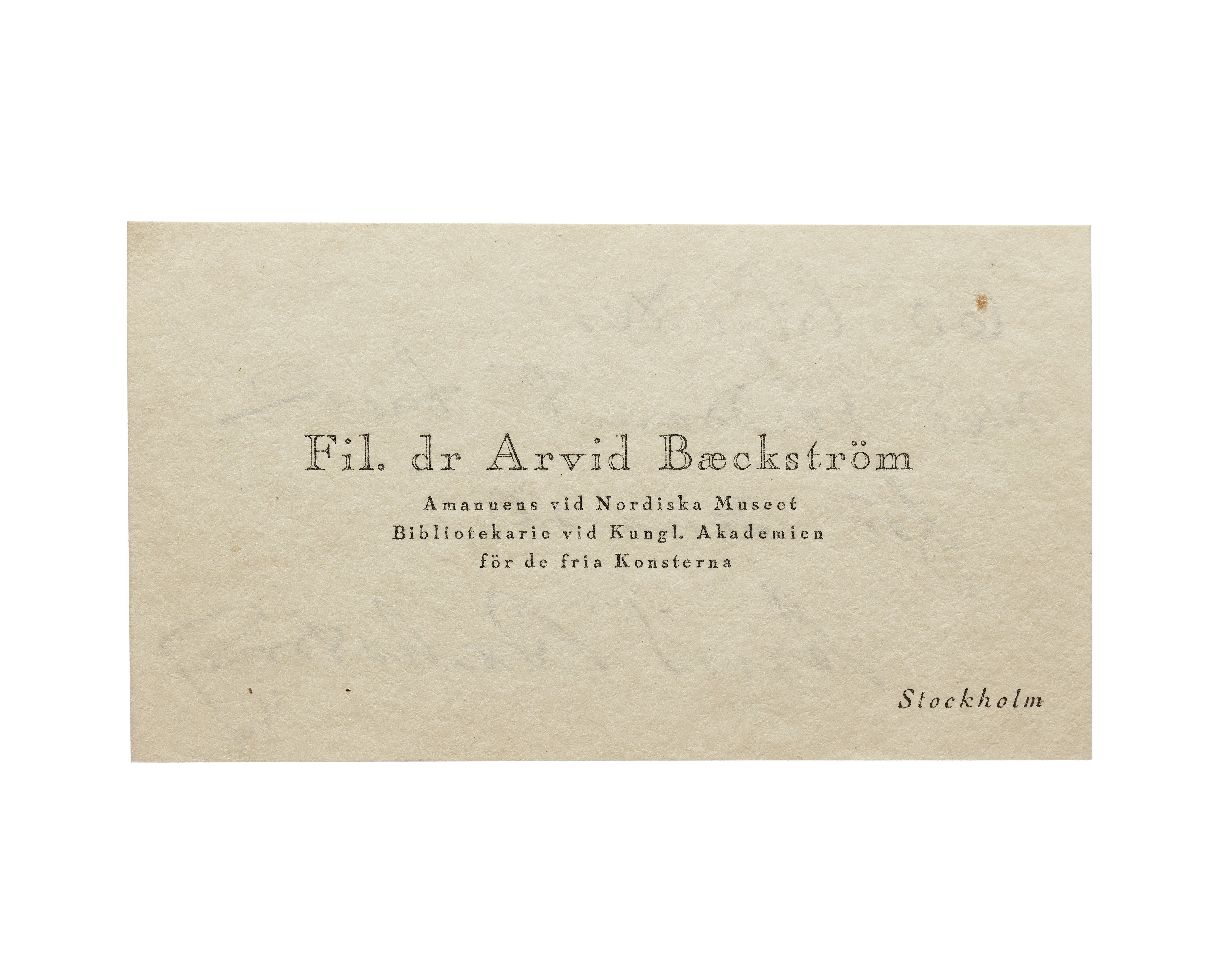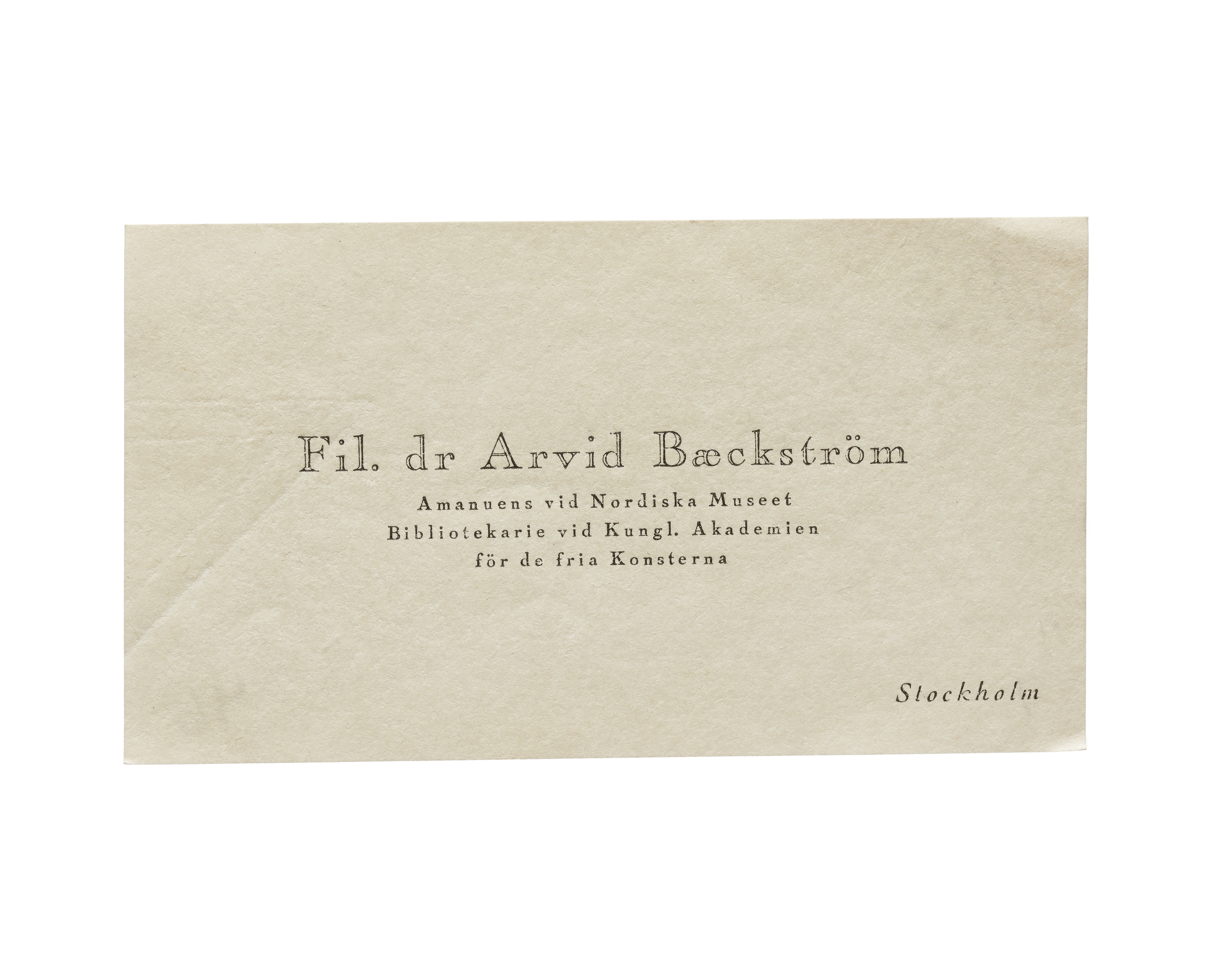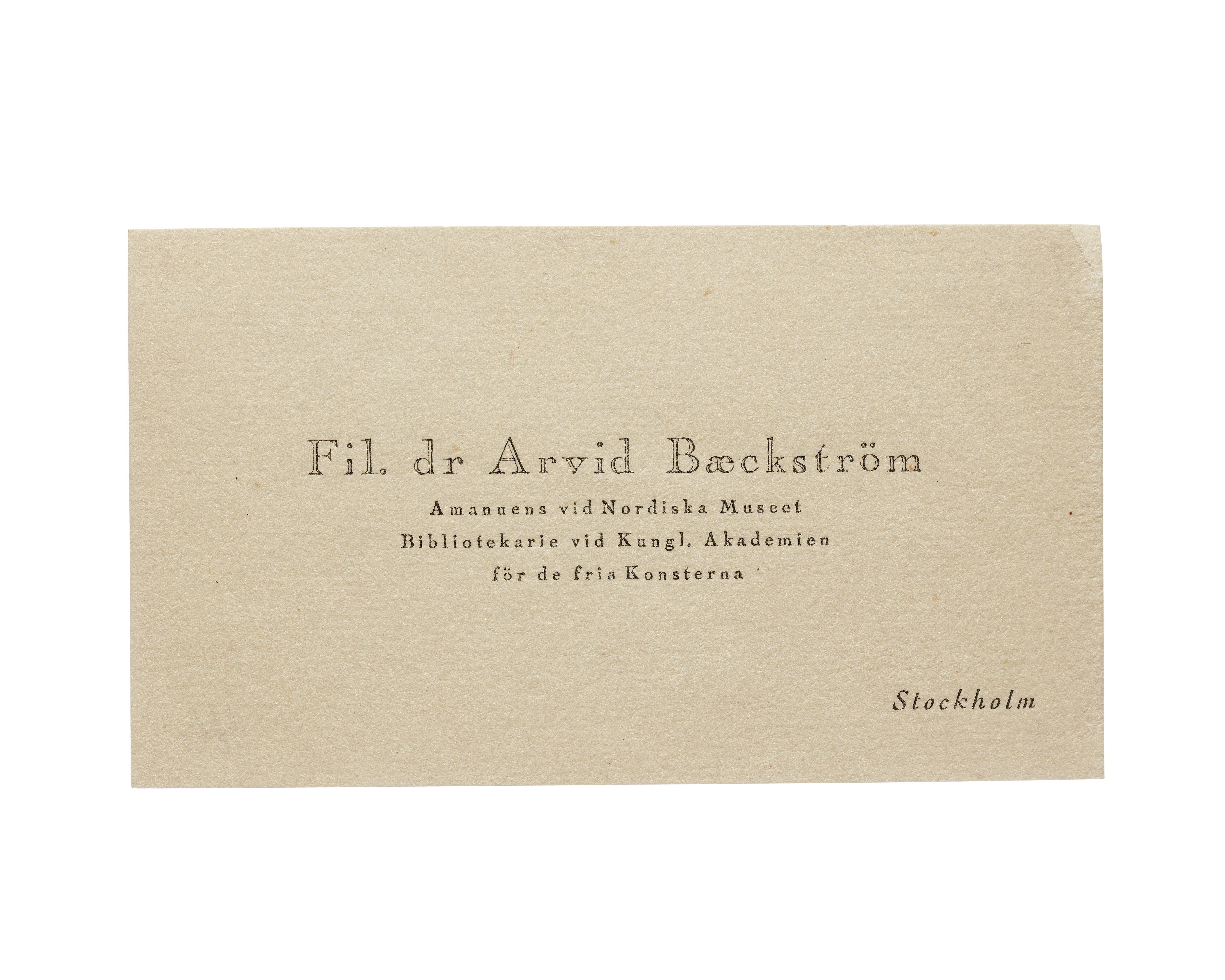 Tre visitkort från fil. dr. Arvid Baeckström, Amanuens vid Nordiska Museet, Bibliotekarie vid Kungl, Akademien för de fria Konsterna. Första kortet daterat 1925. Adress (nedre högra hörnet) Stockholm. Andra kortet daterat 1926, otydlig handskrift på baksidan. Tredje kortet daterat 1926.