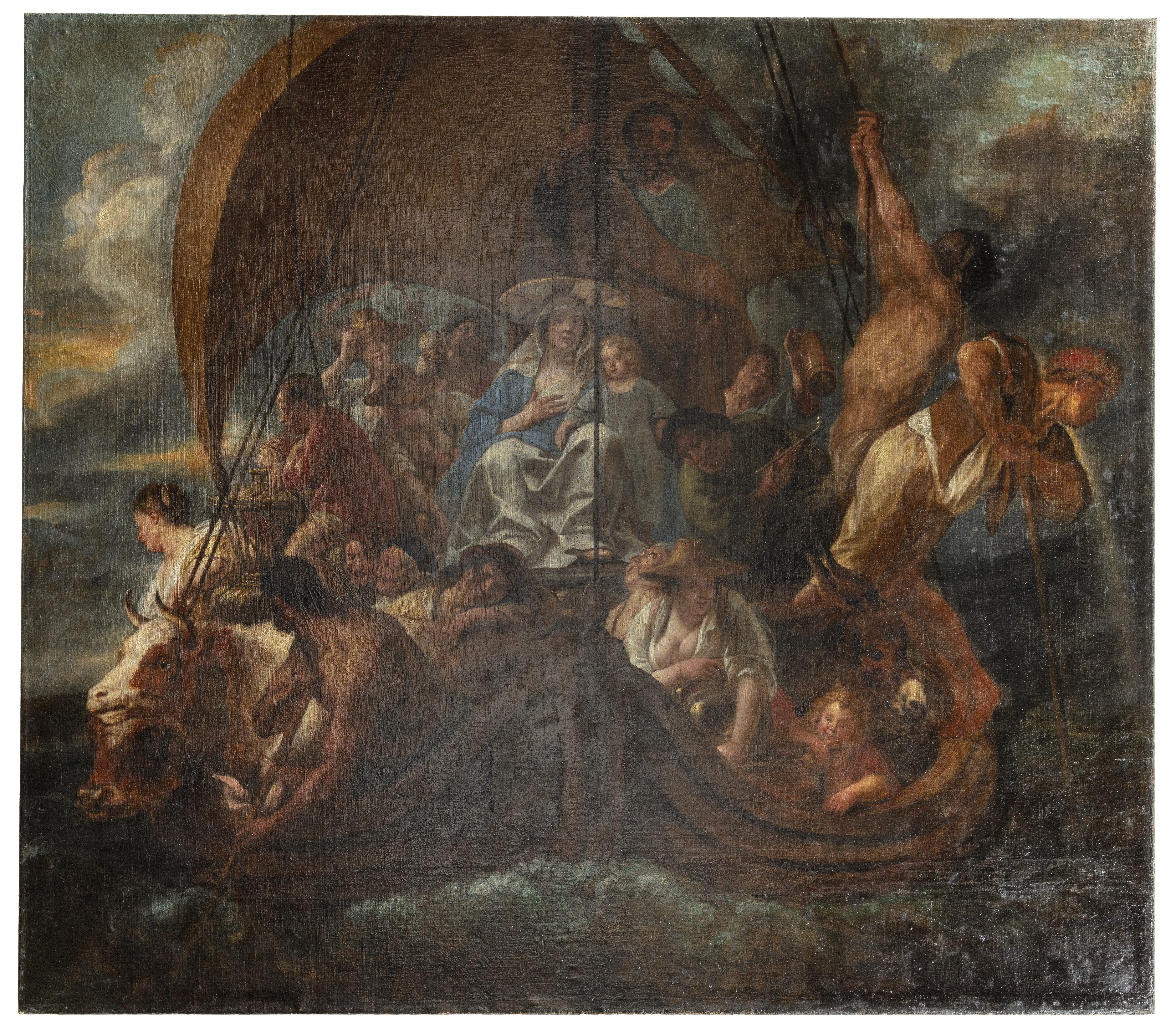 Den heliga familjen med diverse personer och djur i en båt från flykten till Egypten. Olja på duk.