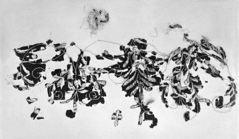 med guldbroderi uppsydda på nytt svart tyg vid konservering 1932-36. Strumpebanden har ett broderi som är identiskt med de violetta strumpebanden 21128-30.