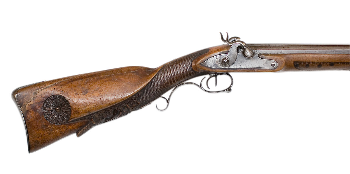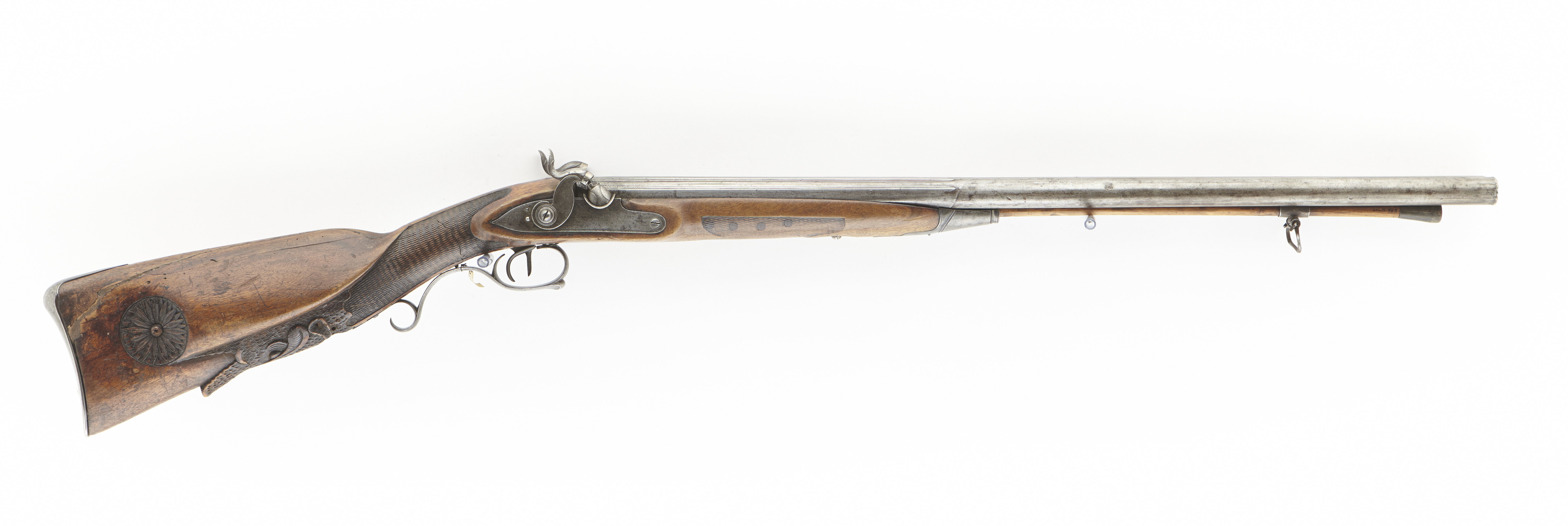 Rund, vid kammaren åttsidig, rakräfflad dubbelpipa, 8 räfflor, godstjocklek vid mynningen över bommarna ca 1,5 mm. De tre övre faserna är rundade med tredubbla kantlister, mitt på faserna är inslaget silverlinjer, på överfaserna fortsättande in på pipornas runda del med en spets. Skålad överspång, baktill täckt av en silverplåt med rundad framände, därpå graverat: "A Jungmarker". På pipornas runda del baktill inslaget med silver, på v pipa "STUM", på h: "PEN", på spången därframför "1795 D 9 i 10". Vid pipbasens sidor är fäst snäckor med tändhattsnipplar. Runt mynningen är påslaget ett silverband. På underspångens bakre del är fäst en kantig rörka med gängat hål för pipans fästning. På spångens främre del sitter en rund, brunerad rörka med en rembygel på undersidan. Riktmedel: Stolpkorn av silver. På baskylbladet ett skålat sikte Fästning: Pipan fäst med baskylhakar, som ovanifrån fastskruvats i baskylen samt med en skruv underifrån genom framstocken. Baskyl av gråanlöpt stål med långt, i avsatser avsmalnande baskylblad, två skruvar, hålen flankerar siktet. Slaglås, två plana låsbleck med graverad kantlinje, s-formiga, platta hanar, likaså med kantlinje, svarvad upphöjning för hanskruven. S-formigt svängda slaghuvuden med nätskurna tumgrepp, runt slagytan ett silverband, b: ca 5 mm. Länk nöt-slagfjäder. Fästning: en genomgående låsskruv från v bleck samt vardera en skruv vid framänden. Dubbla avtryckare. Avvtryckarbleck med konturerad framände, bakänden klockformig, därframför en smal spets, utvidgad till en sexbladig blomma, kantlinjer. Halvstock av trä med kindstöd på kolvens h sida, snidad dekor, vid kindstödets bakände en krysantemumliknande blomma, på kolvens undersida ett vildsvinshuvud(?). Nätskuren kolvhals och framstock, i fältet på framstocken inslaget fyra mörkare (genomgående?) trästift. Beslag av gråanlöpt stål, bakplåt med markerad häl, kort flik med rundad spets på kolvryggen. På framstockens undersida ursprungligen en oval pipskruvplatta (bortfallen). Näsband-spetsrörka framåt avsmalnande med ring, bakåt avsmalnande i avsatser. Varbygel med kluven bakre stolpe, bygeln är förtjockad vid framstolpen, delvis fri bakre arm, nedsvängd till handstöd, omvänt c-formig bakre stolpe, rundad ände. Tillbehör: Laddstock av trä, l: 665 mm (avbruten), framtill finns ett koniskt hornbeslag, l: 32 mm.