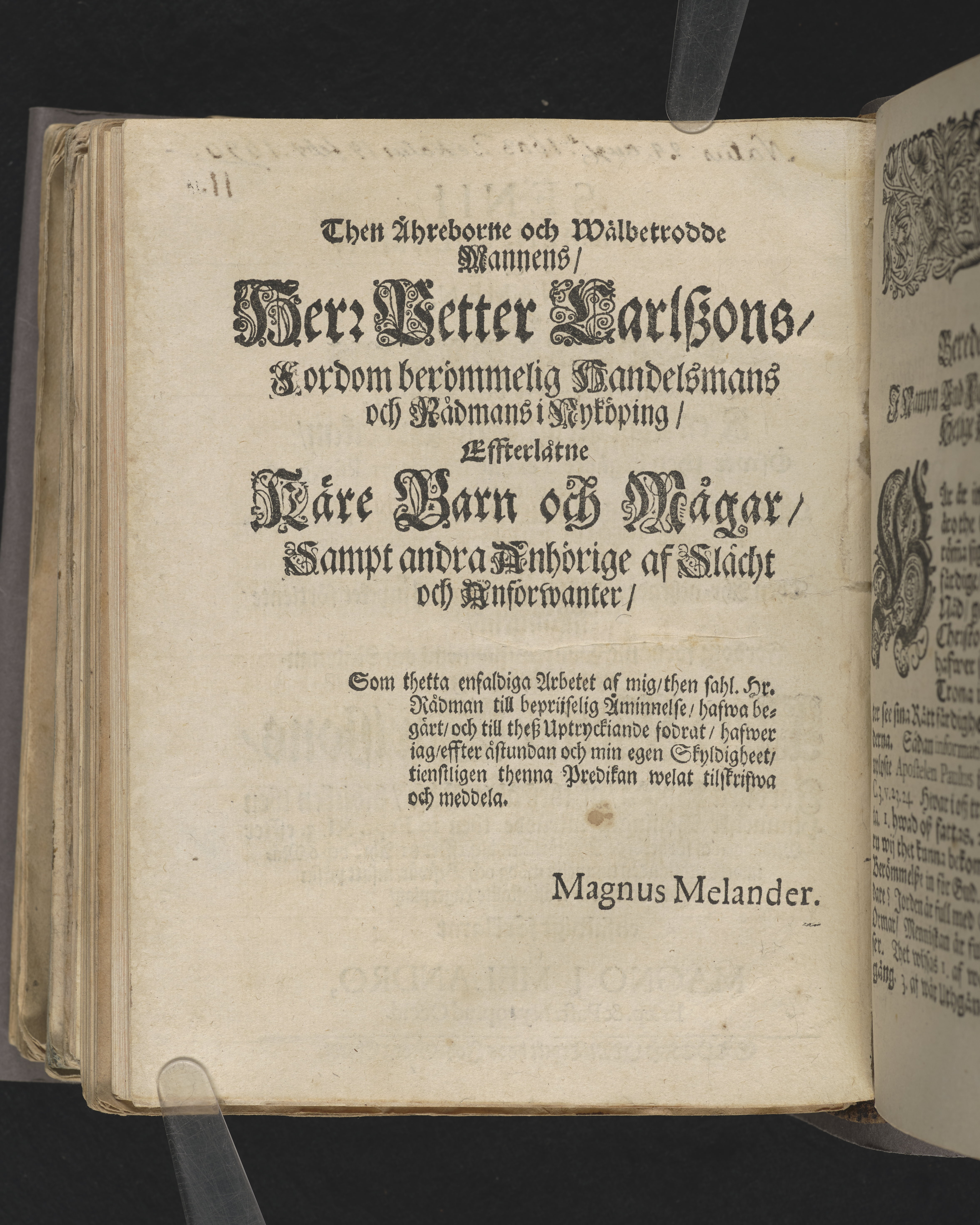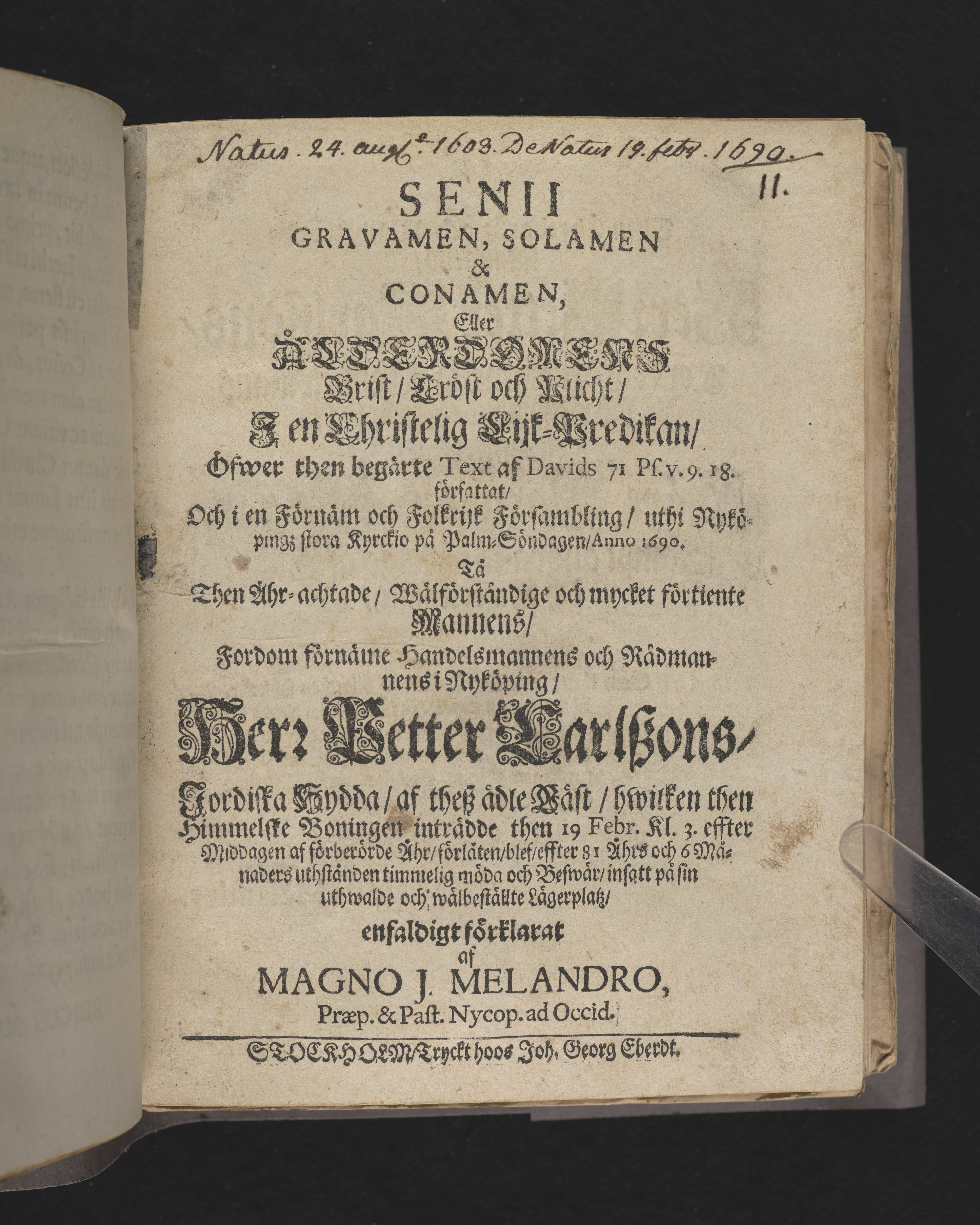 Senii gravamen, solamen & conamen, eller ålderdomens brist, tröst och plicht, i en christelig lijk-predikan ... vthi Nyköpingz stora kyrkio på palm-söndagen, anno 1690. Tå ... handelsmannens och rådmannens i Nyköping, Herr Petter Carlszons, jordiska hydda ... förlåten blef ... förklarat af Magno J. Melandro ... Stockholm, tryckt hoos Joh. Georg Eberdt.