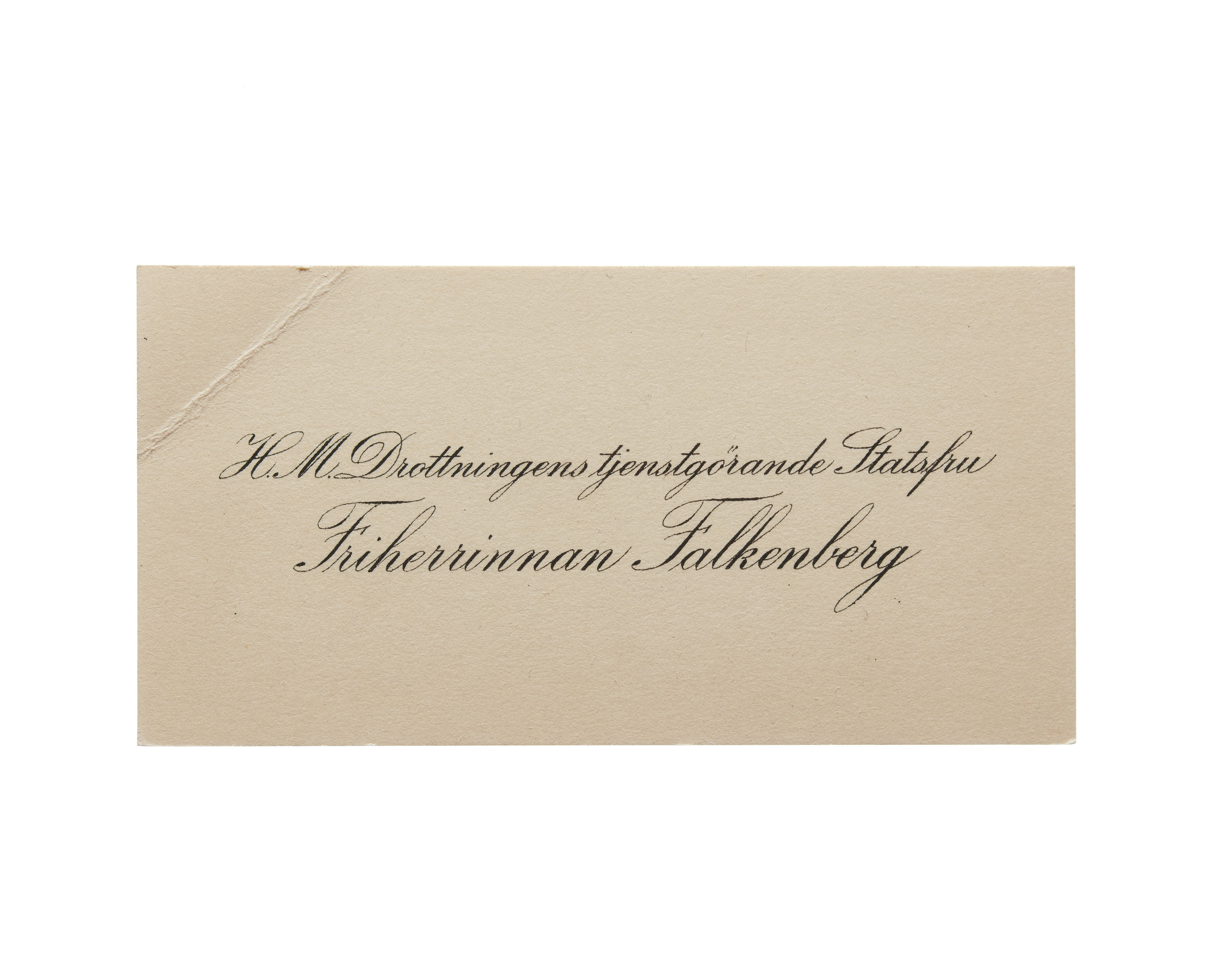 Visitkort från H. M. Drottnings tjenstgörande Statsfru Friherrinnan Falkenberg, f. Åkerhielm.