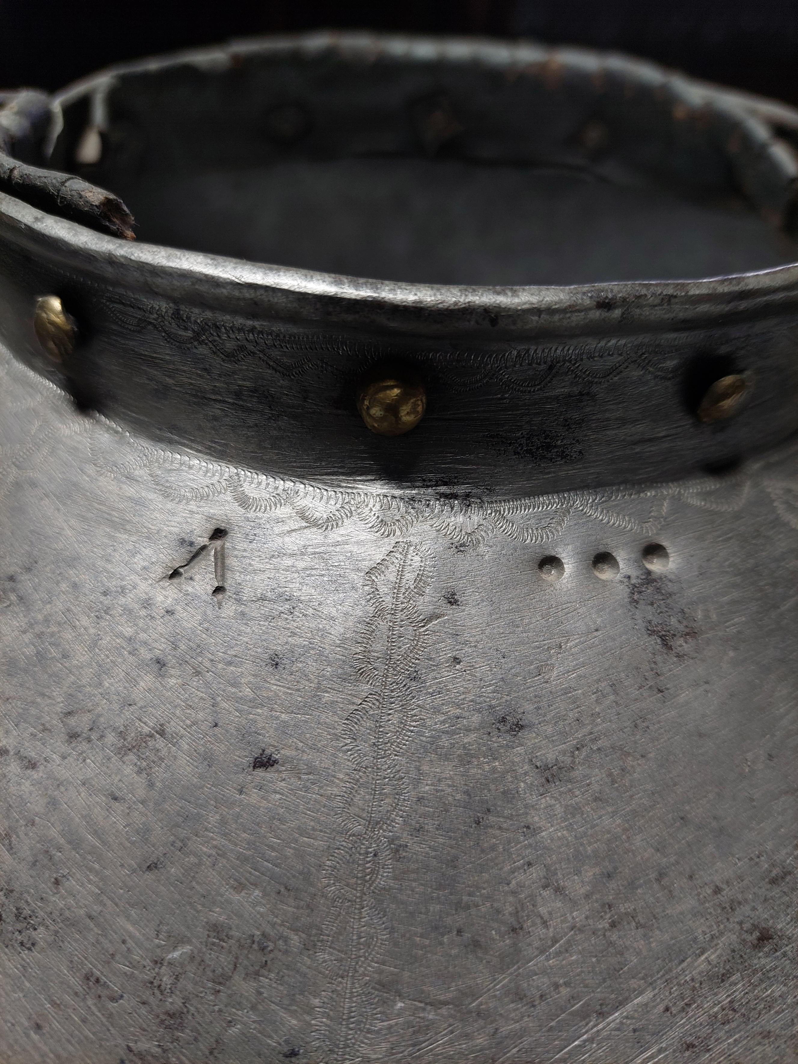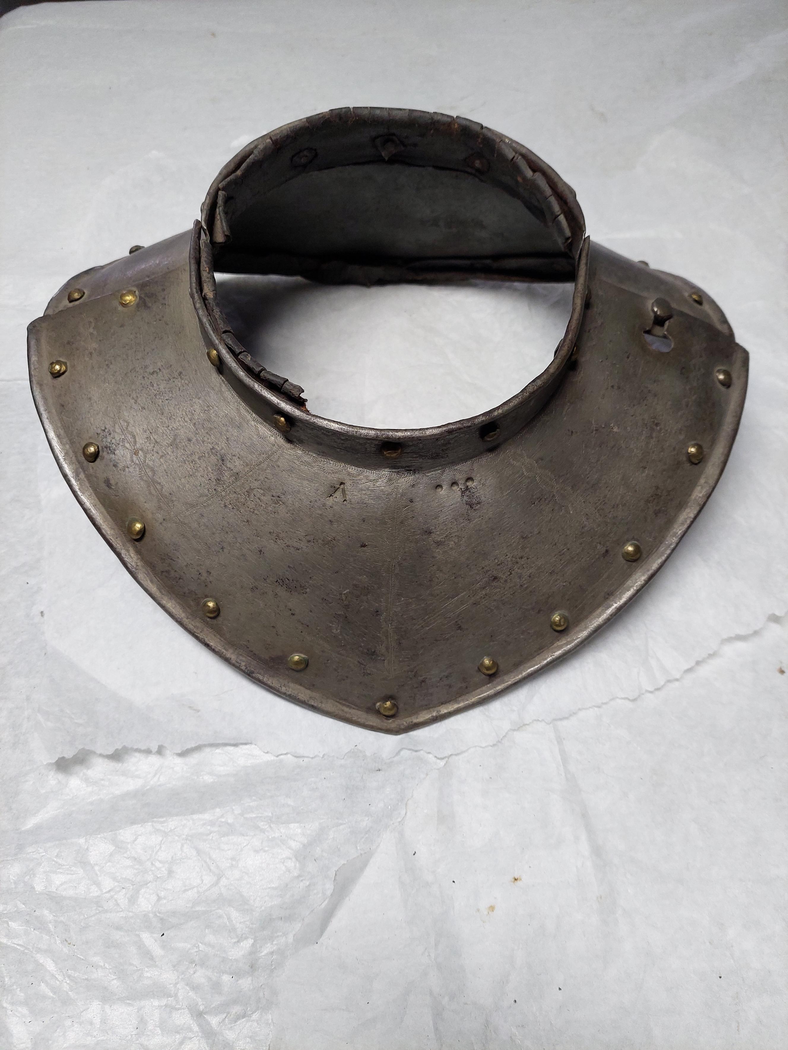 KOMPLETTERANDE BESKRIVNING. Förefaller ha varit svärtad ursprungligen. Förhållandevis tjock plåt (1,5-2 mm). Har likartad dekor som rustning 6814 och kragen till detta garnityr är till utformning, teknik och proportioner snarlikt.