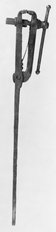 Ur bössmakare Johan Rings verkstad. Skruvstycke av stål. Ett inre längre, nertill med märla och upptill med beslag och låssprint i bänken fastsatt stycke. Ett yttre stycke, i änden nertill med grov nit länkat till det inre styckets förstärkta mittparti. Upptill är styckena böjda inåt med platta mot varandra ställda kanter (käftar). Ca 35 mm under styckenas övre kant en horisontell gängad axel, diam 23 mm, skruvad genom hål i de bägge styckena. I axelns yttre ände vev av kula med genomdragen stålstång. Mellan styckena en nertill med två nitar fäst stålfjäder, b 22 mm, som trycker styckena ifrån varandra. Käftarnas bredd 80 mm.