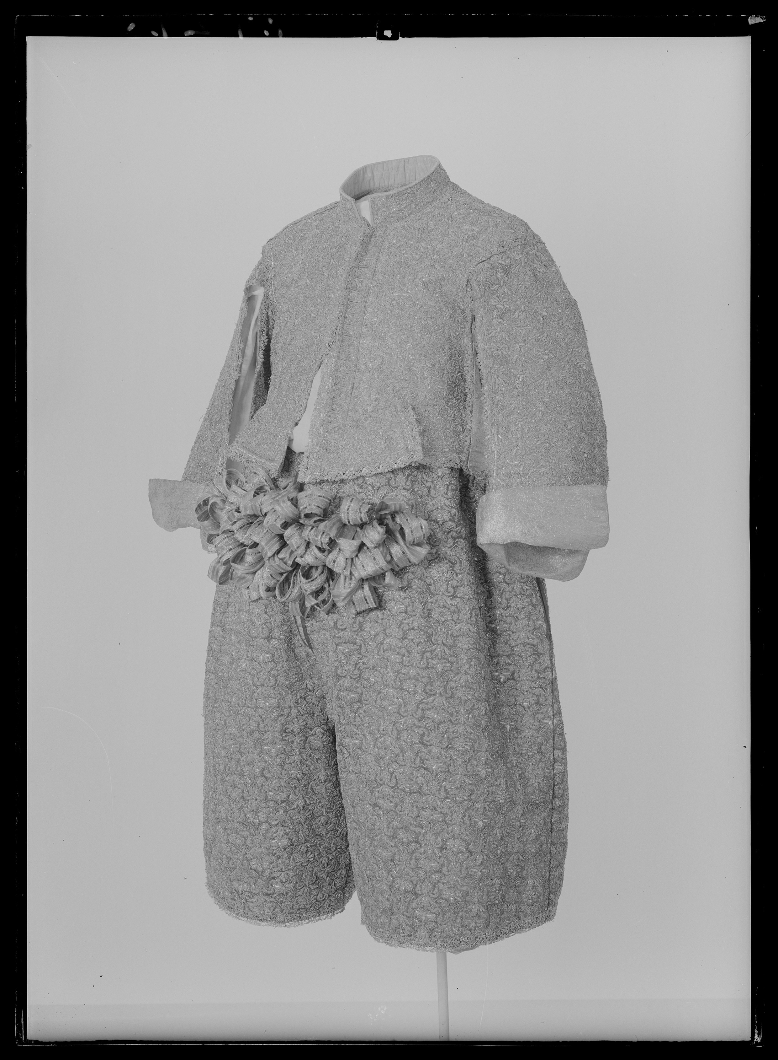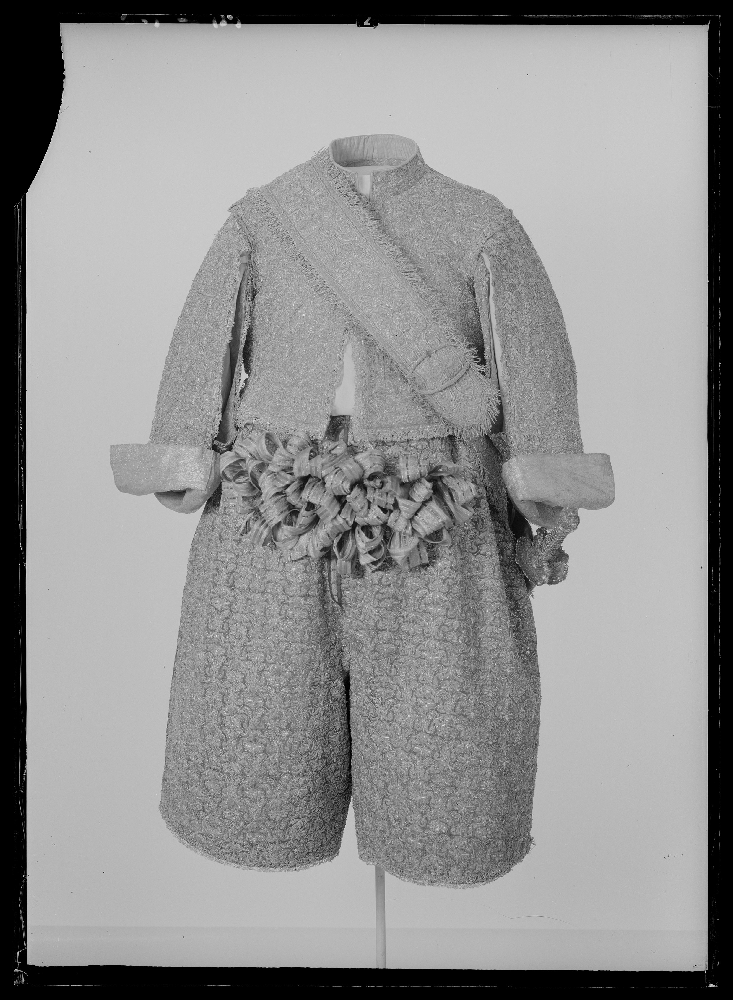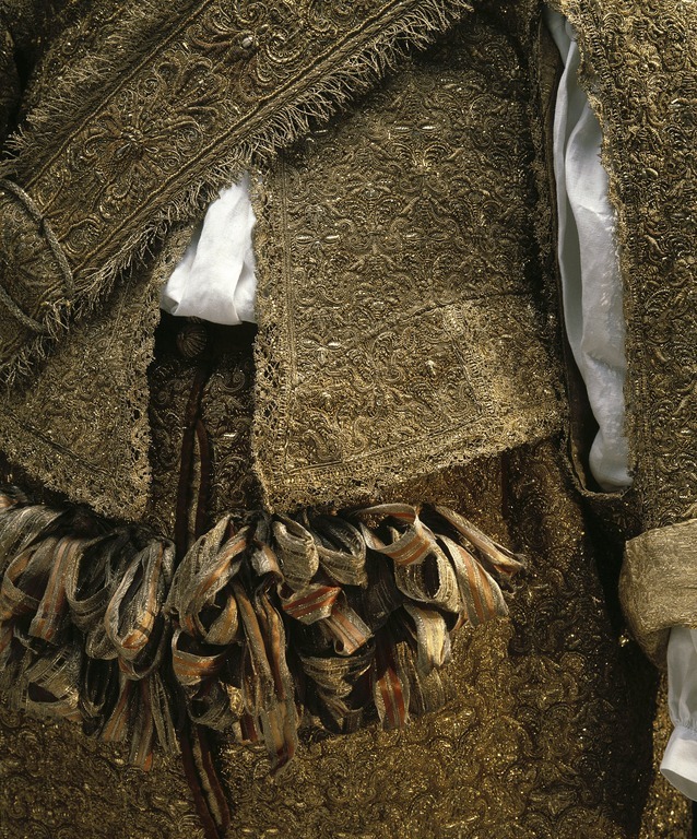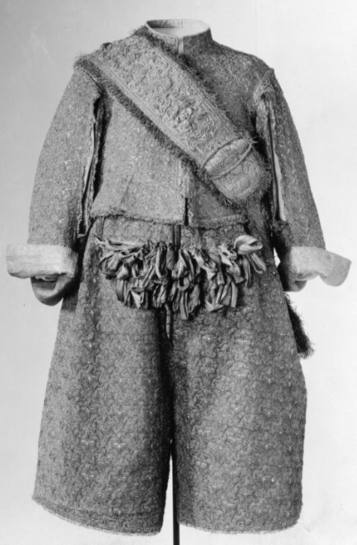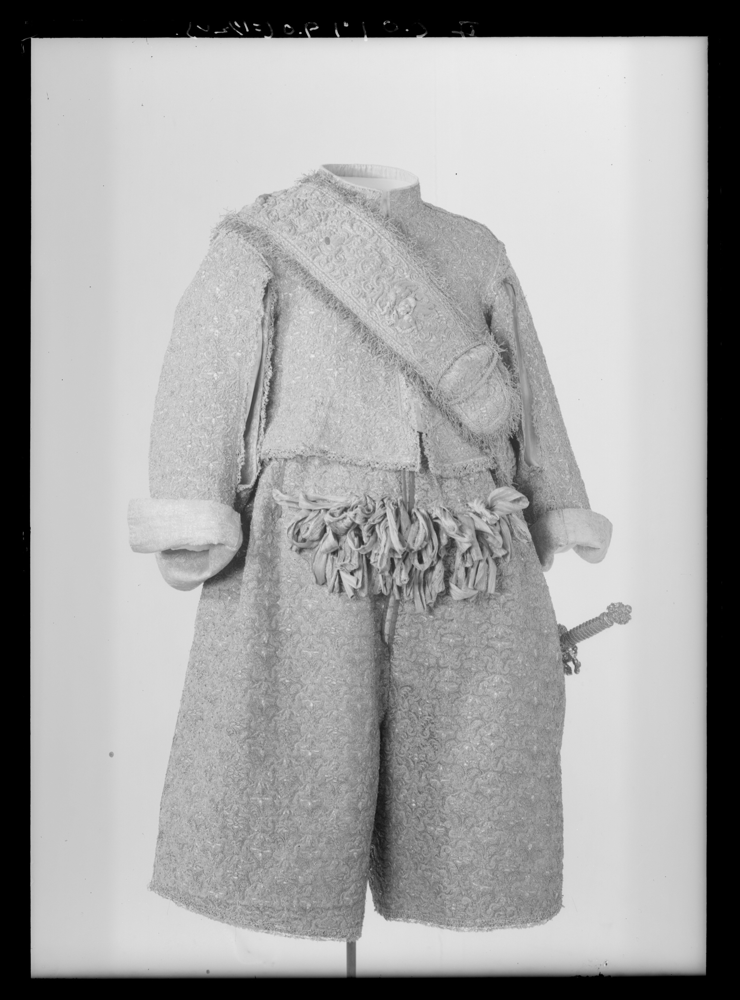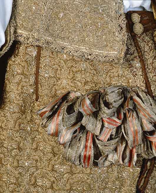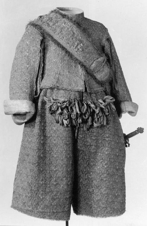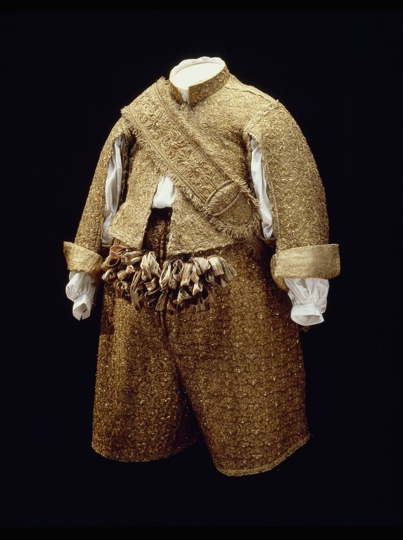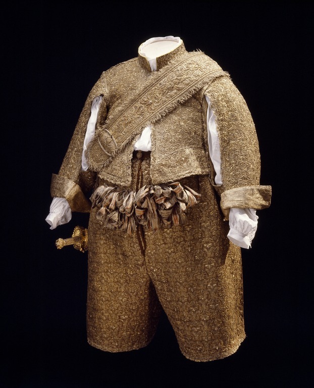 Förmodligen tillverkad i Frankrike. Buren av Karl X Gustav (1622-1660) i samband med kröningen. Dräkten beställdes 1654 från Frankrike, genom Magnus Gabriel de la Gardie, inför festligheterna vid Karl X Gustavs kröning och efterförljande bröllop. Sex dräkter levererades, och den här beskrivna var den högst värderade. Ursprungligen var den försedd med 140 diamantknappar, vilka änkedrottningen Hedvig Eleonora tog hand om efter kungens död. Hon lät också sprätta bort merparten av guldspetsarna för att använda dem till utrustningen för kritzryttaren i makens sorgetåg. Till dräktens kompletta utrustning hörde 1654: sko- och strumpeband av gllenduk, högröda taftunderbyxor och silkesstrumpor, ett guldbroderat gehäng, hattband av guld, handskar med gllenduksfodrade kragar, en panasch med fjädrar i förgerna coleur de feu, filemort och aurora samt ett par förgyllda sporrar och en värja med dito fäste. I 1671 års inventarium står: "En Klädningh som är gjord till H:K:Maij:tz Lÿcklige Cröningh" och sägs omfatta följande plagg, nämligen kappa, tröja, byxor, knäband, skorosor och handskar. I 1654 års klädkammarräkning förtecknas dräkten under nr 3 på följande sätt: 1 klädning och kappa av filemort (gul) oskuren sammet helt broderad med guld och med 140 diamantknappar till tröjan och byxorna, 1 par strumpeband och skoband av rik guldbrokad helt broderade med guld, 1 par underbyxor av incarnadie (rosa) taft och silkesstrumpor av samma färg, 1 guldbroderat med guld och stofferade med guldbrokad, 1 panasch (plym) av couleur de feu (röda), filemort och aurorafärgade fjädrar, 1 par förgyllda sporrar och 1 värja med förgyllt fäste. Nu finns endast tröjan och byxorna i behåll i sitt skick som dräkt, medan den stora rundskurna kappan inte längre omtalas i inventarierna efter 1691. 1704 års inv. säger inget om kappan men den finns, förvandlad till mässhake och altarbrun i Riddarsholmskyrkan. Skänkta dit den 1 april 1705 av Riksänkedrottningen Hedvig Eleonora. Mässhaken: Gjord av tjock gul rips (OBS! Fel! Enl. Sveriges kyrkor skall vara sammet, oskuren), ett material som skiljer sig från såväl tröjans som byxornas. Broderad med mönster i guld på samma sätt som på tröjan och byxorna. Mönsterrapport: 8 x 8 cm. Såväl fram- som bakstycket består av 2 hopsydda våder av c:a 40 cm bredd, max. längd ca 90 cm. Drottningens namnchiffer HRS samt ANNO 1705 har broderats på respektive fram- och baksidorna. Tröjan är sydd av vad man med ett modernt namn skulle beteckna som guldlamé, som helt täckts med guldbroderi. Den är av s.k. innocenttyp, d.v.s. ett relativt kort livplagg med planschetter inlagda som styvnad i framstyckenas snibbiga främre hörn, försett med 10 små skört, ståndkrage och relativt korta ärmar med öppna sömmar framtill. På vänster framstycke har 17 st 2 cm knapphål sytts med jämna mellanrum ca 1 cm från kanten. Vad man bör lägga märke till är att tröjan sytts av ett större antal stycken som skarvats samman. Förmodligen har plagget antingen redan varit i tidigare bruk före kröningen 1654 och blivit något förtrångt eller också har man misslyckats med passformen vid tillfället i fråga och har varit tvungen att göra en del ändringar. Möjligheten att tröjan kan ha förändrats vid något senare tillfälle kan man inte heller bortse ifrån. Bottenmaterialet består nämligen av två skilda lamétyger, ett något gulare i de smalare skarvarna och f.ö. ett något rödare (det egentliga materialet?). Tröjan är huvudsakligen skuren i 2 framstycken, 2 ryggstycken samt 2 ärmstycken till vardera ärmen. 10 skört samt krage. Man kan alltså visa att framstyckena måste skarvas med remsor av det gulare tyget utefter de raka framkanterna samt även i sidsömmen. I halsringningen har en liten kil satts in mellan det vertikala skarvstycket fram och axelsömmen. Bakstyckena ha fått var sin vertikala skarv (knappt 4 cm bred) mitt i ryggen på ömse sidor om mittsömmen. Utefter ärmarnas öppna långsidor har vertikala stycken fogats till och nere vid ärmens avslutning har på undersidans stycken en smal horisontell remsa sytts. På överärmstycket däremot har en horisontell skarv satts in överst uppe vid ärmringningen. Kragen är också uppklippt baktill och försedd med 2 små skarvstycken. Det 3:e skörtet på varje sida är eventuellt nysytt, ty dess färg förefaller ljusare, broderiet är klumpigare och kompositionen annorlunda mot alla de övriga 8 som exempelvis har den lilla blomman nedtill i mitten. Mönstret har i någon mån missuppfattats i de senare sydda styckena så har man t.ex. lagt krepiner och trådar i båge i stället för att klippa av dem och börja med en ny tråd. Ärmarnas nedersta parti, mellan 3,5-7 cm är lämnat utan broderi, beroende på att det ju skulle vikas till uppslag. Ärmarna har inga knappar eller knapphål intill sprunden vid handlederna. I midjan sitter på insidan under skörten 8 st små tampar med vardera 2 hål för byxornas hakar. Guldlamén har en vådbredd av minst 31 cm (utan stad) (45x15 tr/cm2). Varje inslag består av gult silke med 2 och 2 smala trinda guldtenar på rätan. Analysresultat: Metalltråd tvinnad med textiltråd, huvudbeståndsdelar: Silver xxx Guld x Koppar xxx Zink 0 Det yttäckande läggsömsbroderiet består av kantiljer av trinda tenar och (platta) lan ( av olika bredd), snodder med silkeskärna omtvinnade med guldlan, strängar dragna av trinda tenar av guld eller silver som stansats ut i spiraler (eller öglor) och manglats platta på halva sidan, här benämnda spiral- eller paljett strängar (i brist på befintlig terminologi) och 2 och 2 tätt liggande strängar med trinda, smala guldtenar virade runt ett bredare guldanklätt snöre etc. Broderiet är nersytt med gult silke. Mönsterraporten är 6,5x6,5 cm. Mönstret: Ur 2 från varandra utåtböjda palmkvistar som strax nedanför mitten sammanhålles med en uppåtbö