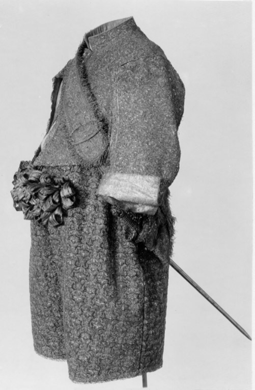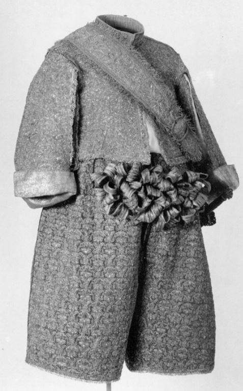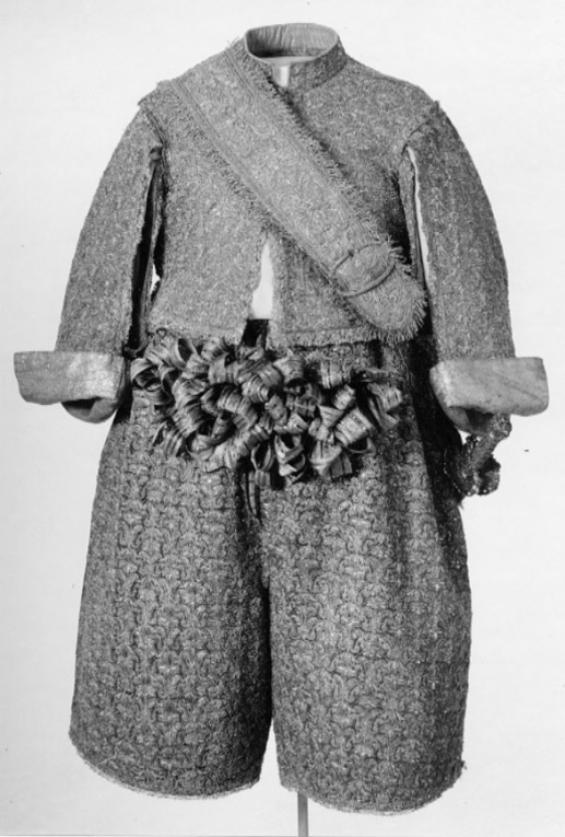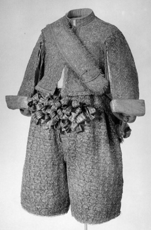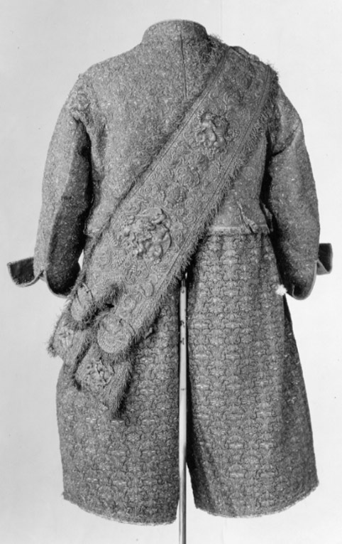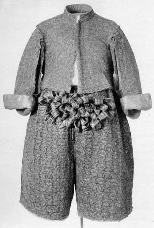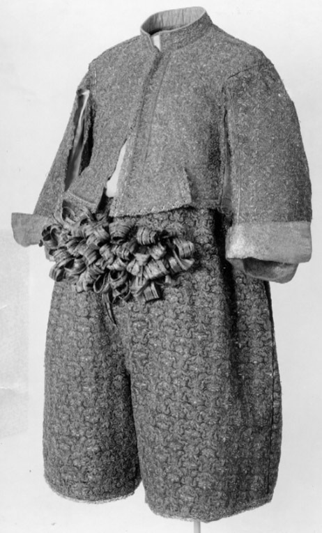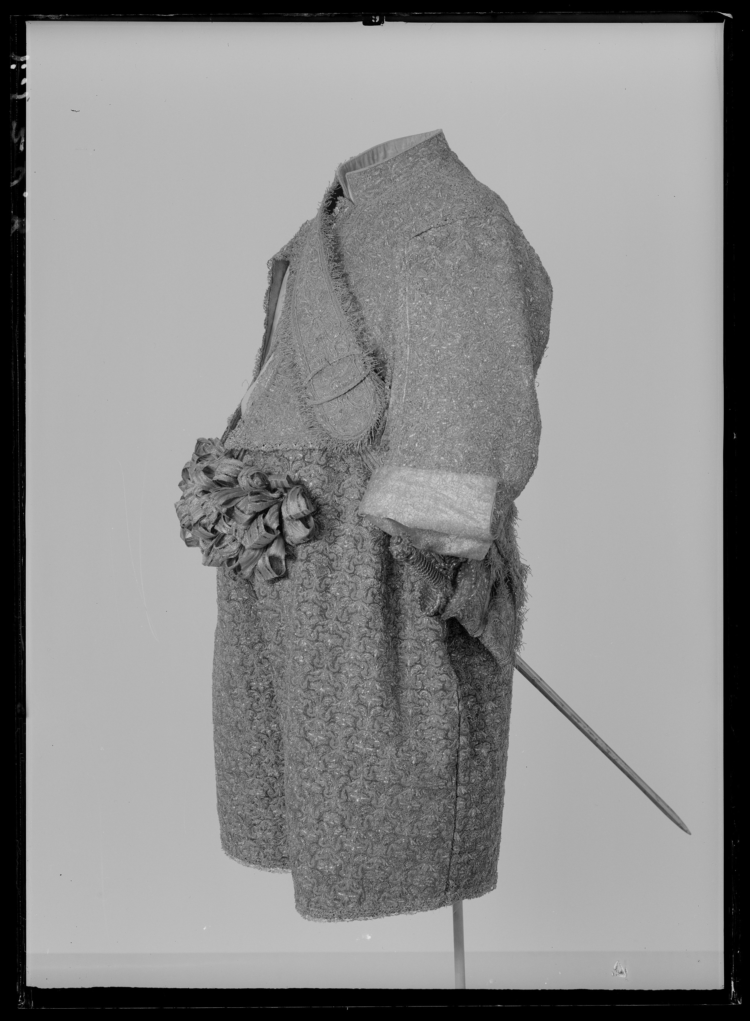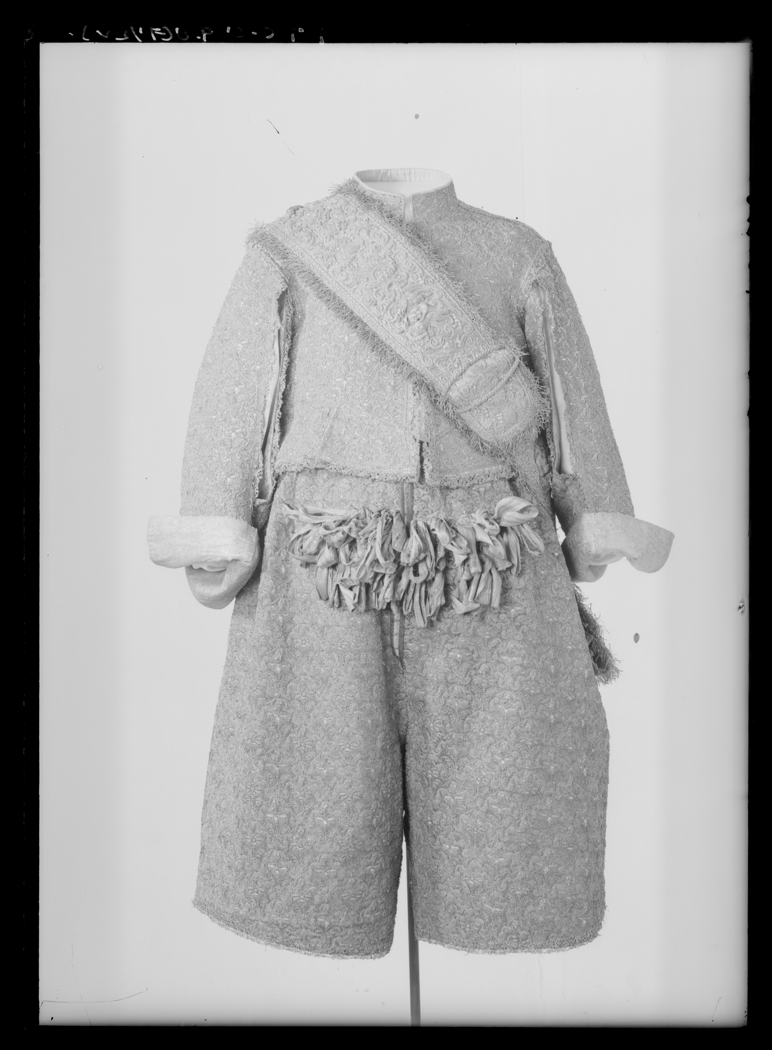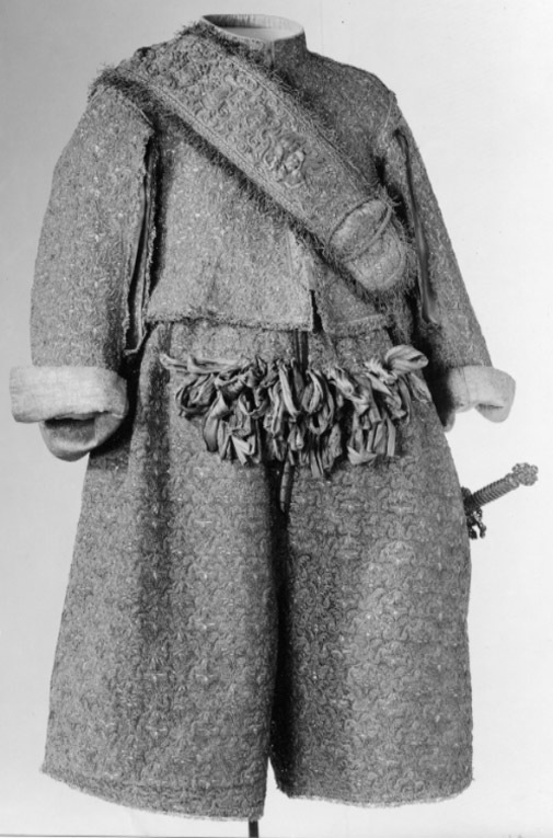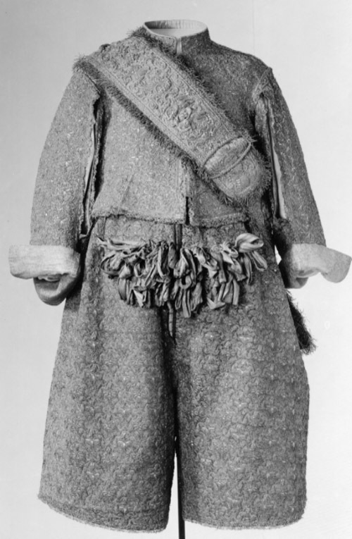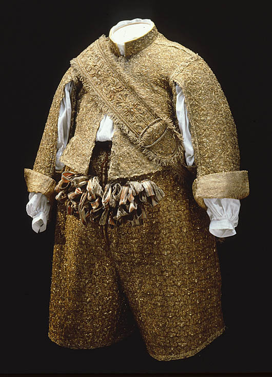 Förmodligen tillverkad i Frankrike. Buren av Karl X Gustav (1622-1660) i samband med kröningen. Dräkten beställdes 1654 från Frankrike, genom Magnus Gabriel de la Gardie, inför festligheterna vid Karl X Gustavs kröning och efterförljande bröllop. Sex dräkter levererades, och den här beskrivna var den högst värderade. Ursprungligen var den försedd med 140 diamantknappar, vilka änkedrottningen Hedvig Eleonora tog hand om efter kungens död. Hon lät också sprätta bort merparten av guldspetsarna för att använda dem till utrustningen för kritzryttaren i makens sorgetåg. Till dräktens kompletta utrustning hörde 1654: sko- och strumpeband av gllenduk, högröda taftunderbyxor och silkesstrumpor, ett guldbroderat gehäng, hattband av guld, handskar med gllenduksfodrade kragar, en panasch med fjädrar i förgerna coleur de feu, filemort och aurora samt ett par förgyllda sporrar och en värja med dito fäste. I 1671 års inventarium står: "En Klädningh som är gjord till H:K:Maij:tz Lÿcklige Cröningh" och sägs omfatta följande plagg, nämligen kappa, tröja, byxor, knäband, skorosor och handskar. I 1654 års klädkammarräkning förtecknas dräkten under nr 3 på följande sätt: 1 klädning och kappa av filemort (gul) oskuren sammet helt broderad med guld och med 140 diamantknappar till tröjan och byxorna, 1 par strumpeband och skoband av rik guldbrokad helt broderade med guld, 1 par underbyxor av incarnadie (rosa) taft och silkesstrumpor av samma färg, 1 guldbroderat med guld och stofferade med guldbrokad, 1 panasch (plym) av couleur de feu (röda), filemort och aurorafärgade fjädrar, 1 par förgyllda sporrar och 1 värja med förgyllt fäste. Nu finns endast tröjan och byxorna i behåll i sitt skick som dräkt, medan den stora rundskurna kappan inte längre omtalas i inventarierna efter 1691. 1704 års inv. säger inget om kappan men den finns, förvandlad till mässhake och altarbrun i Riddarsholmskyrkan. Skänkta dit den 1 april 1705 av Riksänkedrottningen Hedvig Eleonora. Mässhaken: Gjord av tjock gul rips (OBS! Fel! Enl. Sveriges kyrkor skall vara sammet, oskuren), ett material som skiljer sig från såväl tröjans som byxornas. Broderad med mönster i guld på samma sätt som på tröjan och byxorna. Mönsterrapport: 8 x 8 cm. Såväl fram- som bakstycket består av 2 hopsydda våder av c:a 40 cm bredd, max. längd ca 90 cm. Drottningens namnchiffer HRS samt ANNO 1705 har broderats på respektive fram- och baksidorna. Tröjan är sydd av vad man med ett modernt namn skulle beteckna som guldlamé, som helt täckts med guldbroderi. Den är av s.k. innocenttyp, d.v.s. ett relativt kort livplagg med planschetter inlagda som styvnad i framstyckenas snibbiga främre hörn, försett med 10 små skört, ståndkrage och relativt korta ärmar med öppna sömmar framtill. På vänster framstycke har 17 st 2 cm knapphål sytts med jämna mellanrum ca 1 cm från kanten. Vad man bör lägga märke till är att tröjan sytts av ett större antal stycken som skarvats samman. Förmodligen har plagget antingen redan varit i tidigare bruk före kröningen 1654 och blivit något förtrångt eller också har man misslyckats med passformen vid tillfället i fråga och har varit tvungen att göra en del ändringar. Möjligheten att tröjan kan ha förändrats vid något senare tillfälle kan man inte heller bortse ifrån. Bottenmaterialet består nämligen av två skilda lamétyger, ett något gulare i de smalare skarvarna och f.ö. ett något rödare (det egentliga materialet?). Tröjan är huvudsakligen skuren i 2 framstycken, 2 ryggstycken samt 2 ärmstycken till vardera ärmen. 10 skört samt krage. Man kan alltså visa att framstyckena måste skarvas med remsor av det gulare tyget utefter de raka framkanterna samt även i sidsömmen. I halsringningen har en liten kil satts in mellan det vertikala skarvstycket fram och axelsömmen. Bakstyckena ha fått var sin vertikala skarv (knappt 4 cm bred) mitt i ryggen på ömse sidor om mittsömmen. Utefter ärmarnas öppna långsidor har vertikala stycken fogats till och nere vid ärmens avslutning har på undersidans stycken en smal horisontell remsa sytts. På överärmstycket däremot har en horisontell skarv satts in överst uppe vid ärmringningen. Kragen är också uppklippt baktill och försedd med 2 små skarvstycken. Det 3:e skörtet på varje sida är eventuellt nysytt, ty dess färg förefaller ljusare, broderiet är klumpigare och kompositionen annorlunda mot alla de övriga 8 som exempelvis har den lilla blomman nedtill i mitten. Mönstret har i någon mån missuppfattats i de senare sydda styckena så har man t.ex. lagt krepiner och trådar i båge i stället för att klippa av dem och börja med en ny tråd. Ärmarnas nedersta parti, mellan 3,5-7 cm är lämnat utan broderi, beroende på att det ju skulle vikas till uppslag. Ärmarna har inga knappar eller knapphål intill sprunden vid handlederna. I midjan sitter på insidan under skörten 8 st små tampar med vardera 2 hål för byxornas hakar. Guldlamén har en vådbredd av minst 31 cm (utan stad) (45x15 tr/cm2). Varje inslag består av gult silke med 2 och 2 smala trinda guldtenar på rätan. Analysresultat: Metalltråd tvinnad med textiltråd, huvudbeståndsdelar: Silver xxx Guld x Koppar xxx Zink 0 Det yttäckande läggsömsbroderiet består av kantiljer av trinda tenar och (platta) lan ( av olika bredd), snodder med silkeskärna omtvinnade med guldlan, strängar dragna av trinda tenar av guld eller silver som stansats ut i spiraler (eller öglor) och manglats platta på halva sidan, här benämnda spiral- eller paljett strängar (i brist på befintlig terminologi) och 2 och 2 tätt liggande strängar med trinda, smala guldtenar virade runt ett bredare guldanklätt snöre etc. Broderiet är nersytt med gult silke. Mönsterraporten är 6,5x6,5 cm. Mönstret: Ur 2 från varandra utåtböjda palmkvistar som strax nedanför mitten sammanhålles med en uppåtbö