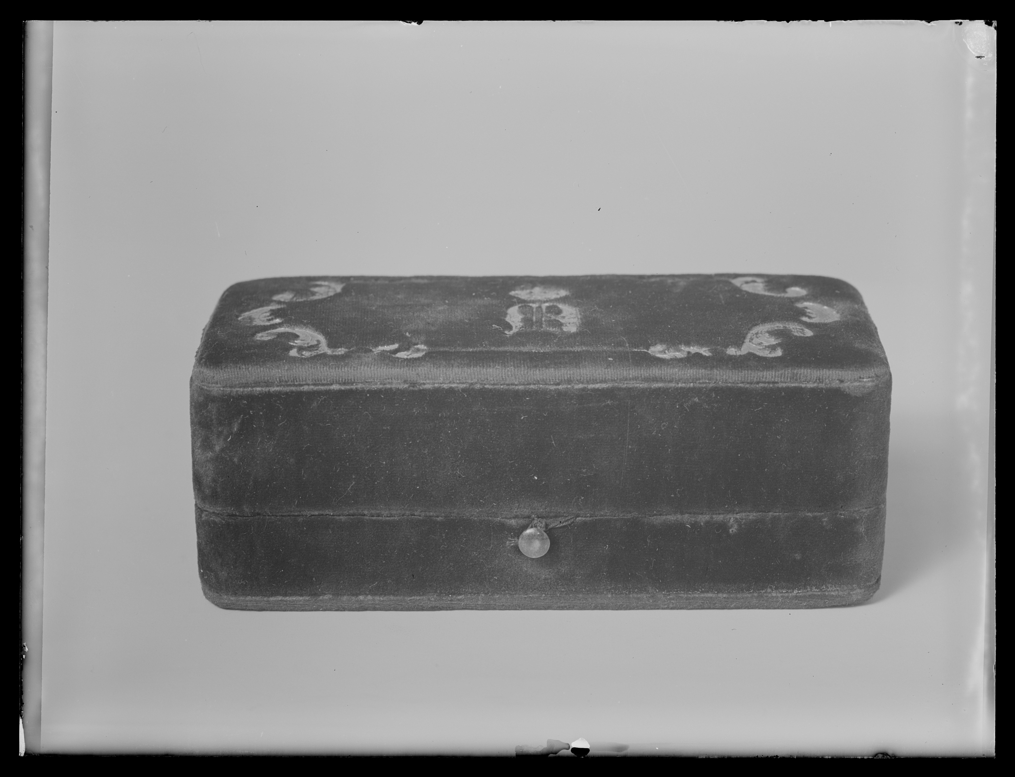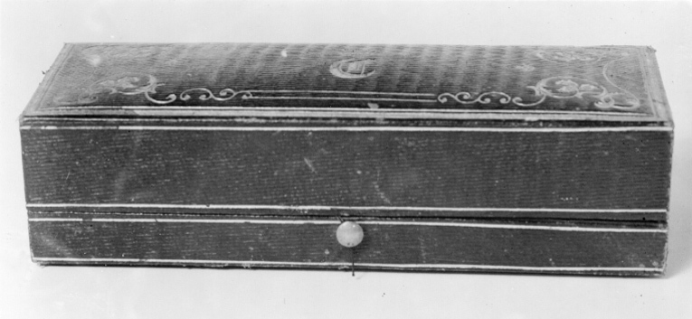Rektangulärt etui av trä, utvändigt klätt med mörkblå sammet, påundersidan violett papper. På lockets ovansida dekor i guldpressning,ram av linjer på långsidorna och bladornament i hörnen och påkortsidorna. Mitt på locket Oskar I:s krönta namnchiffer,ett anglosachsiskt O. Fjäderlås av stål. Locket invändigt klätt med vittsiden, i underdelen fast insats klädd med karminröd sammet, urtag förstampen. Mellan lock och underdel två vita sidenband.
