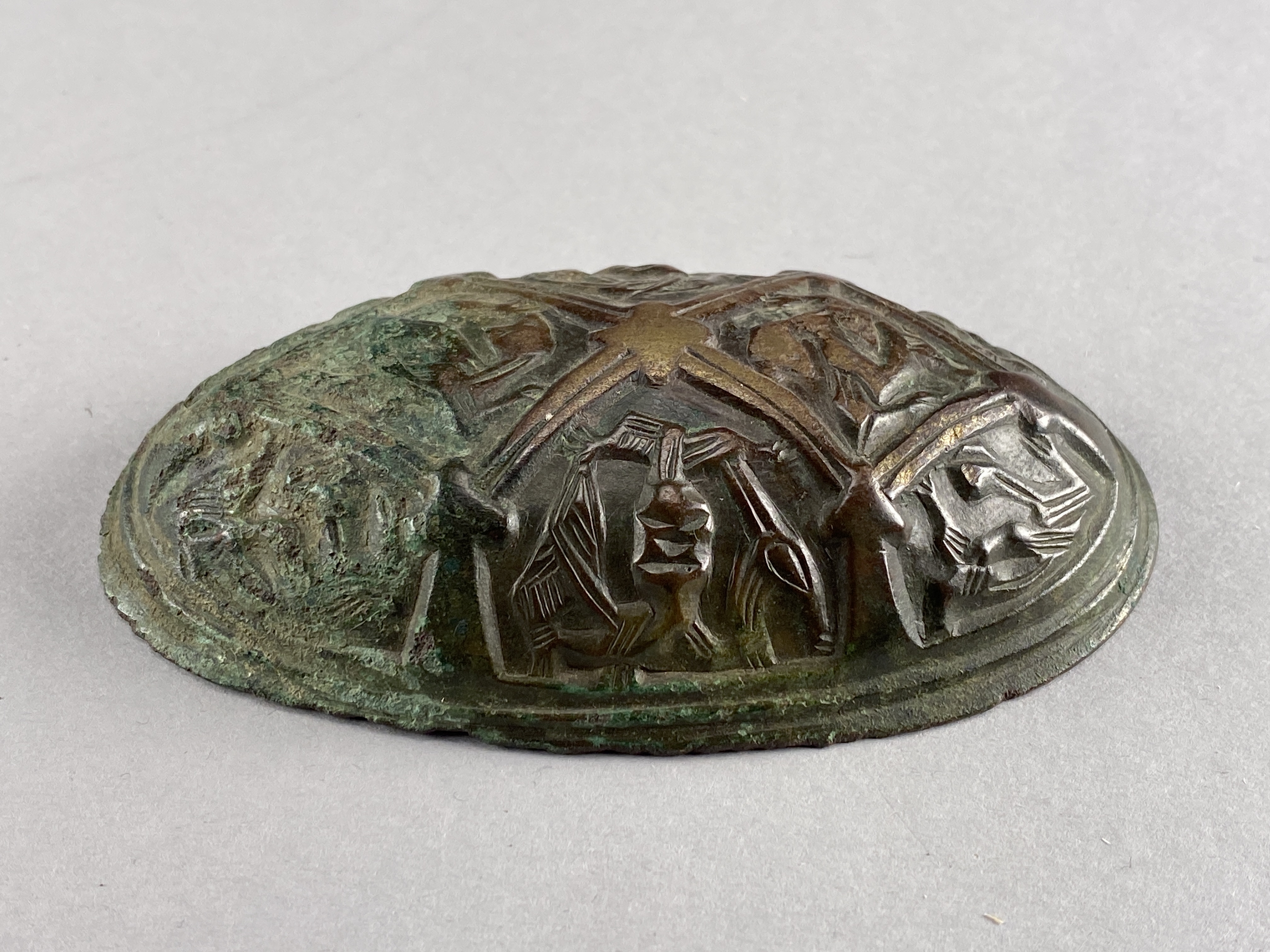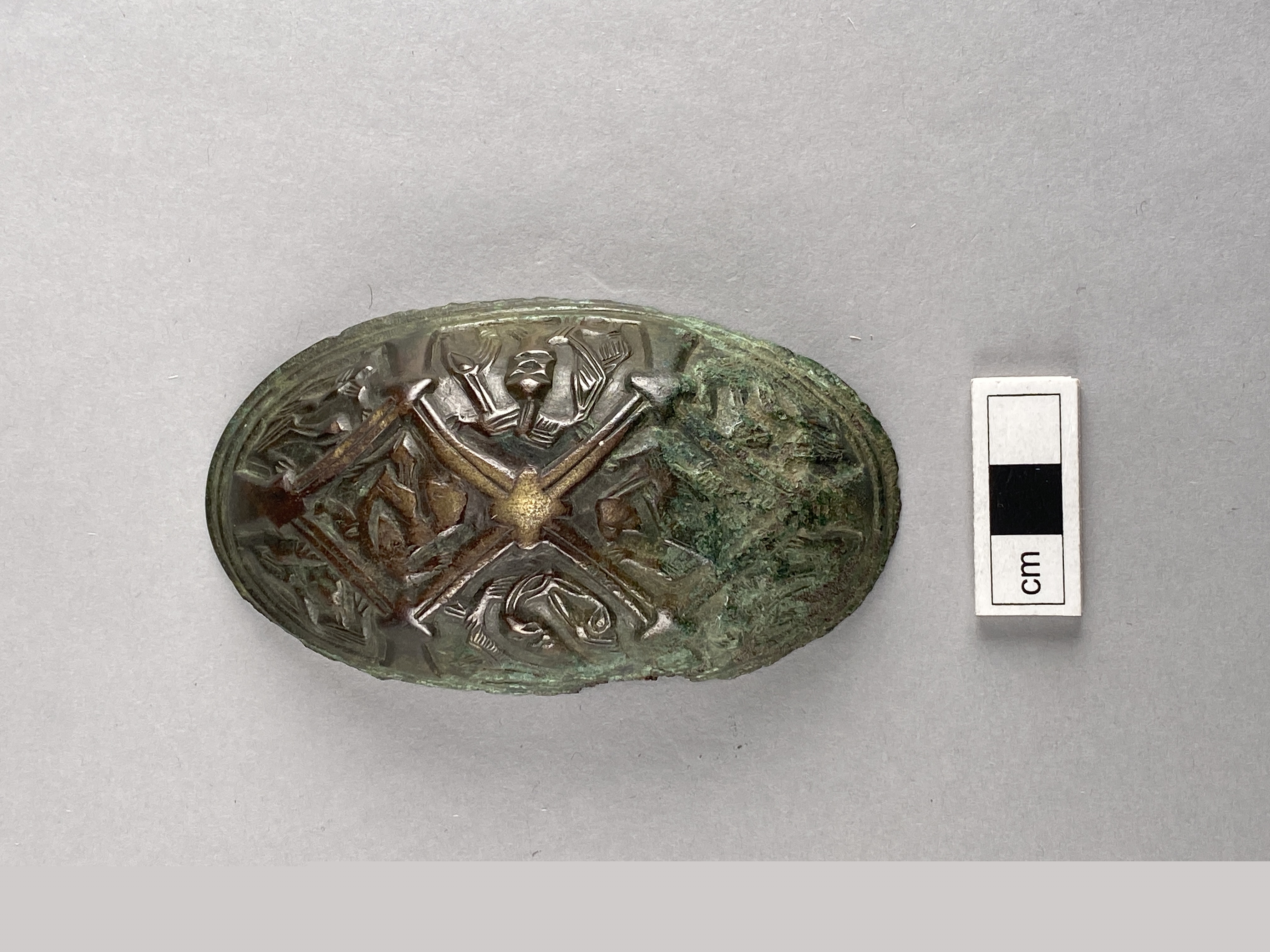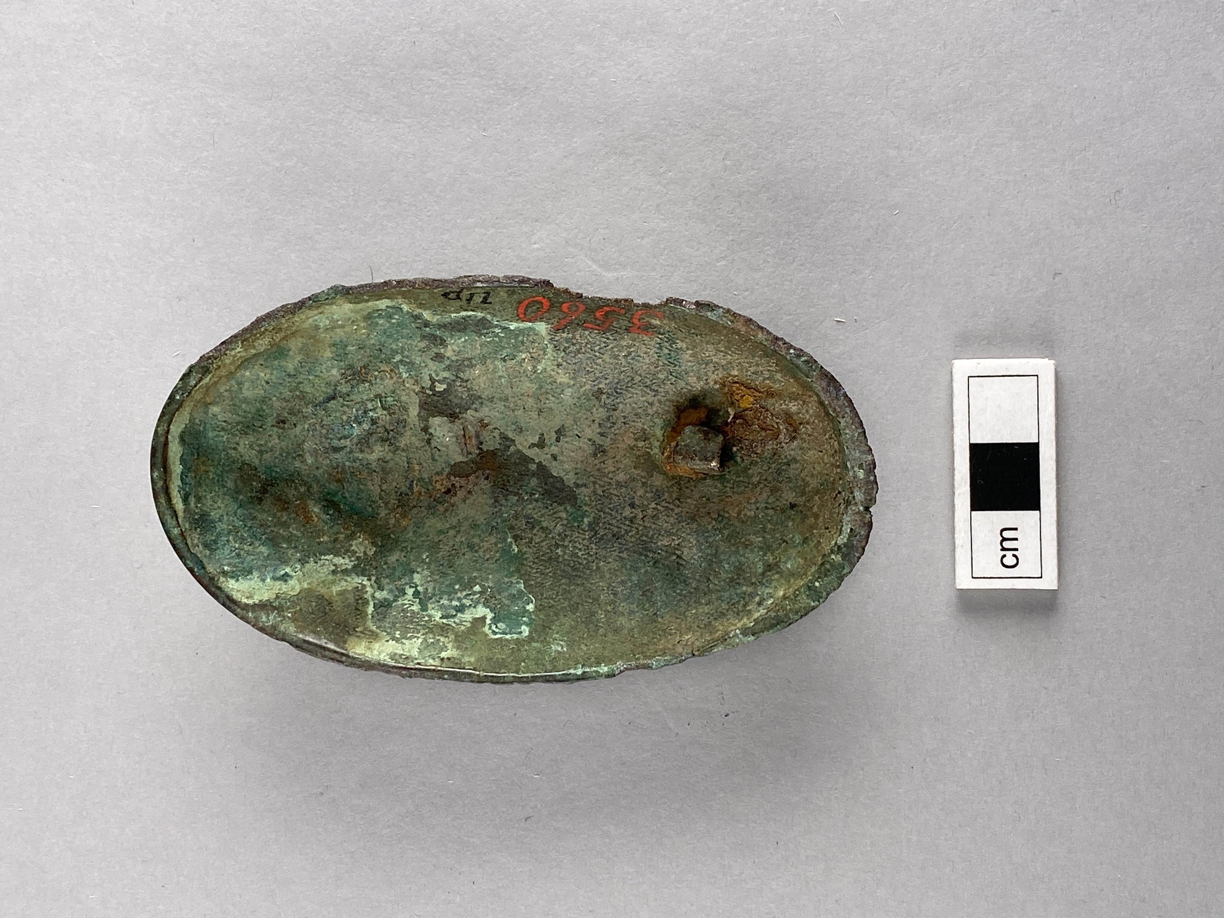 Oval, enskalig spännbuckla utan knoppar. Nålen saknas. Rester av textil finns kvar inuti.