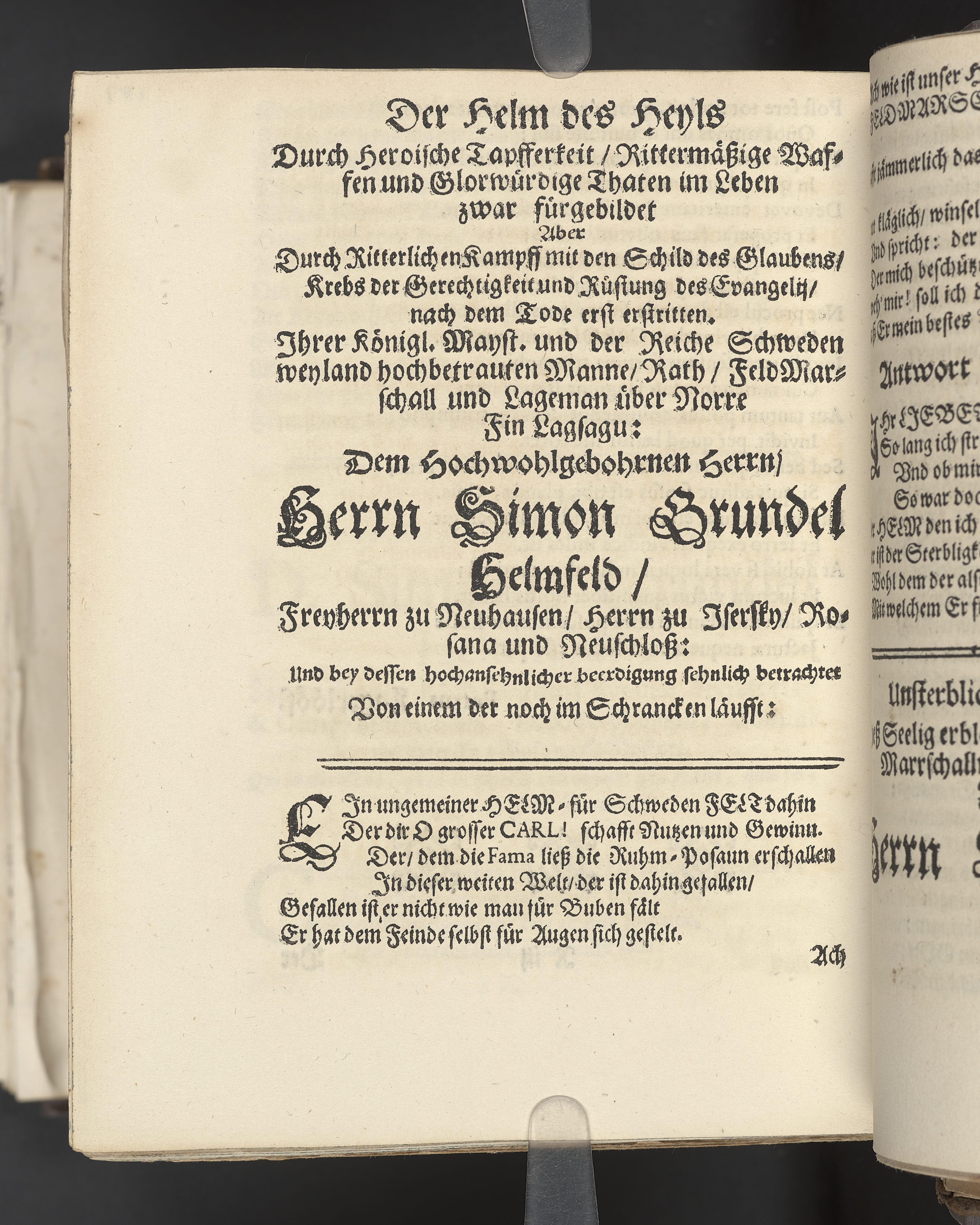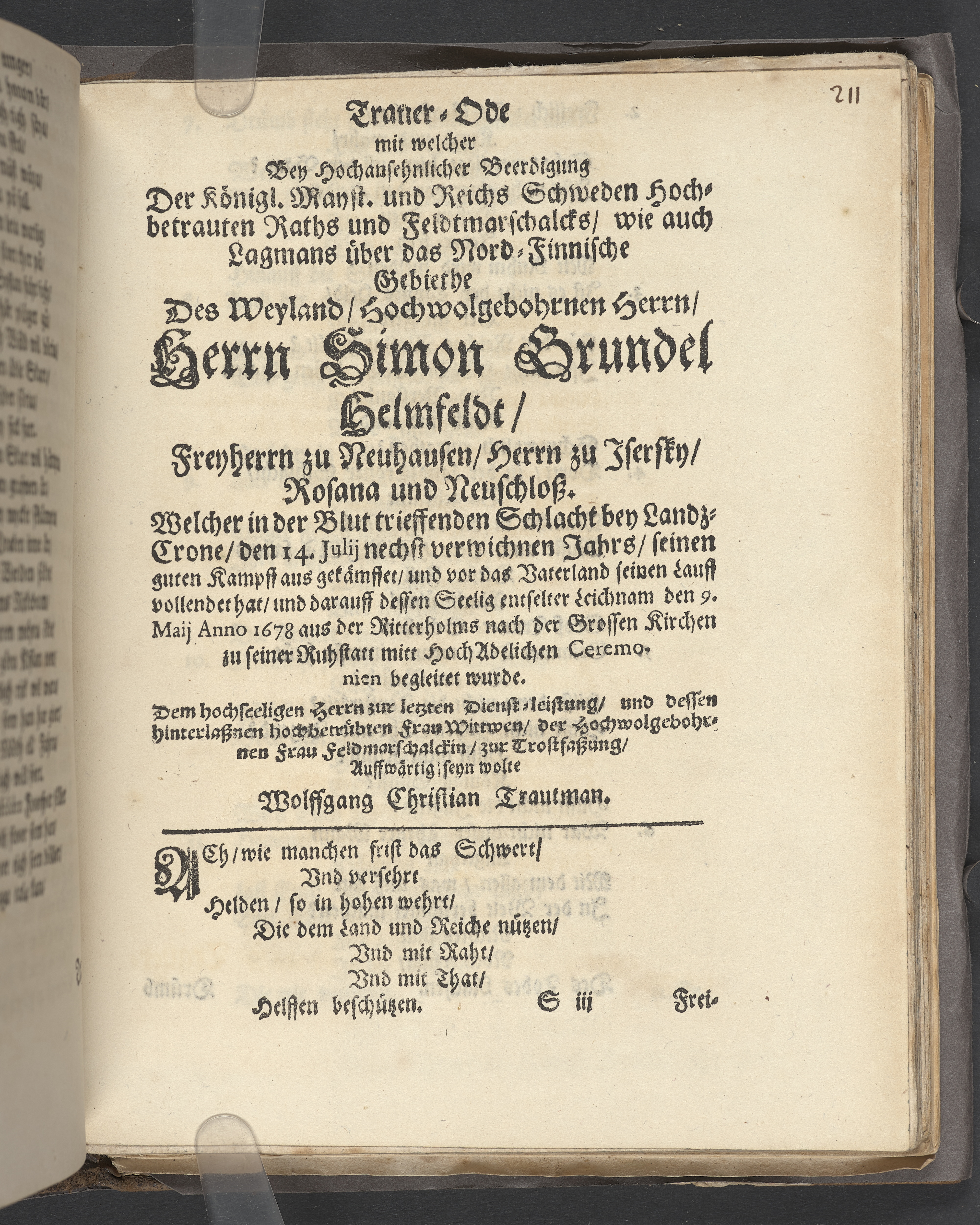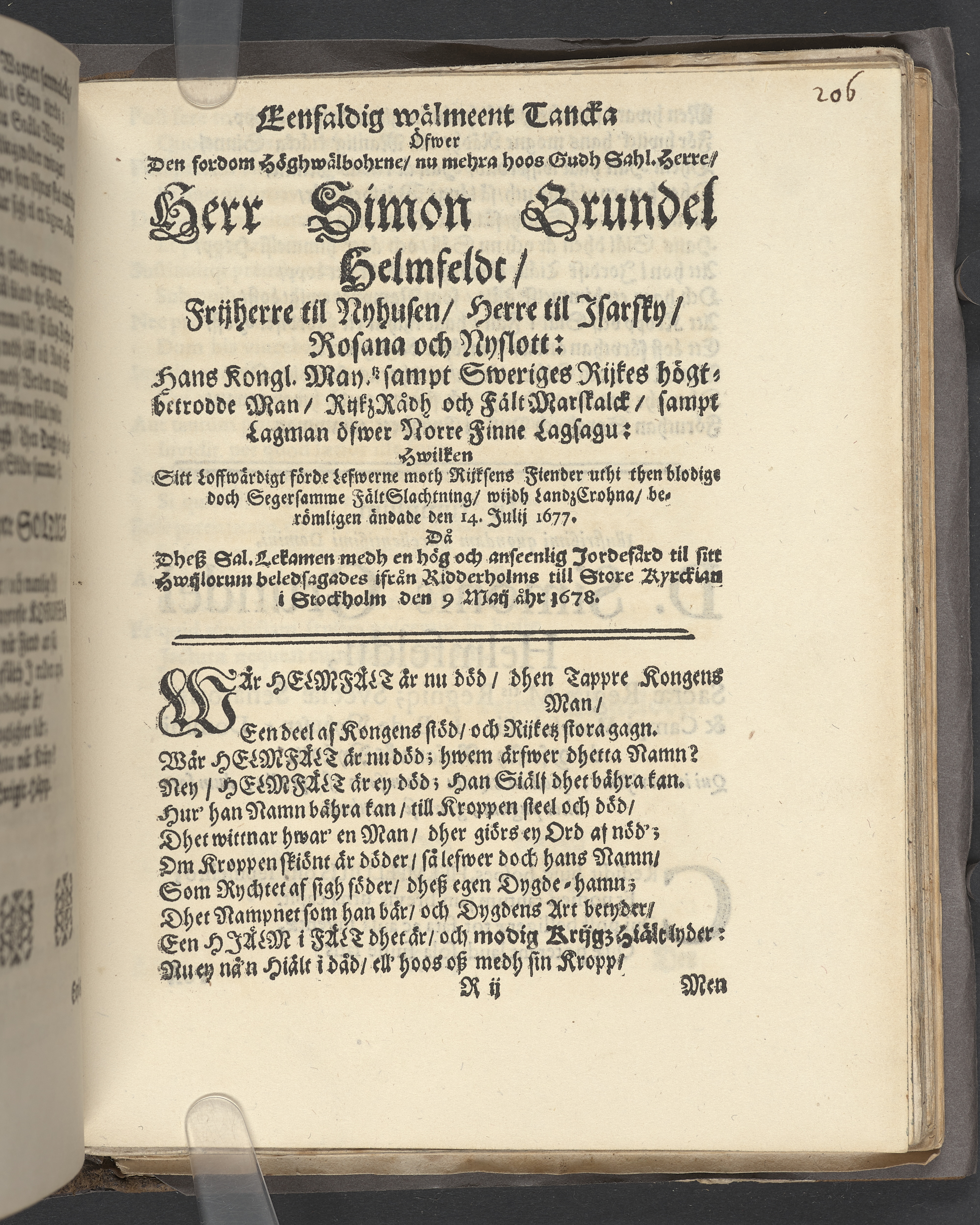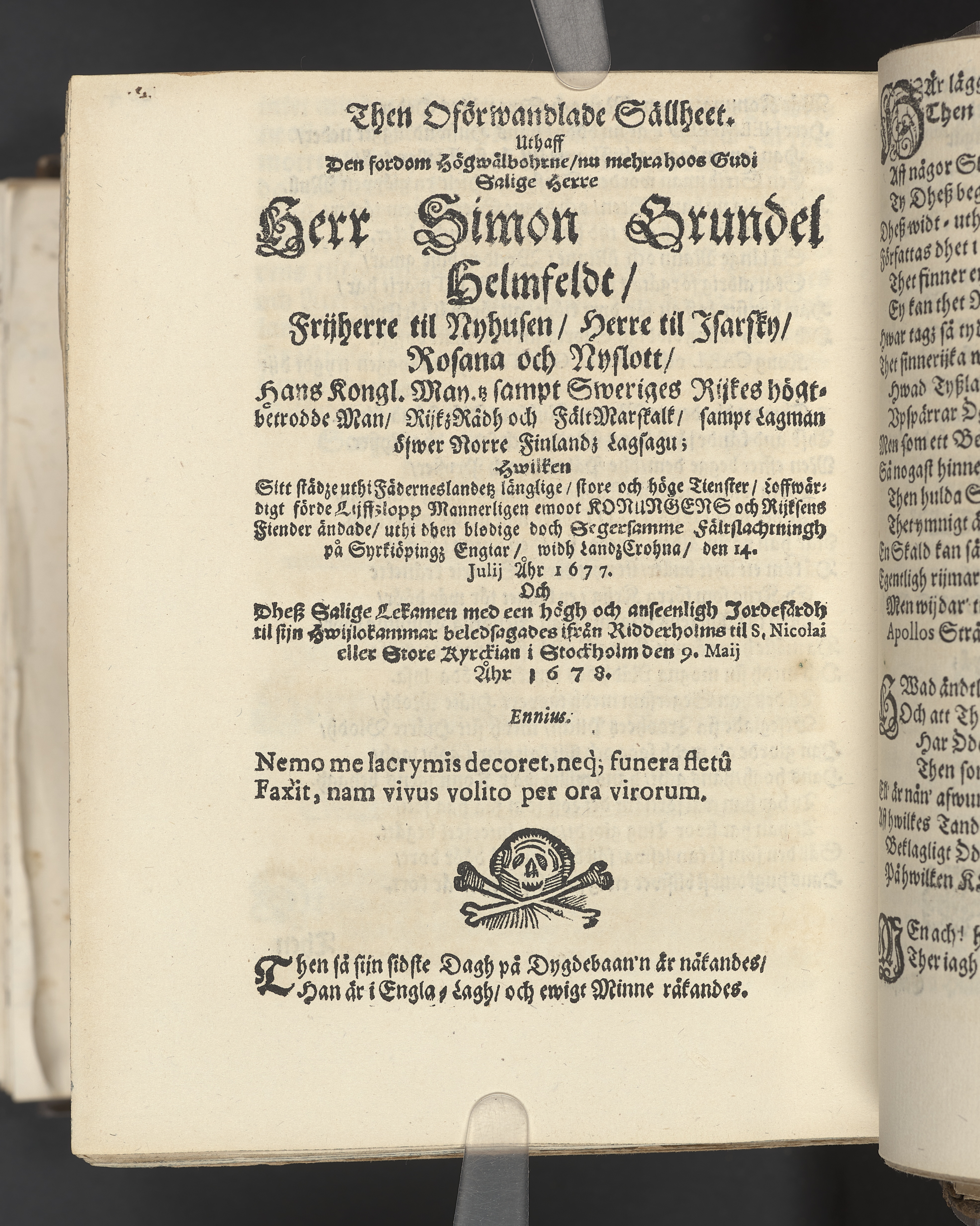 Christeligh lijk-predikan öfwer then högwälborne Herre, herr Simon Grundel Helmfeldt, frijherre til Nyhusen ... Swerikes rijkes ... rådh och feldtmarskalk, så och lagman öfwer Norre Finne lagsagu, hwilken, uthi then hårda trefning ... widh LandzCrona i Skåne then 14 Julij ... sitt ... lijff ... saligen endade: Hållen ... tå hans salige lekamen ... bleff ... infördh til sin hwijlokammar i kongl. residentz staden, Stockholms store kyrckia den 9. Maji 1678. Aff Olao Swebilio, past. Holm. prim. & consist. praes. Tryckt i Stockholm aff Johann Georg Eberdt.