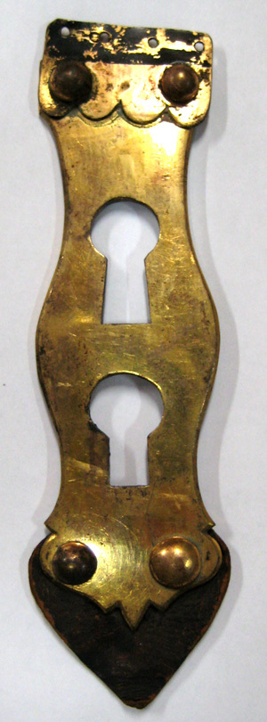Avlångt balusterformigt spänne av blankpolerad mässingsplåt. Upptill mässingsbleck med konturerad nederkant, fäst med två kullriga nitar. Nertill är spännet flikigt och ytterst är en spetsigt tillklippt läderbit fäst med två kullriga nitar. I mitten två nyckelhålsformiga hål.