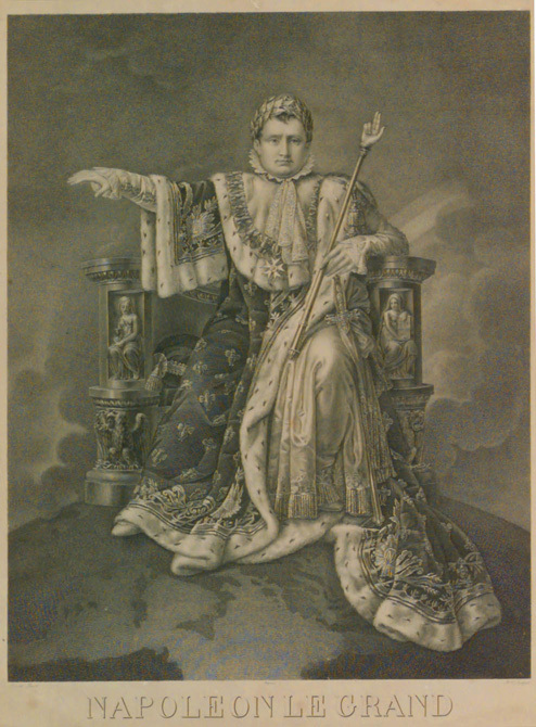 Helfigur , sittande. En face. Höger arm utsträckt något åt höger. Vänster hand håller en spira , som i toppen är formad till en hand. Hermelinsmantel. Lagerkrans på huvudet. Inskrift: "NAPOLEON LE GRAND". Signerad: "David Pinxit. Depose": "B.C. Sculpcit". Förgylld ram med kejsarkrona, 3342:3, på kudde och pastellornament. Ramlistens bredd 95 mm.