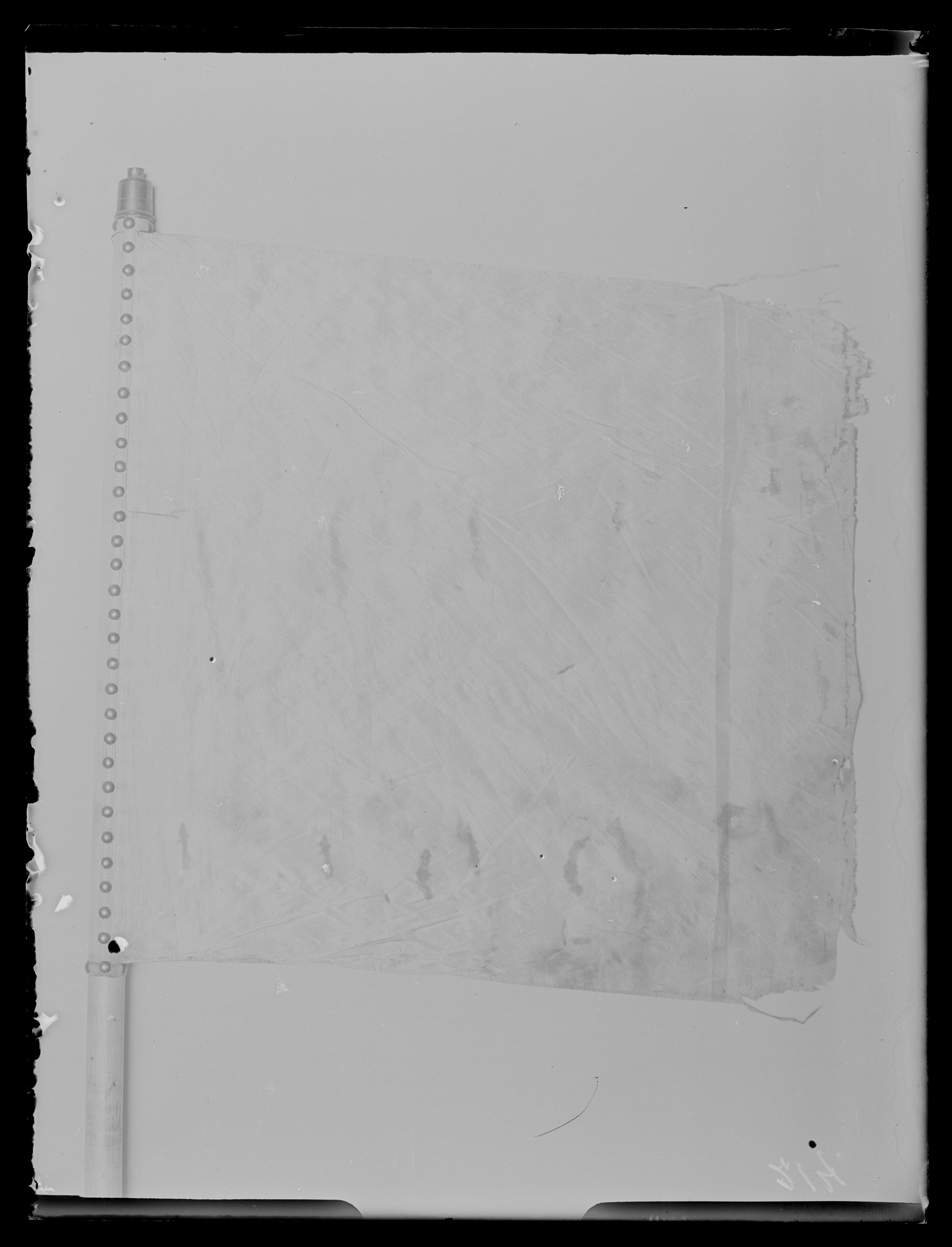 Duk av vit sidentaft. Utan dekor. Duken fäst vid stången med 1 rad tennlickor på mönstervävt band. Stång, vitmålad, jämntjock. På 70 mm resp. 14 mm från nedre ändan mätt är läderremmar instuckna i stången, den övre formad till en 310 mm lång ögla, och den nedre bestående av en brun tamp,540 mm lång. Märkning: etikett på stången: "No 96. Enligt Kungl.Krigs C[ollegei] annordning af d.24 Septemb(er) 1840 är emottagen en sqvadron Fahna af siden och Holk utan spet.".