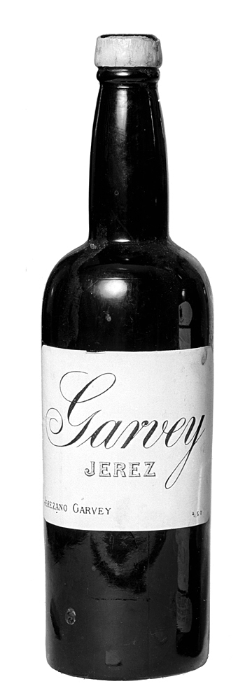 GARVEY JEREZ, firman Jerezano Garvey, två helbuteljer Av mörkbrunt glas. Cylindriska, med kupigt indragen skuldra och svagt spolformig hals med en bred och en smal stärkring; bottnen konisk, högt uppskjutande. Etikett vit med text i svart. Kapsylfragment av ljusgrå hartsmassa. Höjd: 29,4 cm.; diameter: 8 cm.