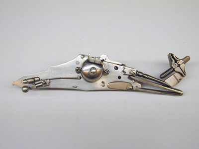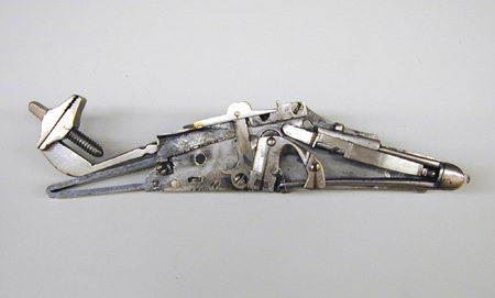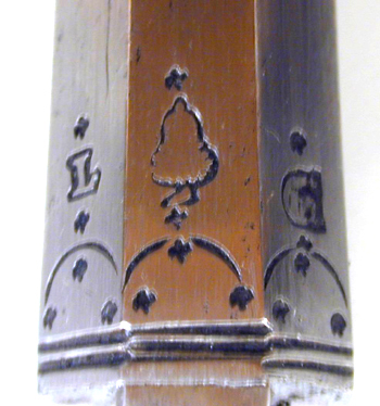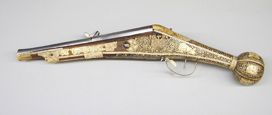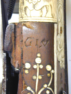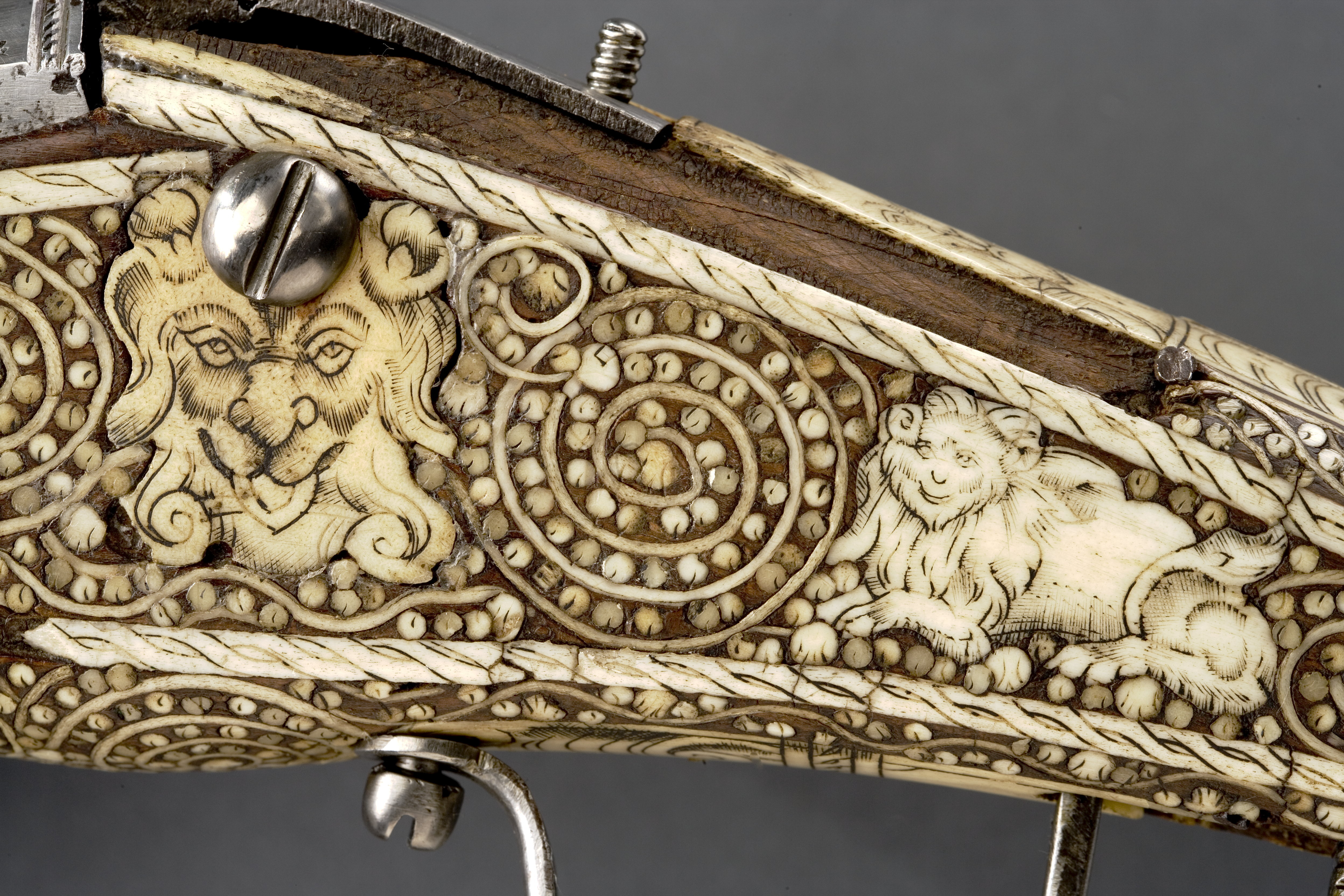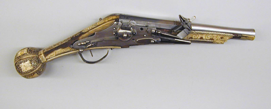 Rund, slätborrad pipa av stål med trumf, graverad linje vid mynningen. Åttsidig kammare med ringar samt båg-och stjärnpunsningar i båda ändar. Vid pipbasen stämplar: på mittfasen ekollon, till v L, till h G (LRK vägl.1921:227-229, jfr Stöckelnr 7555). Rektangulärt, kraftigt böjt svansskruvblad. Fästning: Två häften. Pipan fäst med krysskruv underifrån (varbygelns skruv) samt två pipstift av trä. Hjullås av stål, tysk typ med plant låsbleck. Utvändigt hjul fäst med hög, välvd hjulkapsel, ej täckande hjulets sidor, skruvar kl. 3 och 9. Fängpanna med streckdekor, låg rak krutskärm. Fängpannelock med rörlig arm, grepp med spetsig ände, tryckknappen saknas. Hane med smal, baktill balusterformig kropp, bred, fyrsidig hals med böjd framsida. Rektangulära käkar med rundade fasningar och punsad dekor på utsidan, underkäken lös, käkskruv med fyrsidigt huvud. Hanfjäder med delvis rundade kanter, stort, plattfjäderlöv med fasade kanter, ingen studel. Säkring: Virvelsäkring med kulformigt grepp. Fästning: Två låsskruvar. Avtryckare: Rak avtryckare. Helstock av trä, till stor del täckt med graverade beninläggningar. Rak, i vinkel mot pipan böjd, bakåt avsmalnande kolv med stor, rund kolvkula, d: ca 70 mm, centrumplatta med manshuvud, profil h, morion, kantfläta. På kolvkulans sidor sex fält åtskilda av flätband, i fälten punkter, spiralslingor samt lejonmasker. På resten av kolven kantlister med flätband, båglister och punkter, på kolvryggen och undersidan samt vid låset lister med rullverksdekor, vid svansskruvbladet plattor med rullverk och masker. Vid främre låsskruven en rund platta med en fembladig blomma, vid den bakre en lejonmask, därbakom ett liggande lejon. På laddstocksrännans kanter två flätlister, baktill en platta med lejonmask. Näsband och överrörka med streckdekor. Bandformig varbygel av stål, framänden fäst med krysskruven, bakänden inskruvad i kolven.