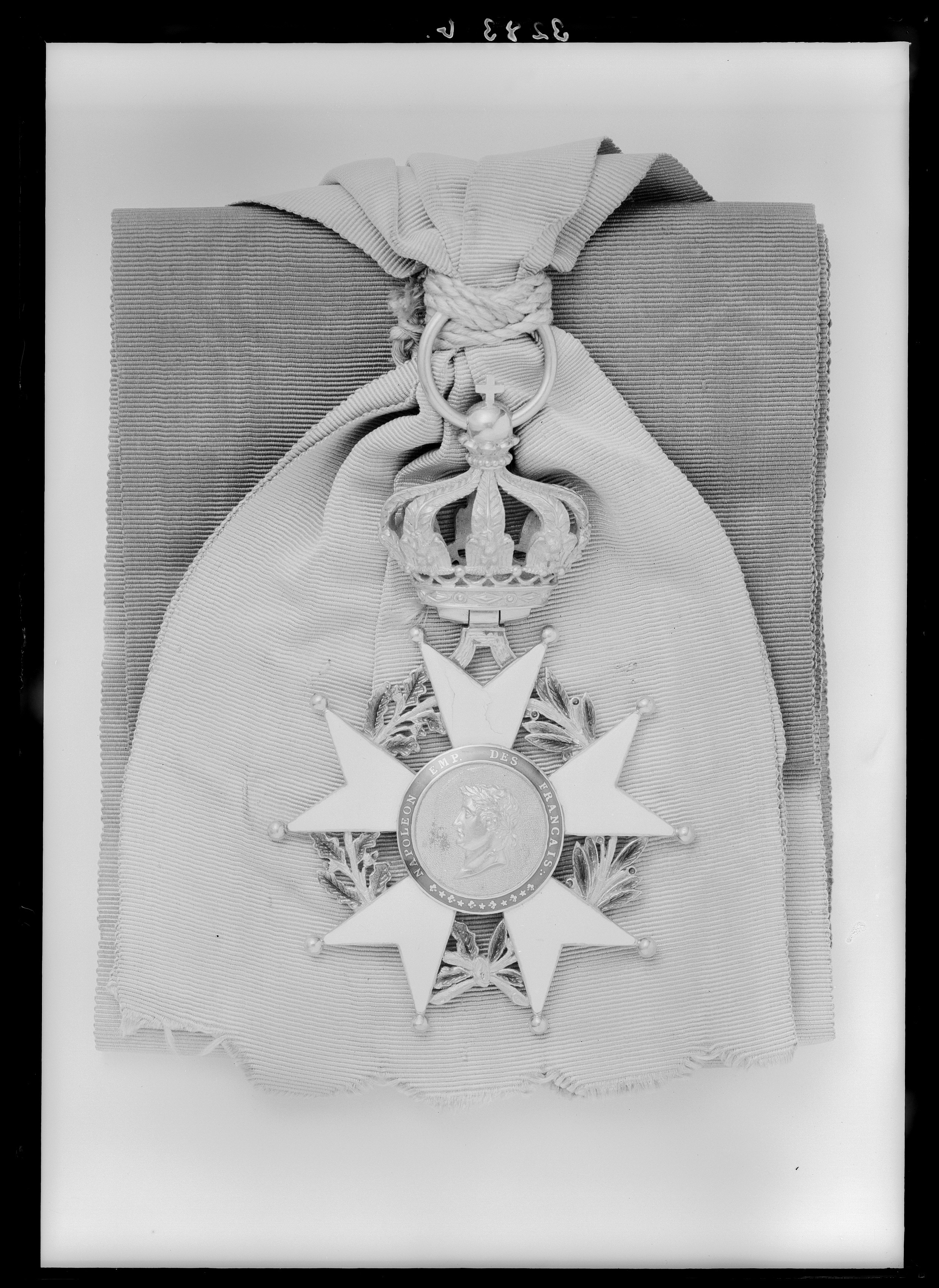 Femarmad, vitemaljerad stjärna av guld med kluvna armar, kulor på spetsarna. Mellan korsarmarna en grönemaljerad ek-och lagerkrans. Välvd medaljong av guld, därpå i relief mot punsad bakggrund et porträtt av kejsar Napoleon I, halsbild, profil v, lagerkrans om håret. Runtom en ring täckt med mörkblå emalj, däri guldtext: "NAPOLEON.EMP.DES FRANCAIS", nertill ornament med fem stjärnor och fem blad. Frånsidans medaljong av guld, därpå i relief den franska kejsarörnen med blixtknippe i klorna, däromkring blåemaljerad ring med guldtext: "HONNEUR ET PATRIE", nertill ornament som på åtsidan. Mellan den övre strålens spetsar en ursprungligen rödemaljerad bygel av guld. Däri fäst med scharnér den franska kejsarkronan av guld, igenom äpplet draget en bandring av guld.