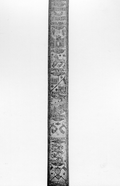 Fäste av förgyllt stål. Knapp omvänt päronformig med hög, något konisk nitknapp. Parerstänger raka, platta, något vidgade i ändarna samt med en låg, mittgående ås. Kavel lindad med tvinnad mässingstråd av fyra olika tjocklekar, upptill och nedtill enkrans av tvinnad mässingstråd. Klinga rak, tvåeggad, flackslipad med rundad ytterände och med etsad ornering i hela sin längd på båda sidor. På ena sidan närmast fästet text: "CONCORDIA RES PAR // VAE CRESCUNT DISCOR // DIA MAGNAE DILABUNTUR" (Genom endräkt växer små ting, genom tvedräkt förstörs stora). Därovanför två kanoner i lavetter, oval ram, innehållande krona, äpple, spira och svärd. I ramen text: "CHRISTUS REFUGIUM SVORUM" (Kristus deras tillflykt). Därefter: "CHRISTINA AUGUSTA SVECORUM GOTHORUM ET VANDALORUMQUE REGINA" (Kristina, Sveriges, Götes och Vendes drottning). Därovanför en oval ram inneslutande ett kvinnoporträtt, höftbild, fas höger, frisyr med uppstående kam, stor, vit krage, smalt förkläde. Ovanför porträttet 15 rektangulära fält, vart och ett med ett landskapsvapen och landskapets namn nertill, från fästet: "UPLAND, SÖDERMANLAND, ÖSTERGÖTHLAND, SMÅLAND, WESTEGÖTL., WERMEL., NERIKE, HELSINGL., DALARNA, WESTMANL., GESTRICA, WESTBOTN, ÅNGERMANL., ÖLAND, DAAL". Därovanför en grip utan namn, ovanför denna text: "ARMA CIVITA //TIS ARBOGEN // SIS" (Arboga stads vapen) samt en blomma. På andra sidan vid basen signering: "ME FECIT DAVID KOHL ANNO 1648", stora riksvapnet med Vasa-hjärtvapen, en oval ram inneslutande ett porträtt av Gustav II Adolf, höftbild, fas höger, mustasch och pipskägg, slickat hår, dräkt med nedvikt krage och fältbindel, i h. hand en stav(?). I ramen text: "GUSTAVUS ADOLPHUS DG SVECORUM GOTHORUM ET VANDALORUM REX" (Gustav Adolf med Guds nåde Sveriges Götes och Vendes Konung). Därovanför 15 landskapsvapen som ovan: "STORFORSTAD. FINL., NORRE FINL., SÖDRE FINLA., ESTLAND, CARELEN, INGERMANL., NARFVEN, TAWASTL., KEXHOLM, NYLAND, ÖSTERBOTTEN, ÅLAND, TAVOLAX, LAPLAND, MEDELAP". Därovanför dekor som på andra sidan med Arbogas vapen. Porträtten av drottning Kristina och Gustav II Adolf troligen efter "Der Erneuerte Teutsche Florus", Frankfurt 1647. Gåva genom major C U (Carl Vilhelm?) Nisbeth av friherrinnan Christina Sophia von Post f. von Ungern-Sternberg, Äs, Sörmland.