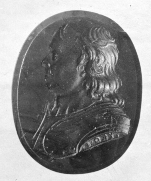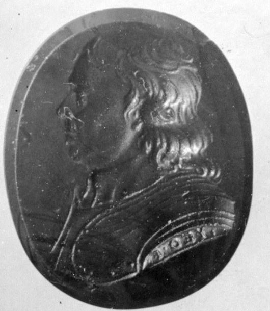 Graverat i oval mörkröd sten med svarta ådringar. Bröstbild, profil v, harnesk, axellångt, hängande hår, signatur i avsnittet (spegelvänd skrift):"YEO F". (Richard Yeo, medaljör i London, 1746-1770 c). Fasade kanter, baksidan plan.